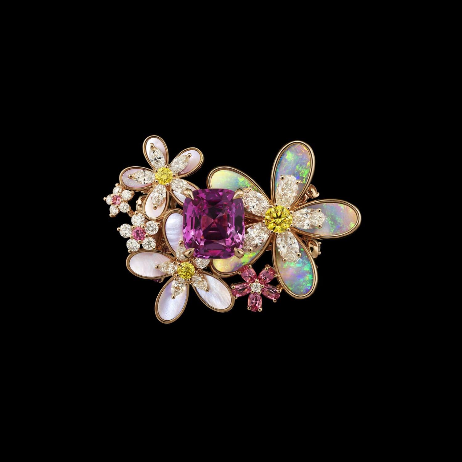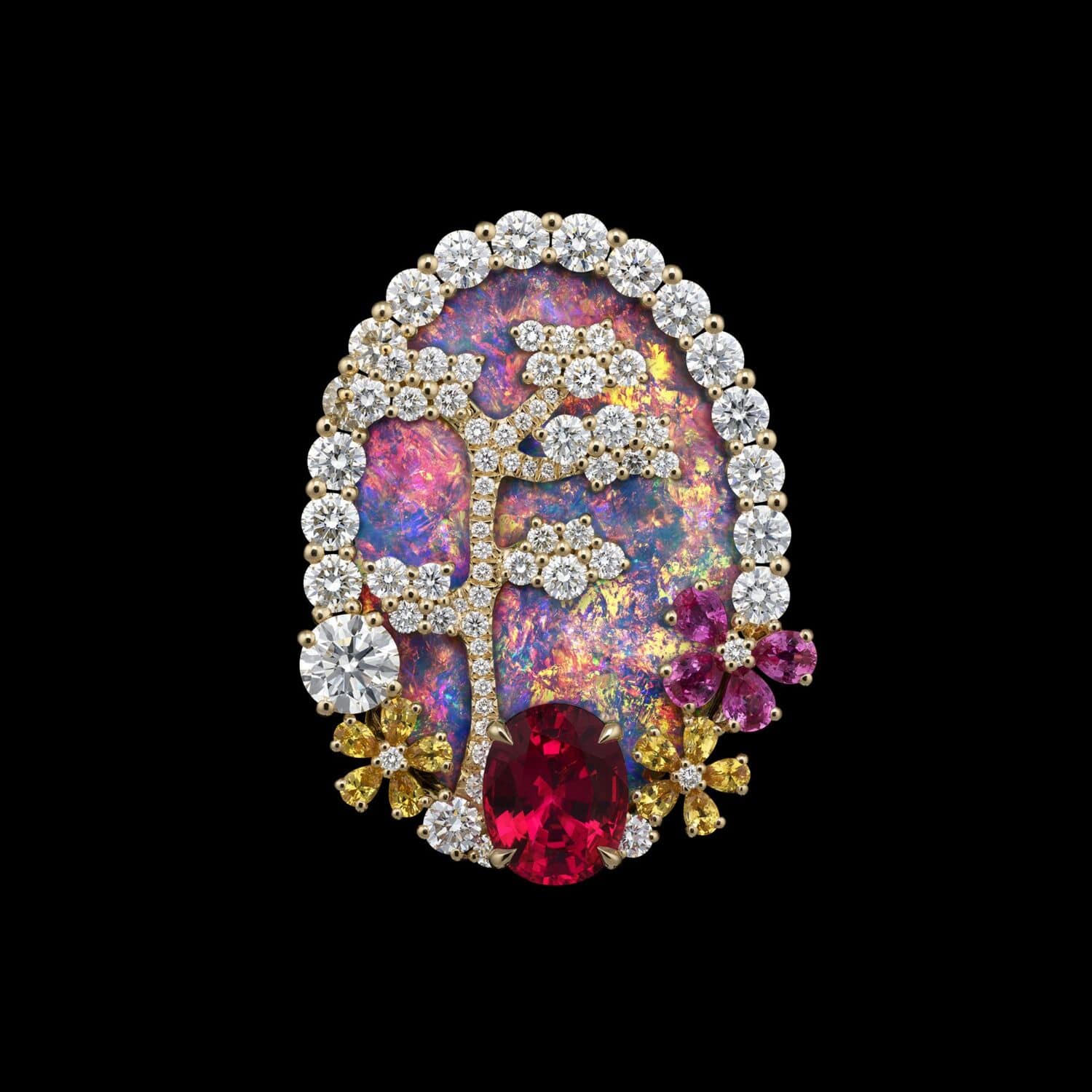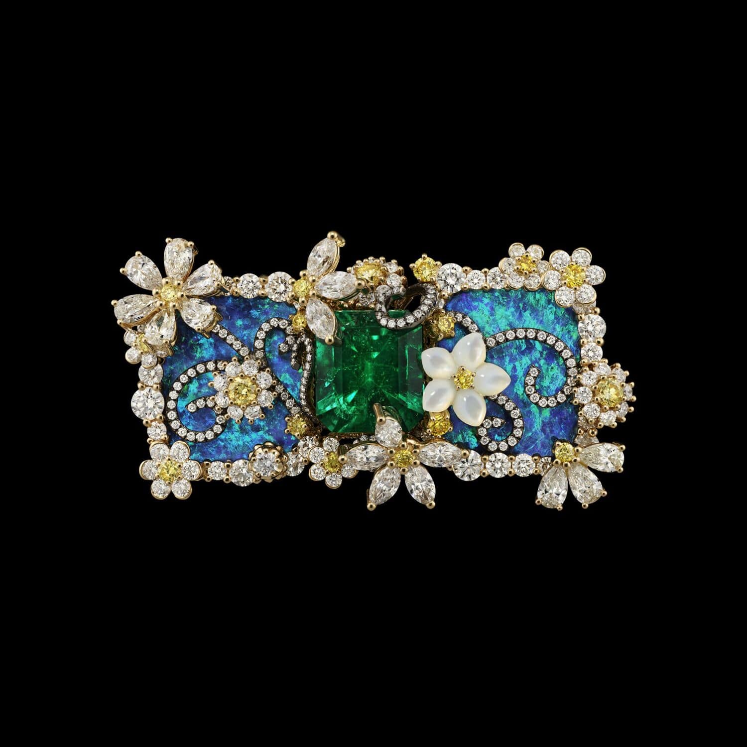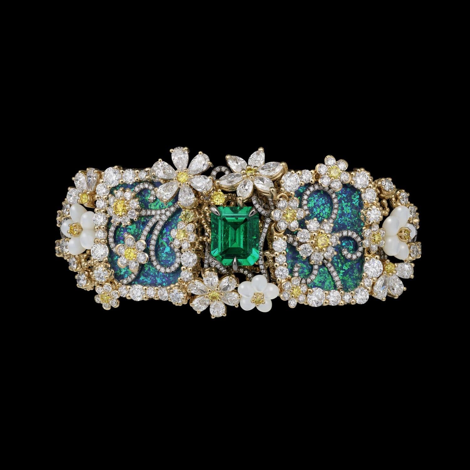 At the heart of the collection lies a bold play of textures and innovative techniques. Opal doublets – where opals are fused with onyx, turquoise or mother-of-pearl – create mesmerising, shifting tones reminiscent of skies or water. The intricate plique-à-jour technique, an ancient artform reimagined through Dior’s signature lacquer, delivers translucent, stained glass-like compositions, especially in the floral motifs.