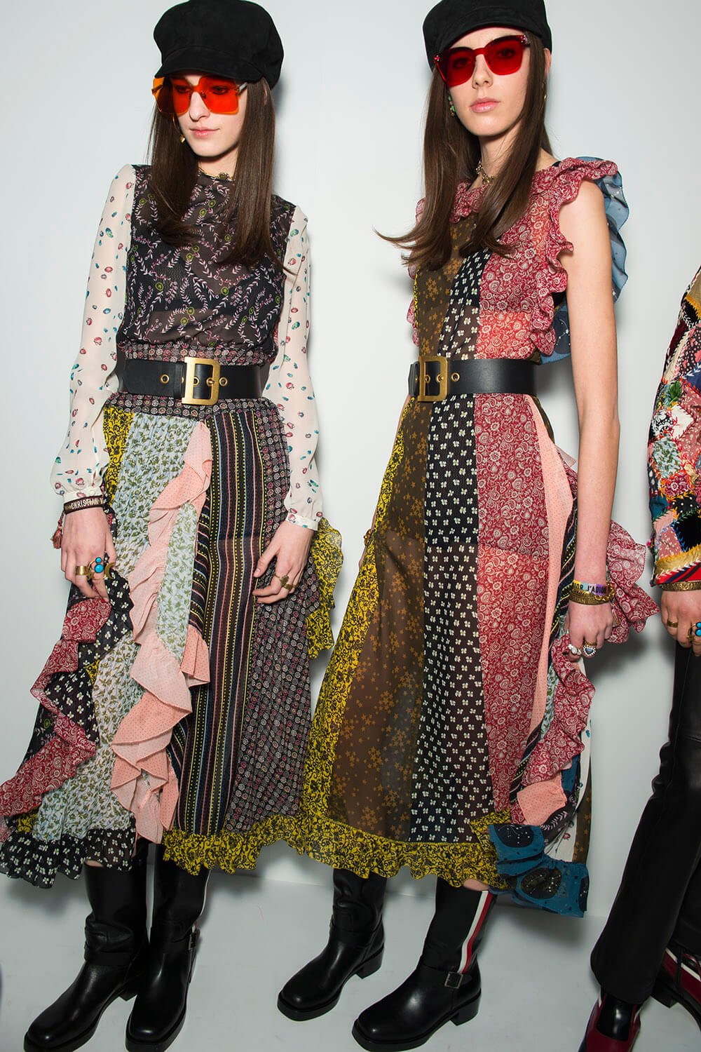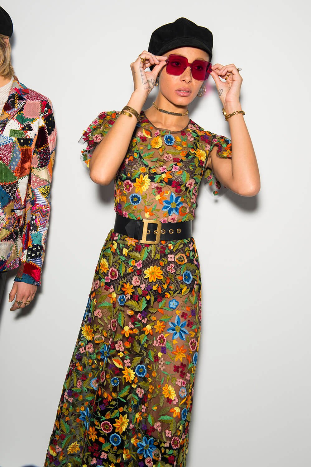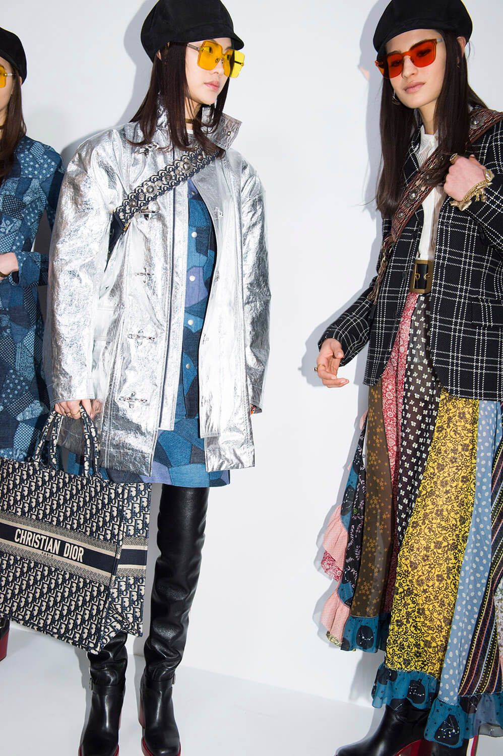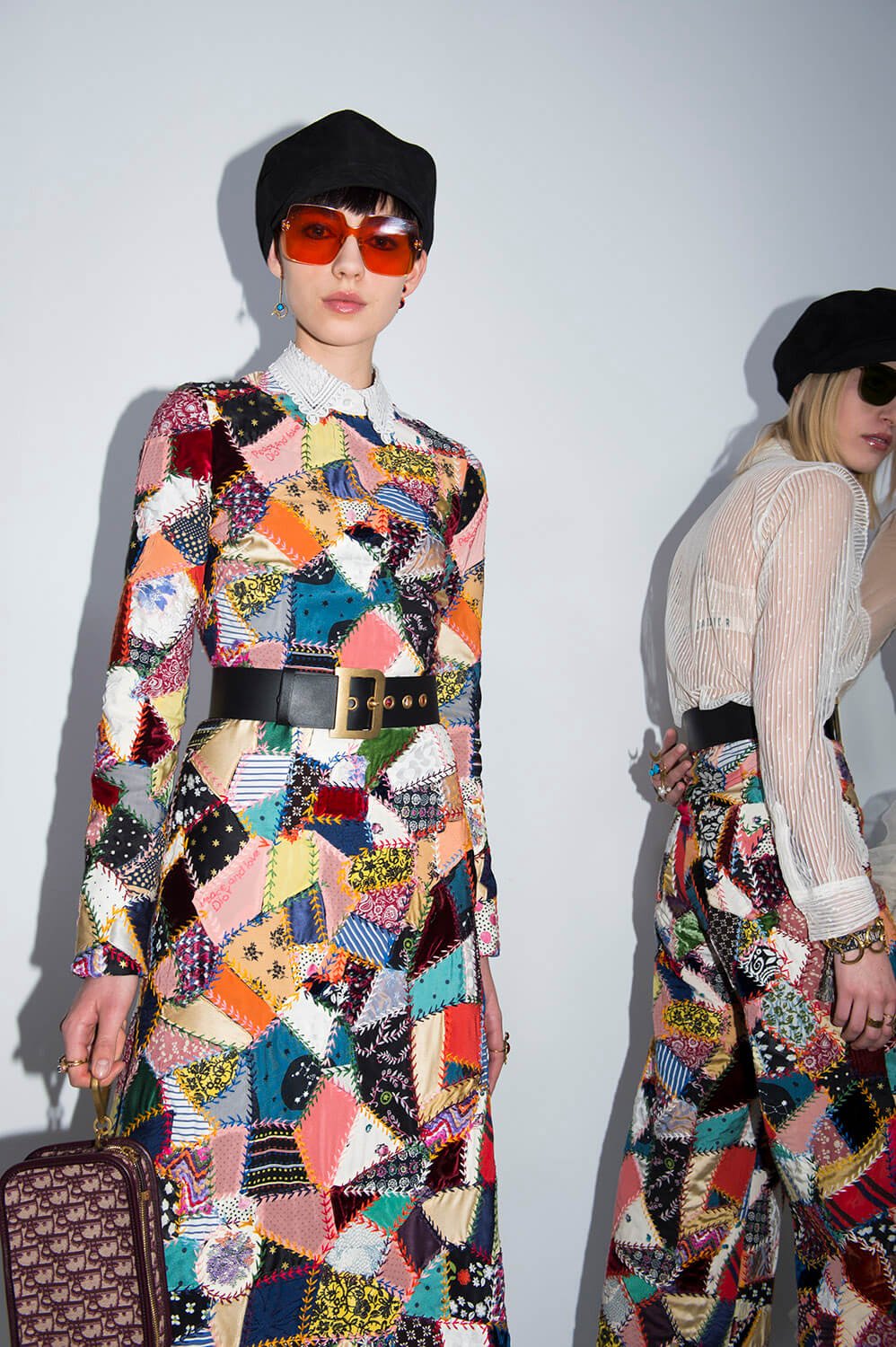 Let’s go, girls. Inside Maria Grazia Chiuri’s Dior vortex we went, an abundance of feminist slogans, protest posters and magazine covers from 1968 covered the walls, floors and ceilings. Trippy feminism. “Women’s rights are human rights,” the walls read and the women walked out in front of the big and bold: “I am a woman.” And so they marched in their Dior uniforms of baker boy caps, checked suits branded with ‘Christian Dior’ and oversized tinted sunglasses. Women on a pursuit. Patchwork was revived on panelled printed chiffon dresses, clogs to match, this was the collection for art school teachers. Knitted jumpers with peace signs were all part of this reinvention of the sartorial revolution of 1968. Sheer chiffon skirts with tiny off kilter ruffles hinted at newness and tapestry Persian rug vibes made up coats. Black leather suits va voomed it on and those big golden D belts filled our logo mania love.