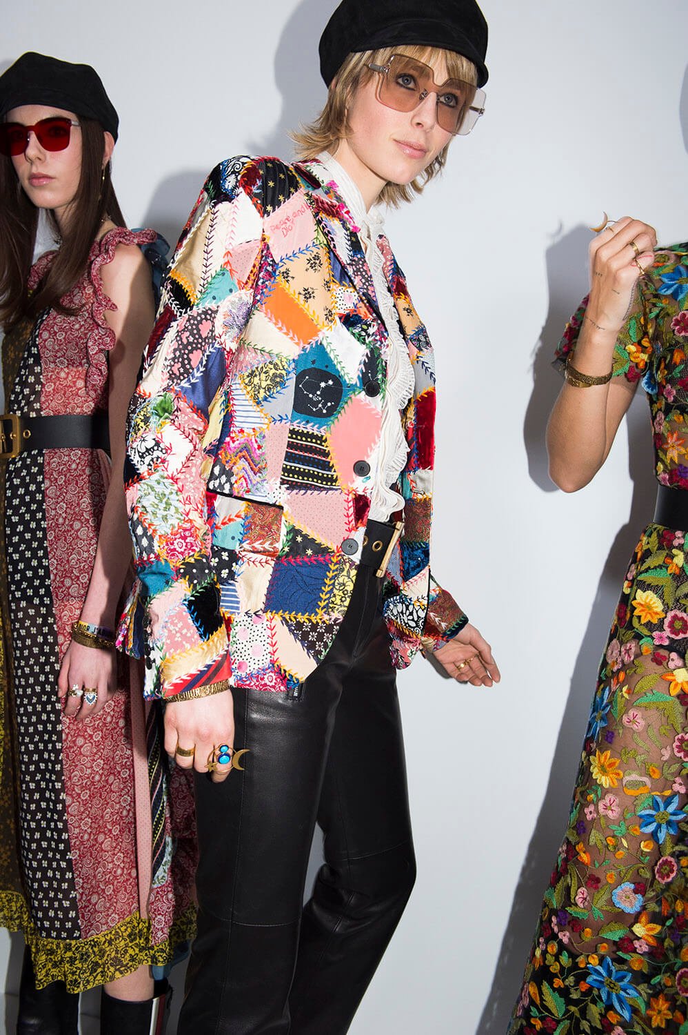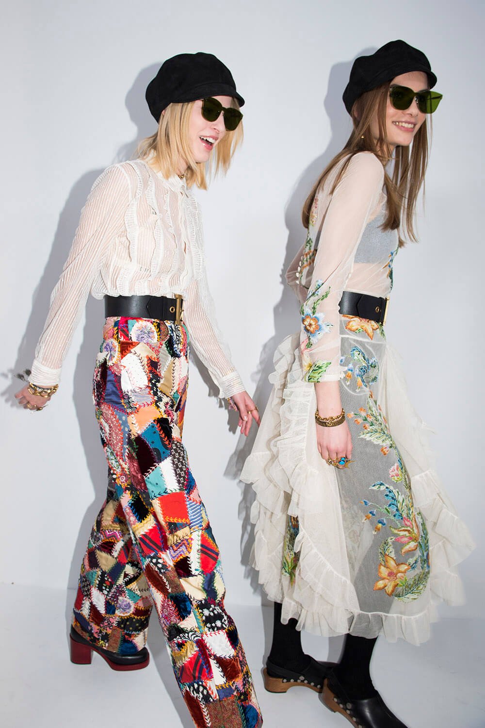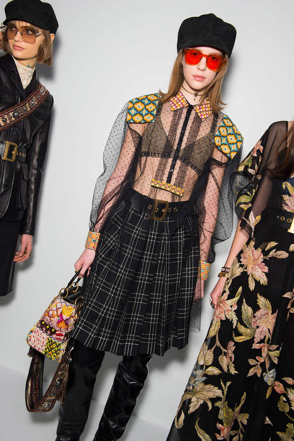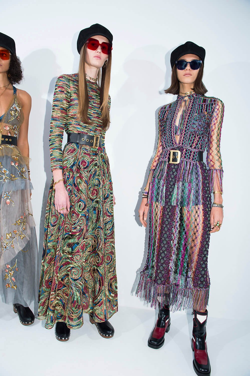 Let’s go, girls. Inside Maria Grazia Chiuri’s Dior vortex we went, an abundance of feminist slogans, protest posters and magazine covers from 1968 covered the walls, floors and ceilings. Trippy feminism. “Women’s rights are human rights,” the walls read and the women walked out in front of the big and bold: “I am a woman.” And so they marched in their Dior uniforms of baker boy caps, checked suits branded with ‘Christian Dior’ and oversized tinted sunglasses. Women on a pursuit. Patchwork was revived on panelled printed chiffon dresses, clogs to match, this was the collection for art school teachers. Knitted jumpers with peace signs were all part of this reinvention of the sartorial revolution of 1968. Sheer chiffon skirts with tiny off kilter ruffles hinted at newness and tapestry Persian rug vibes made up coats. Black leather suits va voomed it on and those big golden D belts filled our logo mania love.