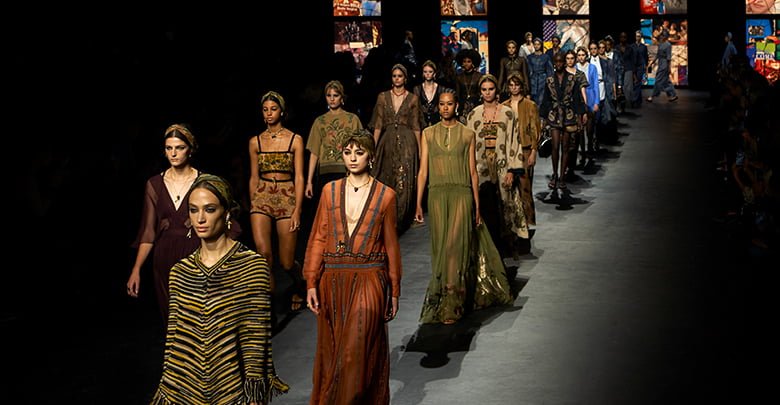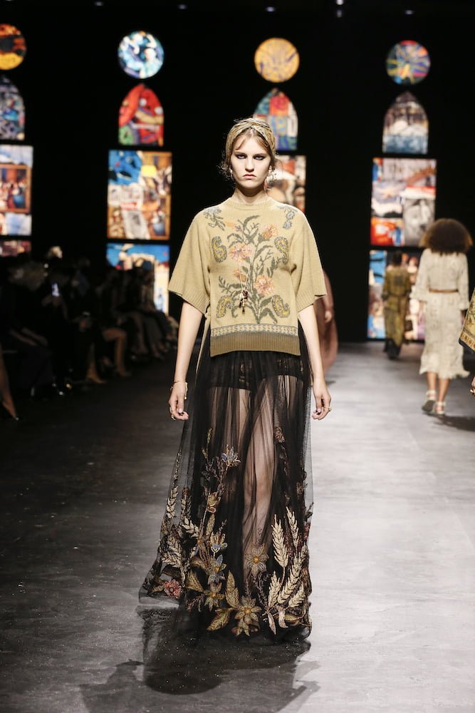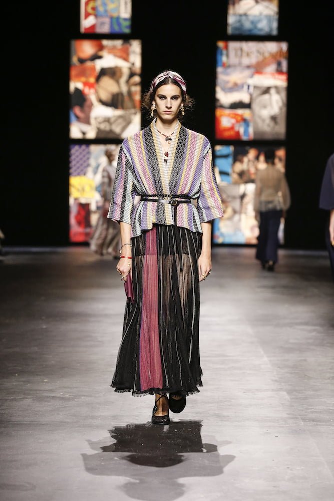 Chiuri name-checked Virginia Wolf and Susan Sontag as an influence, and you could see it in the earthy mix of texture and print. If the daywear erred on a kind of enveloping, but sumptuous practicality, the eveningwear took a more romantic turn with a parade of Chiuri’s chiffon goddess gowns. Sheer and light as clouds, this section of the show played like a dream sequence. As always with her Dior, Chiuri sought to amplify female voices. She did that literally with a live female choir providing the soundtrack. She did it with the clothes – the Ikat prints, used on sporty pop overs and duster coats were produced with female Indonesian artisans.