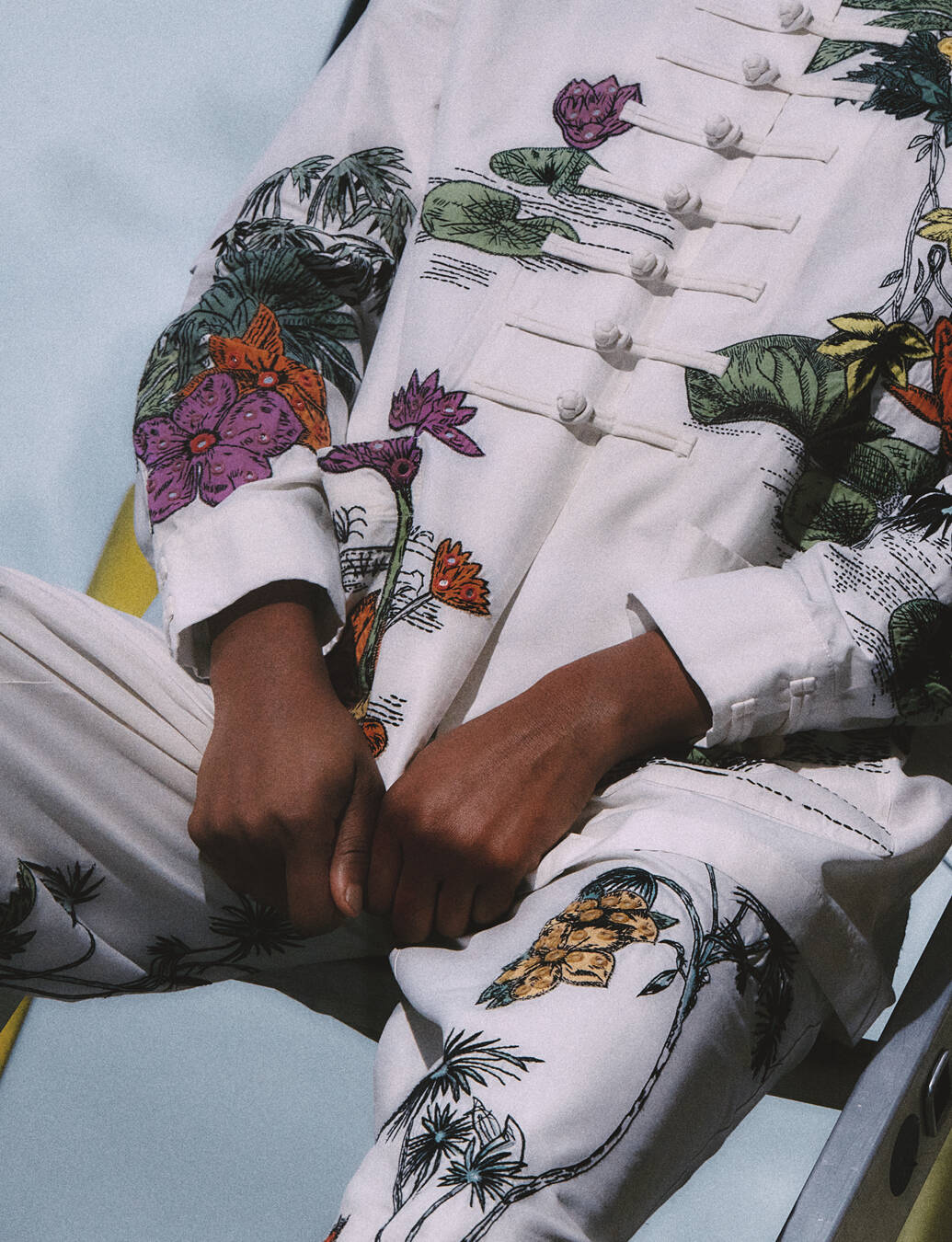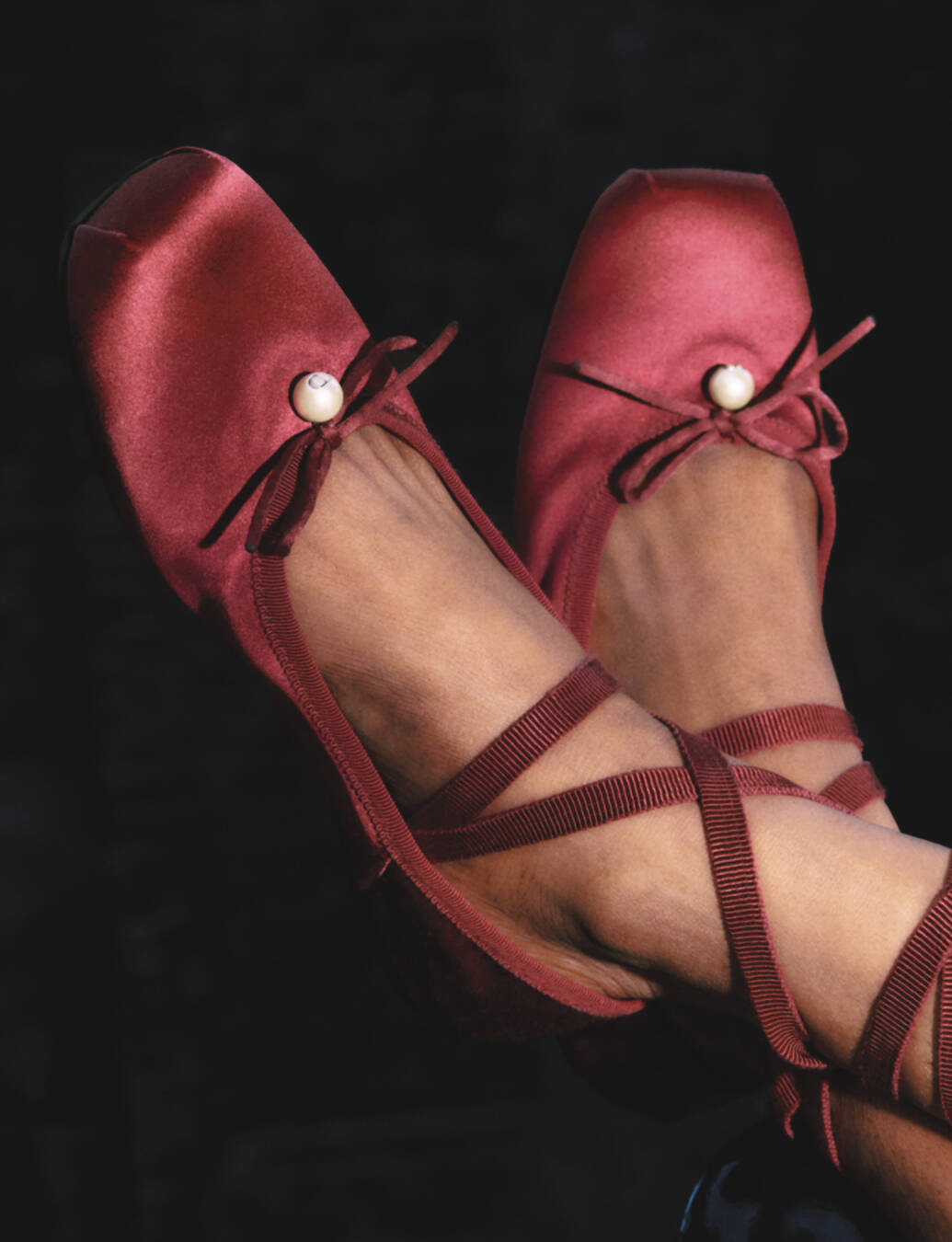 from left: D-Joy ballet shoes by DIOR; embroidered jacket and trousers by DIOR