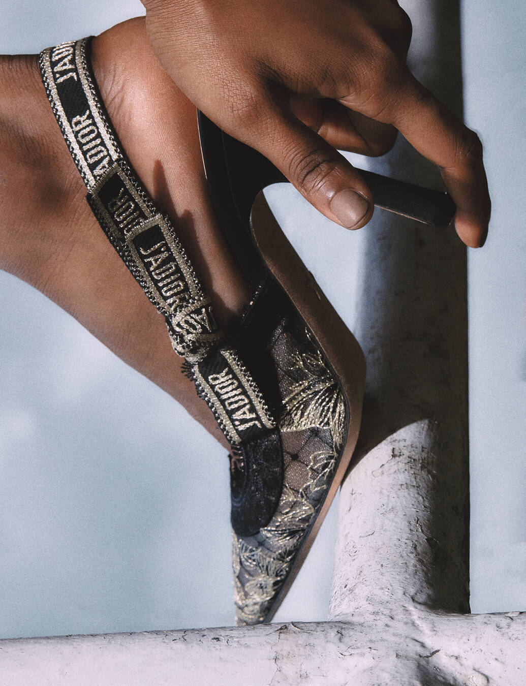 from left: embroidered J’Adior slingback shoes by DIOR; Dior Chez Moi shirt and shorts by DIOR