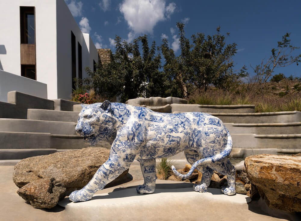 Like something from a fairytale, the walls of each pop-up shop come dressed in Dior’s classic toile de Jouy, like a sheath in the dreamlike setting. As though it were a lush jungle, wild animals emerge – giraffes, tigers, elephants and monkeys come to life as life-size sculptures and reappear throughout the skirts, dresses, shorts, swimwear and accessories on display. You can even scan the Dioriviera packaging to see the iconic motif’s animals begin to animate.
