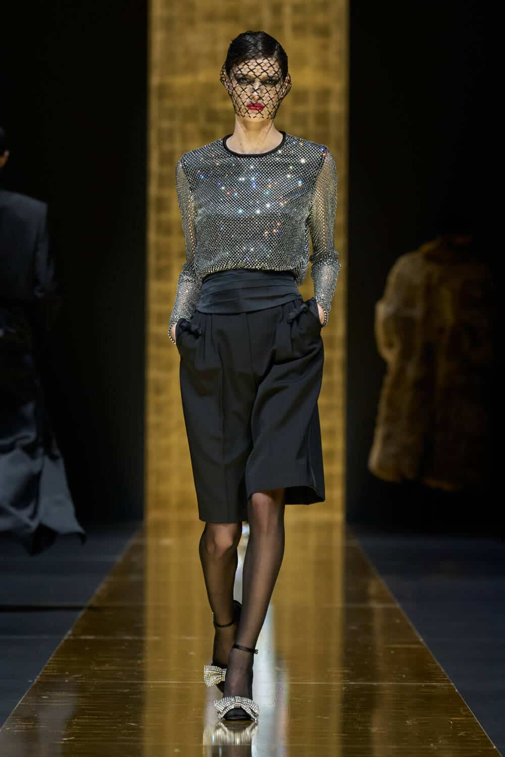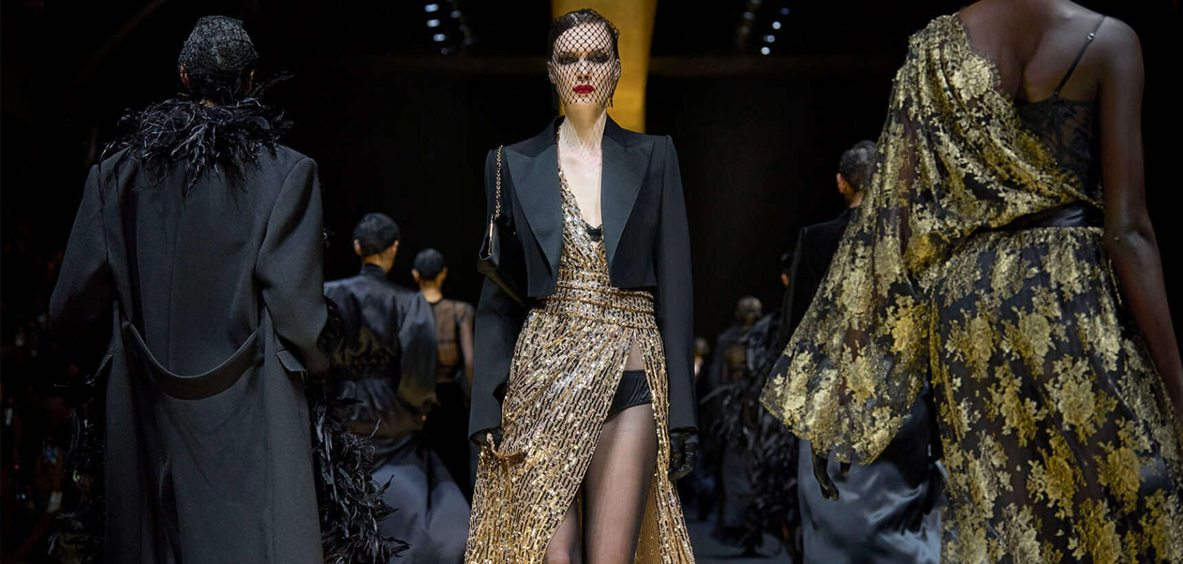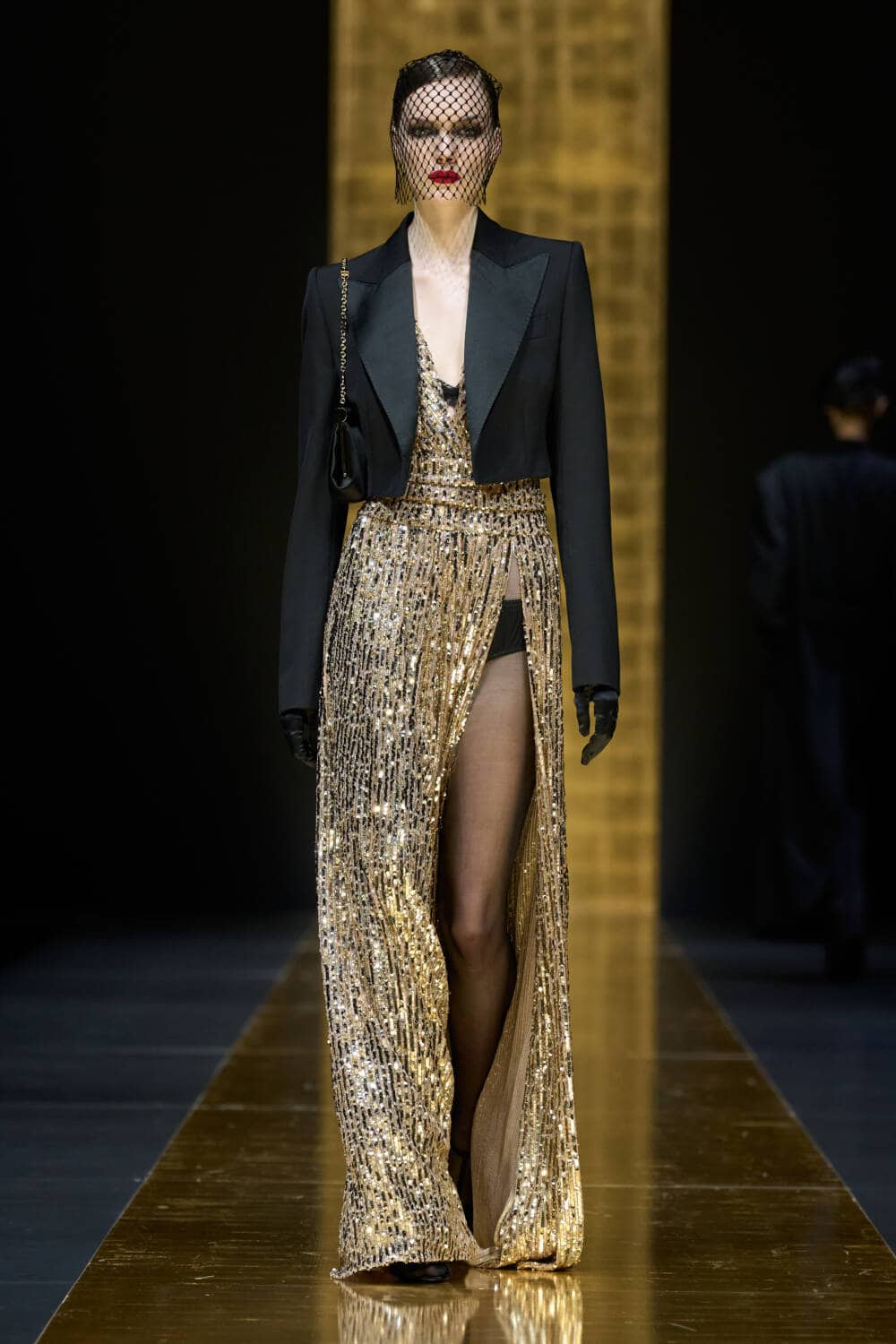 The AW24 collection was dedicated to tuxedo dressing – “To us, designing a tuxedo means offering timeless elegance, deeply rooted in our sartorial culture. It means giving women a classic wardrobe that, escaping from current fashions, allows them to be more self-assured.” The models faces were uniformly veiled, their lips stained red, but each one stepped out in a different tuxedo variation.
