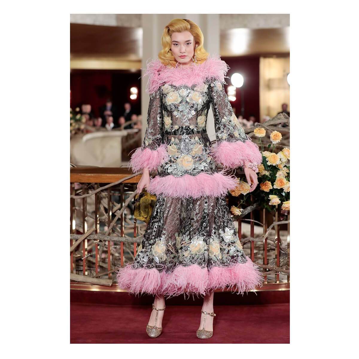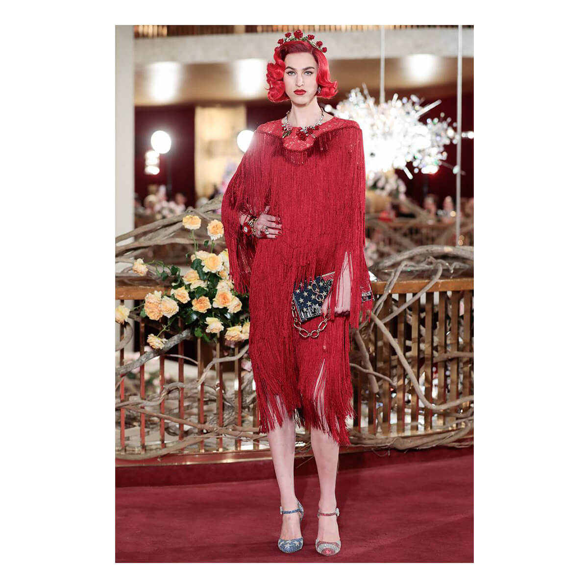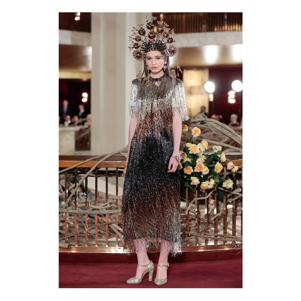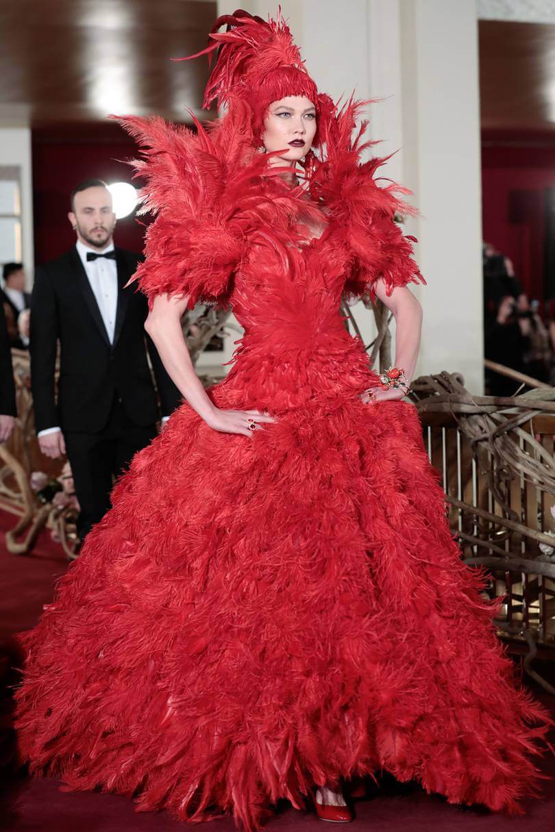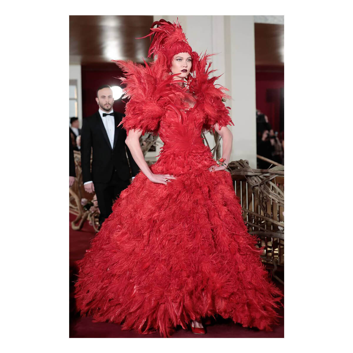 What’s not to love about a Dolce & Gabanna extravaganza? Mr Stefano Gabanna and Domenico Dolce know how to put on a show. This time, it all went down in New York City, the hum and incessant sirens of the city shut out as The Metropolitan Opera was in full D&G mode for the Alta Moda, April 2018 show, dramatic flowers and the sound of a heavenly choir. Well, it was a Sunday. And so the procession began, these women walked that red carpet, slowly, surely and in the most OTT gowns. Ms Karlie Kloss opened the show, turned bird-like – a magical, beautiful, rare one, of course – in the hottest red feathers that sparked from the shoulders and trailed well behind her. It was all about a big, long gown. Take up as much space as possible. Mark that territory.
