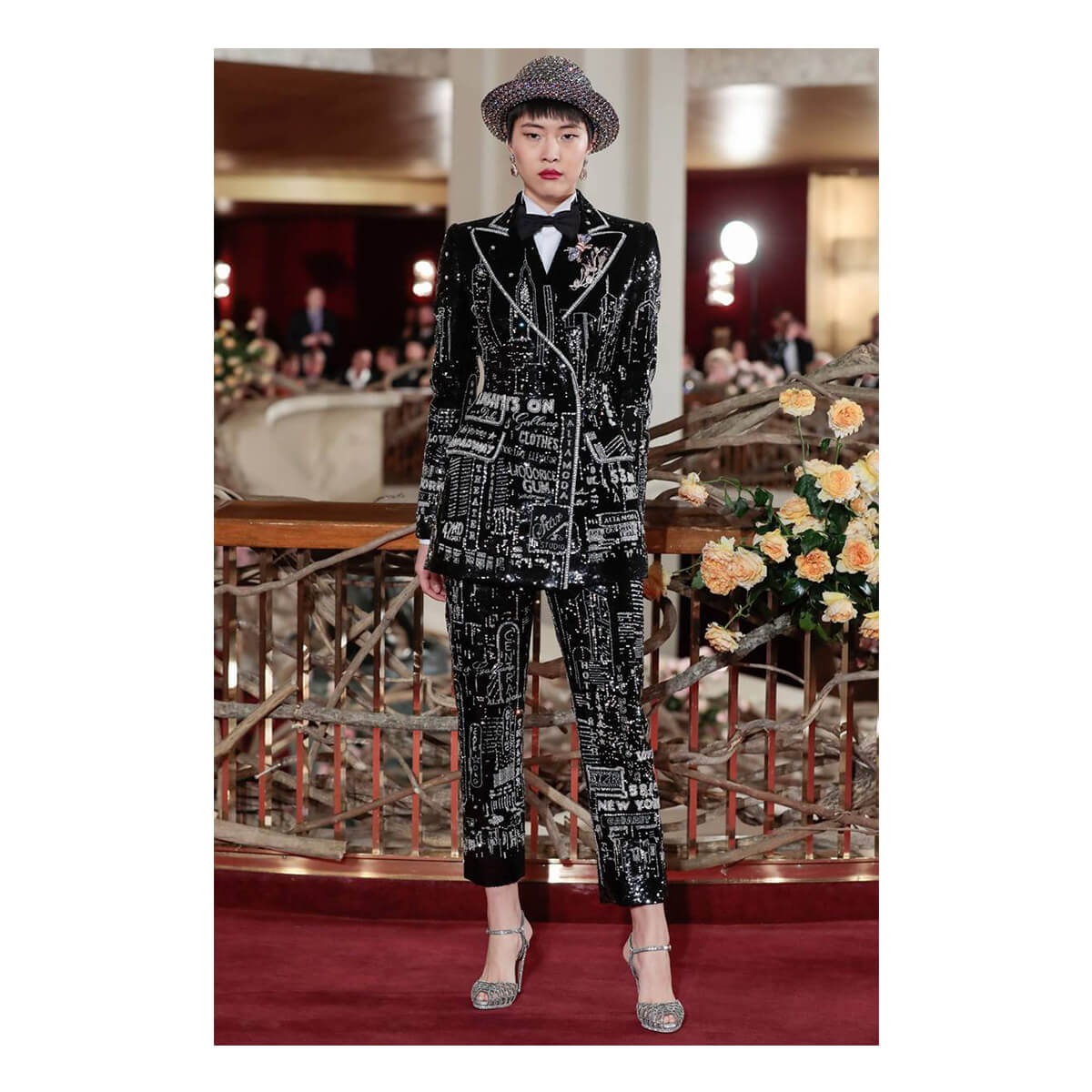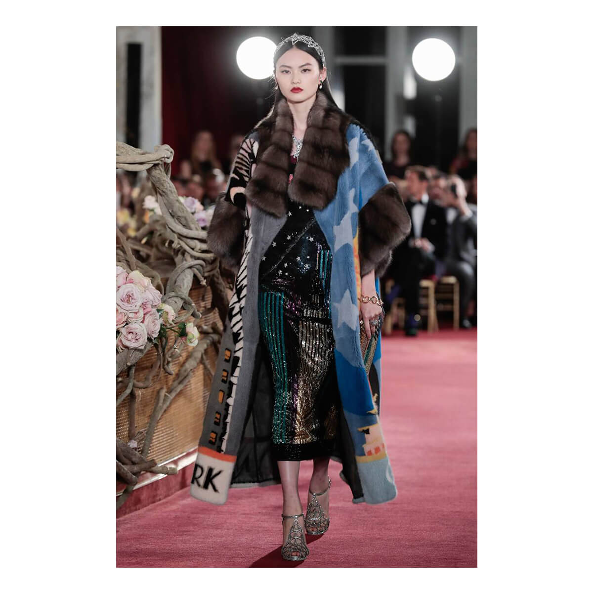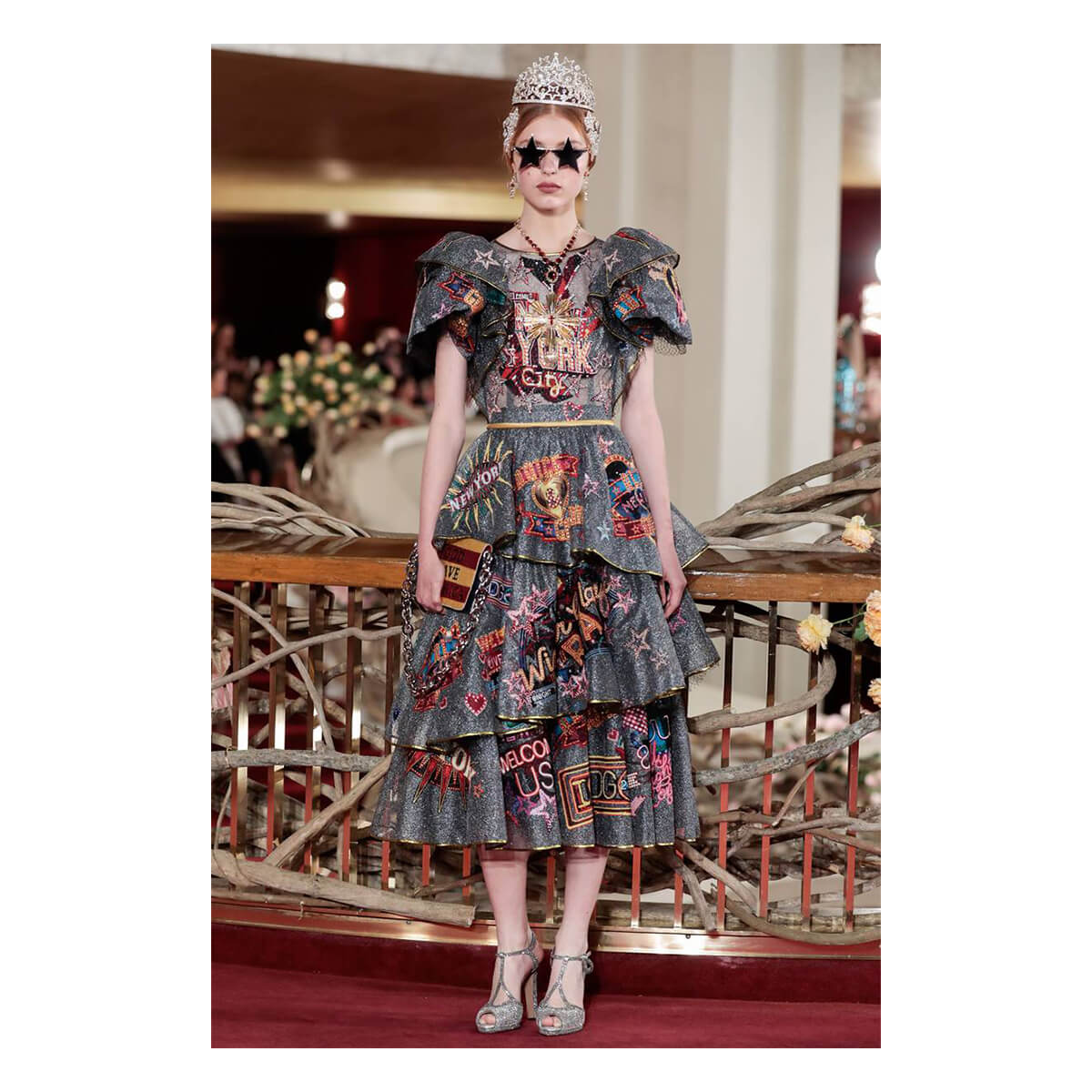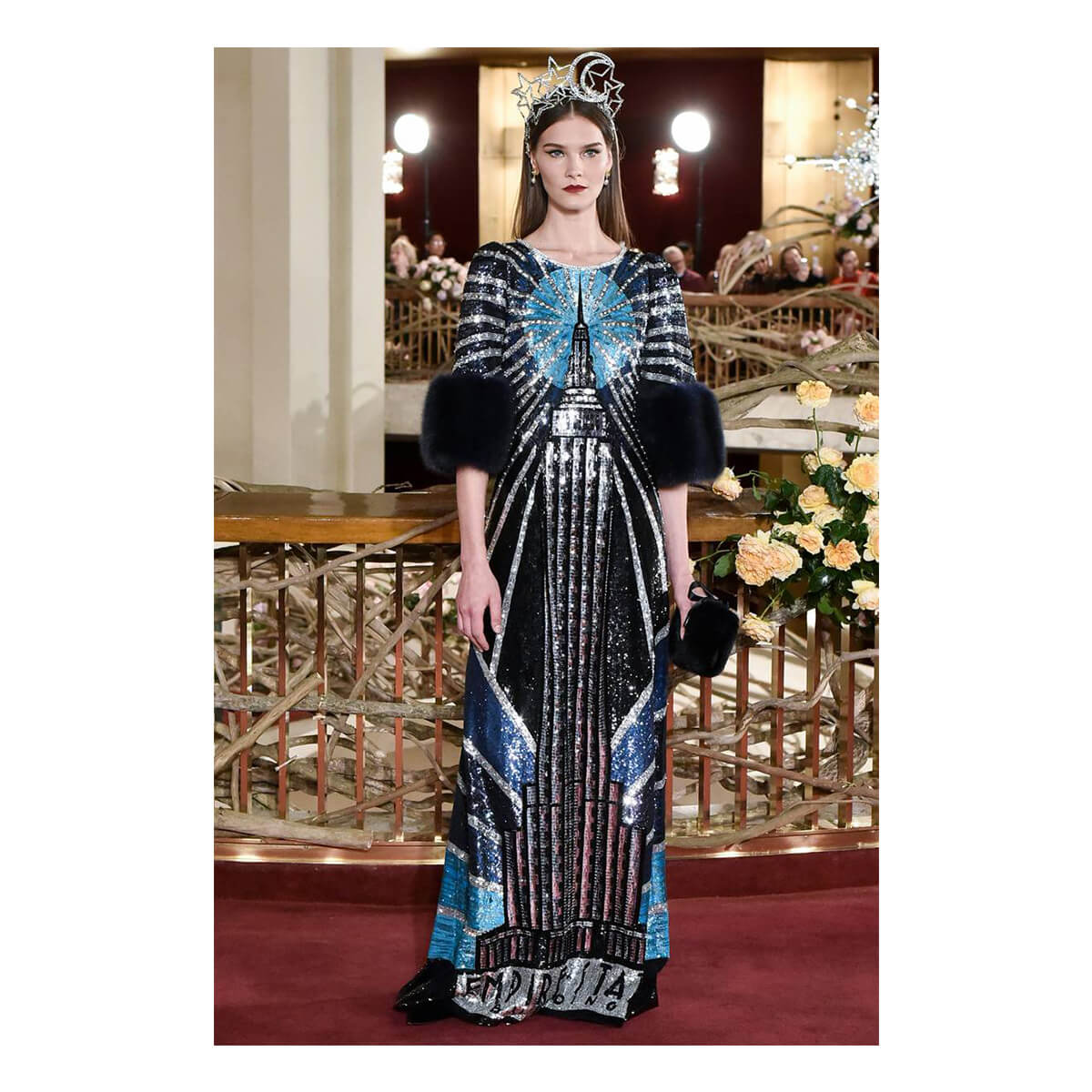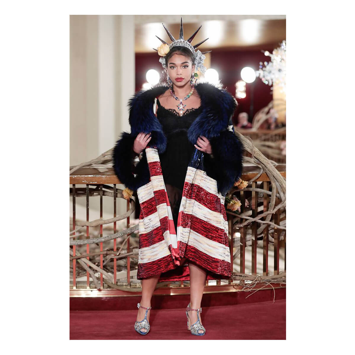 Ms Joan Smalls was similarly corseted, her dress erupting, cascading with a cityscape patchwork and tulle. Princesses of New York in Milan’s finest. Forget Americans in Paris, this was Italians in New York and it felt right, supercharged by the city. NYC’s best landmarks were worked onto gowns and a whole lot of red stripes and blue stars were infused into it all. Headpieces were outrageously theatrical, as they should be, with marabou feathers flouncing, flowers blooming and tiaras glittering. The one and only Queen Naomi Campbell stole the show with a statue of liberty inspired crown. Embellished suits cooled it all down and finely tiered layers of fringing felt rightly boujee before the hint of New York baseball t-shirts that sat smugly underneath fur coats. One dress was embellished to say ‘I love Met Opera NY’. Same. Feeling that fast paced, adrenaline rushing New York City love bug. Dolce & Gabbana know how to take us there in style. Clever move, as the countdown is on until the 2018 MET Ball, with its theme ‘Heavenly Bodies: Fashion and the Catholic Imagination’. We’ll start picking and pairing our fave looks with their rightful celebrities now.