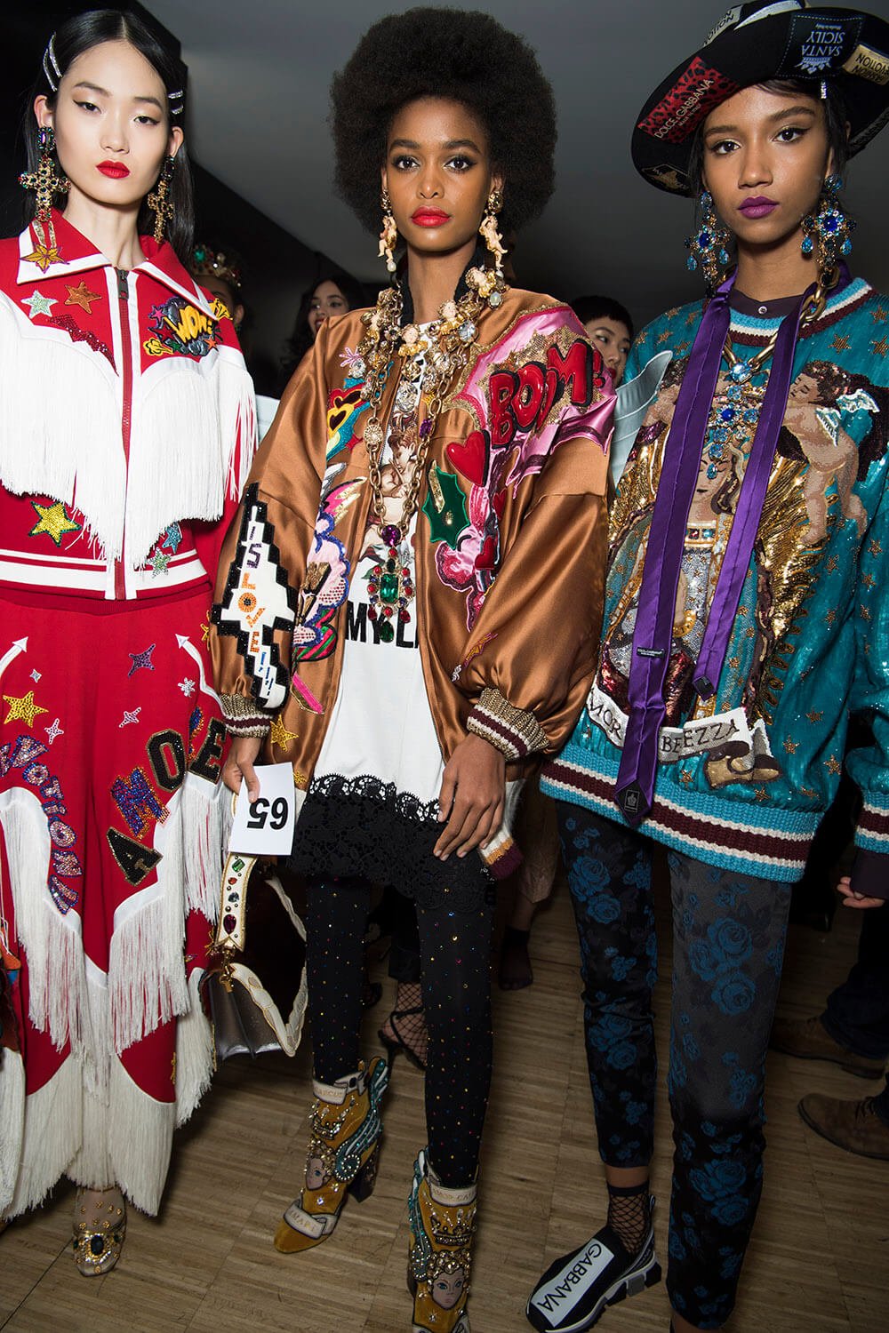 And then they disappeared behind closed doors, Rihanna’s ‘Te Amo’ started up and out came a rich patchwork of slogans, rhinestones and glitter. Classic D&G was blazing in an array of golden opulence, pink velvet was embroidered with tiny flowers, cherubs appliquéd onto the back of coats and lightly tiered printed chiffon swished in bundles of excess. It was lavish, embellished, flamboyant. Fashion on overload. Oh, they were devoted. It never stopped coming, interspersed with little Sicilian black dresses. Red lips erupted, jewels were layered heavy, lusciously, and of course the crowns topped it all off. It was all about fashion being their religion (relatable) and so it felt like an intricate prayer. Devoted to Dolce & Gabbana.