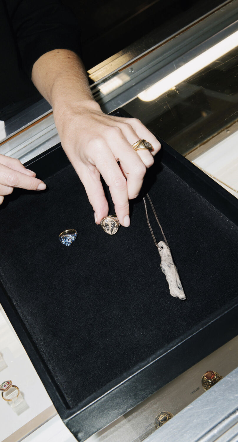 Dover Street Market is beloved by everyone from cult fashion designers to royalty, and stars like A$AP Rocky and Rihanna, who come in after closing to shop, sometimes spend the whole night trying things on and leave as the sun starts to rise. “With a lot of the stores on Bond Street or wherever, there are very heavy doors, even metaphorically speaking,” says Dickon Bowden, vice president of Dover Street Market International, an employee since day one and the man responsible for running the business alongside Adrian Joffe, Kawakubo’s partner in life and work. “I think the fact that we could present [the jewellery] in a more relaxed and informal setting allows customers to discover pieces alongside one another and has a certain democracy to it. A piece from a well-established house might be sitting alongside something that someone made themselves on their kitchen table at home.”