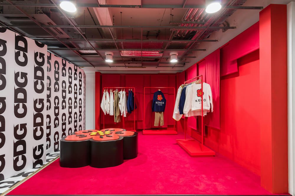 Down under in the basement, you’ll also find the timeless universe of Kenzo, with the space mirroring its flagship stores, but interpreted under the contemporary eye of its new artistic director, Nigo.