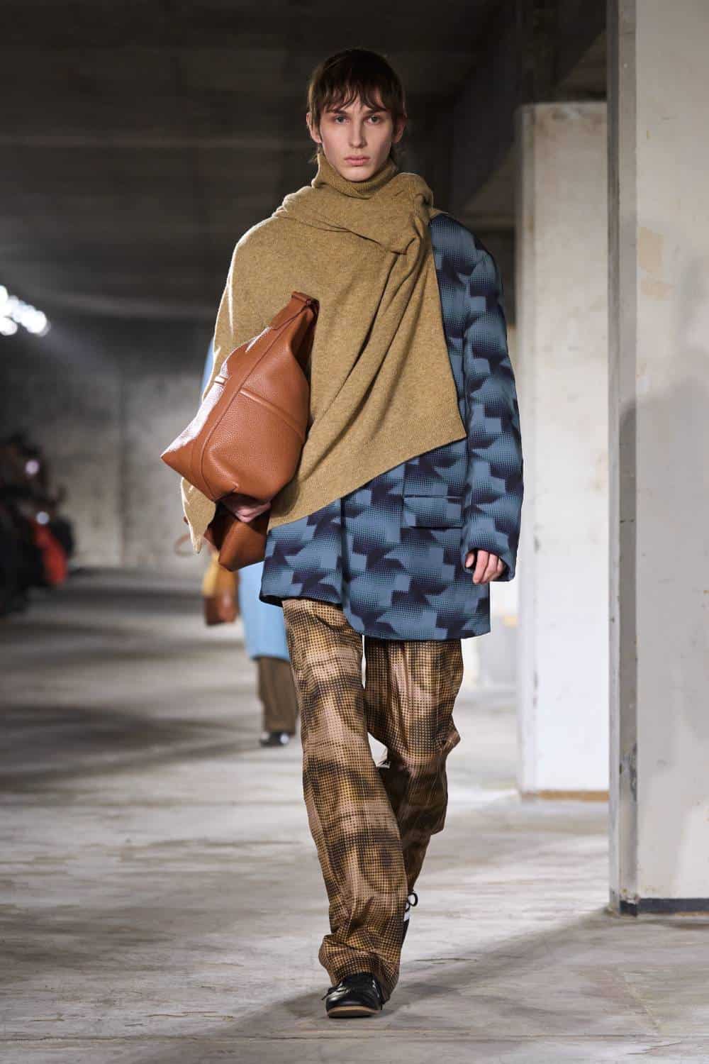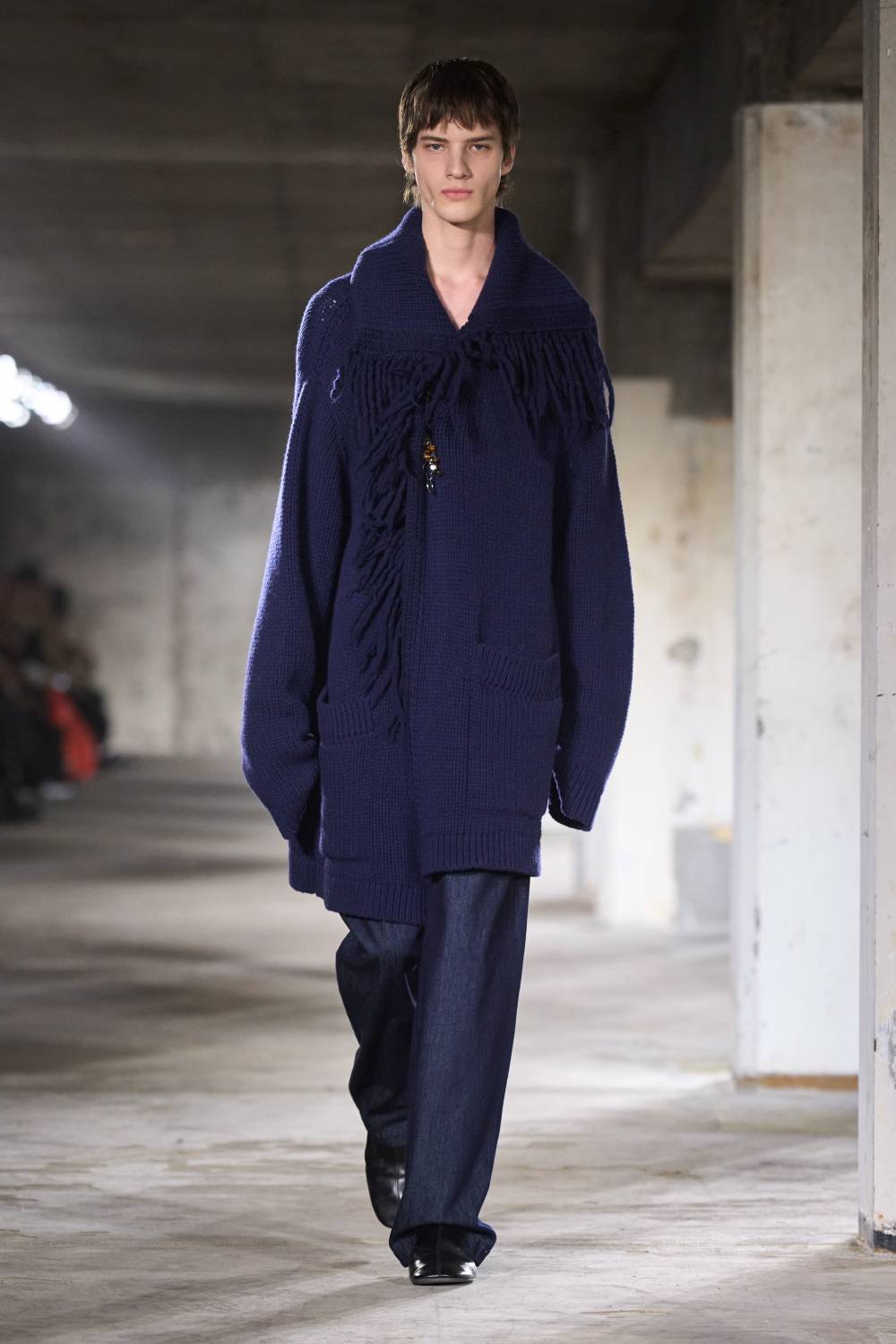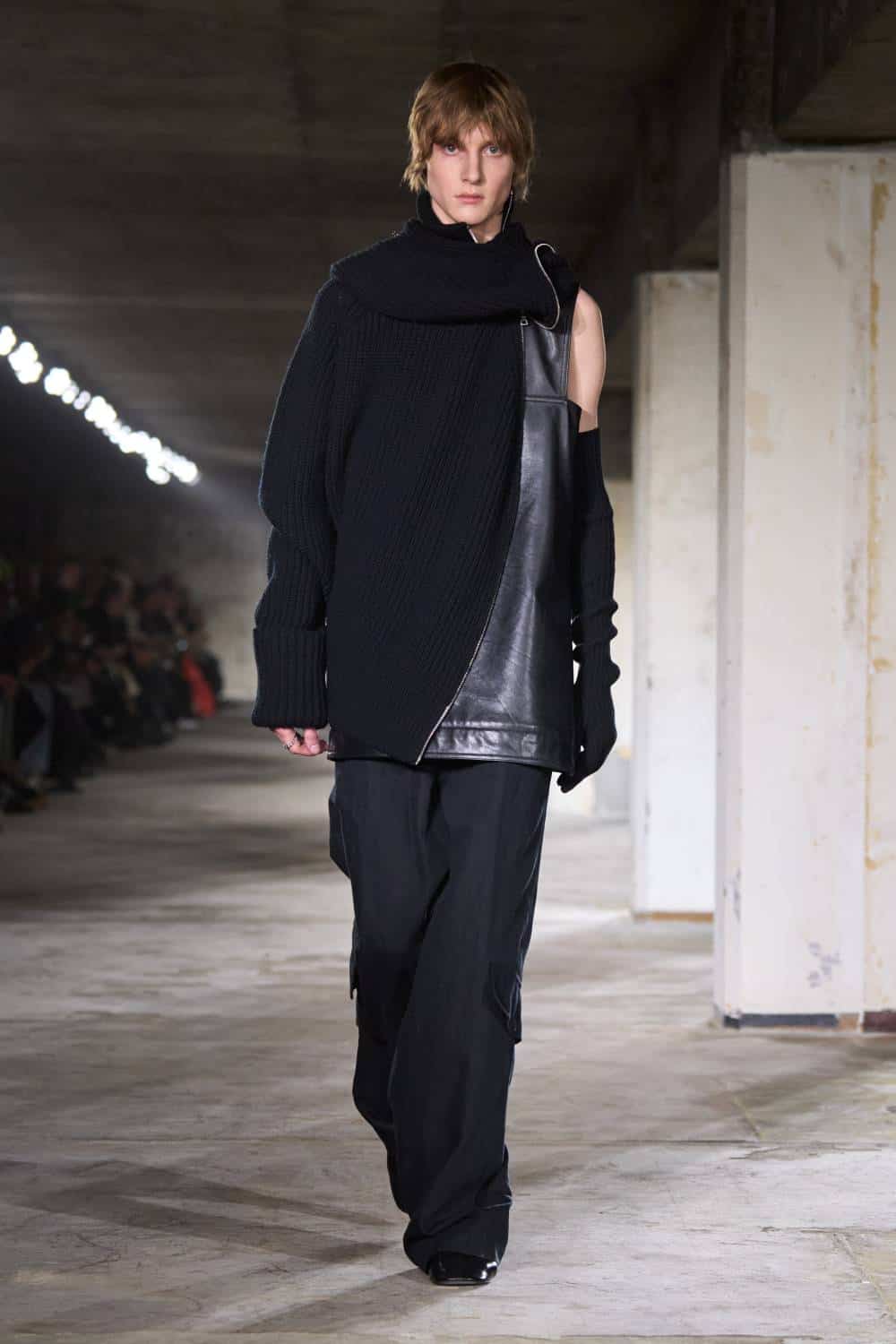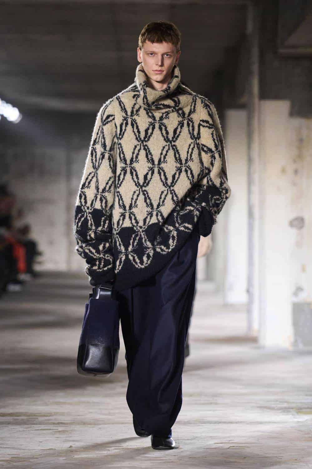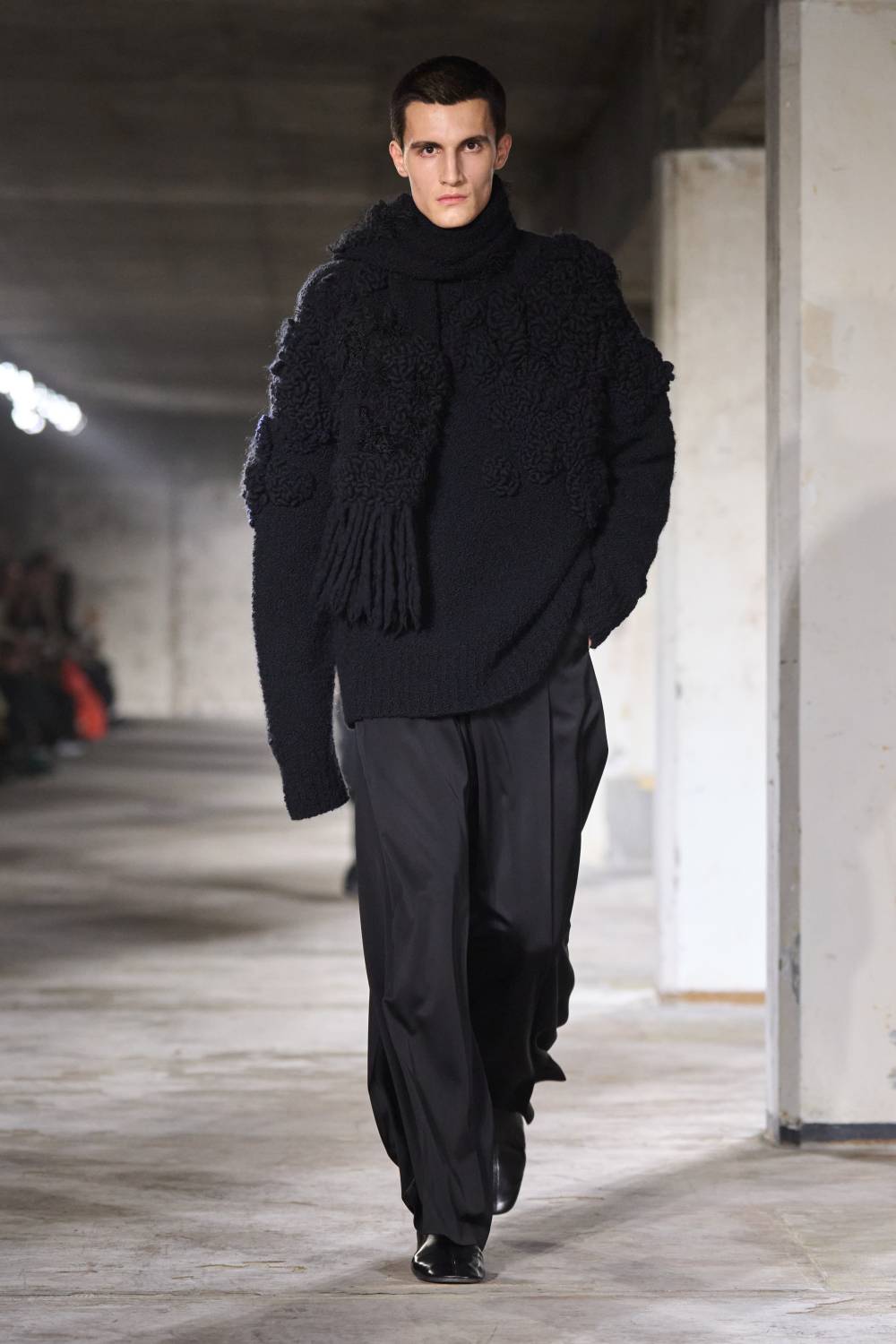 Inspired by a collision of opposing ideas, each garment was skilfully crafted to reflect the beauty in duality. Sweeping, tidy coats were engulfed by thick, knitted scarves while wide-shouldered blazers were paired with loose fitting slacks. Traditional shapes were reimagined, with oversized sweaters peeled open by sloping side zips and chunky arm warmers that snaked up past elbows. A delectable dichotomy between the structured and comfortable, the offering was a masterclass in elevated tailoring.