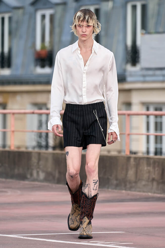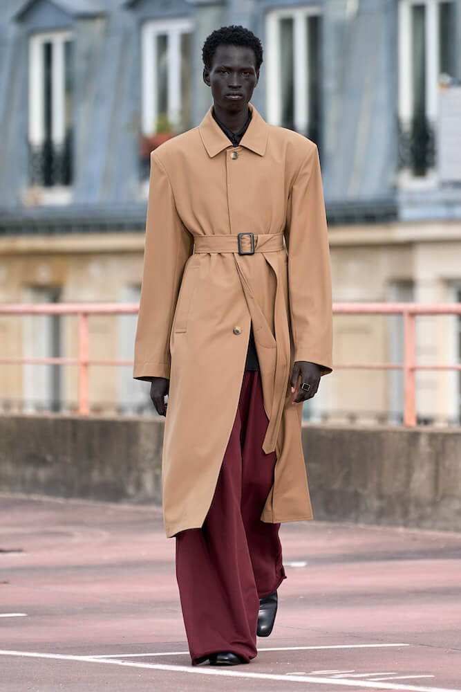 That said, conventional dichotomies and gender norms were ultimately rendered void as the collection developed. “Womenswear” boasted crisp tailoring while “menswear” was cinched at the waist, elaborately wrapped, draped and dandyfied, with elongated lines and a new emphasis on lingerie for men.