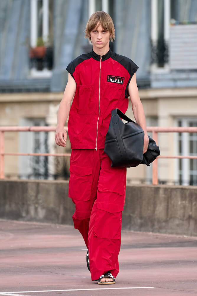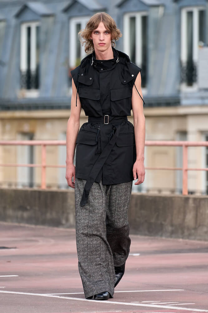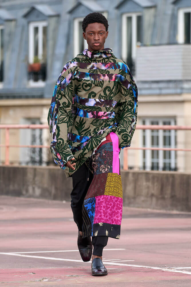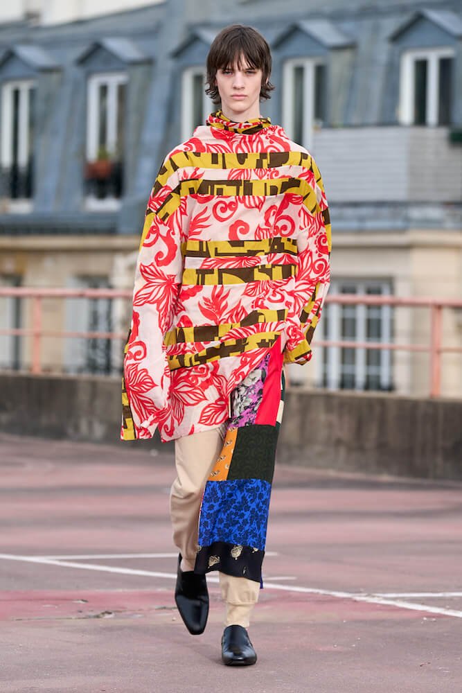 Elsewhere, while sharp-shouldered power suiting offered nods to avant garde fashions of the 1980s, the collection had all the joyous mixing of masculine and feminine codes one could wish for – perhaps of the subversive Buffalo style movement that came out of Britian – and a flowy levity that hints this – seen in the patchwork shirting, capes and militant silhouettes.