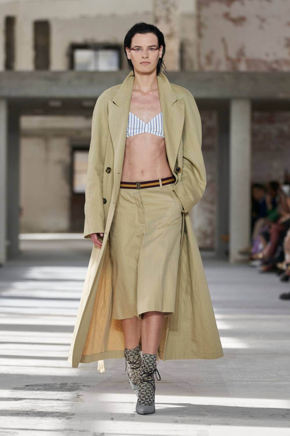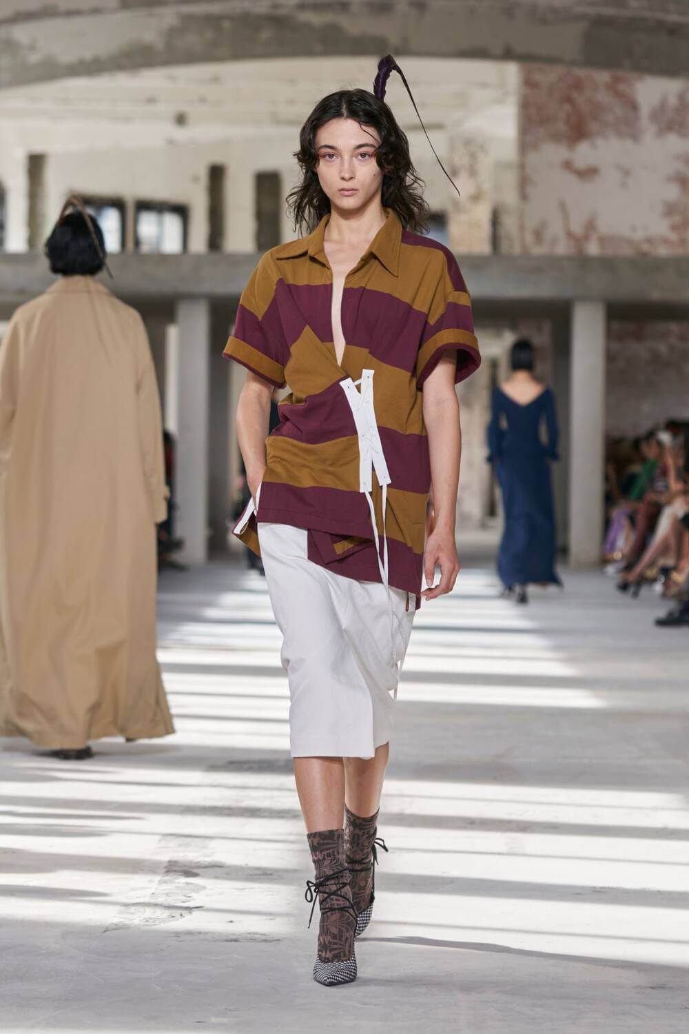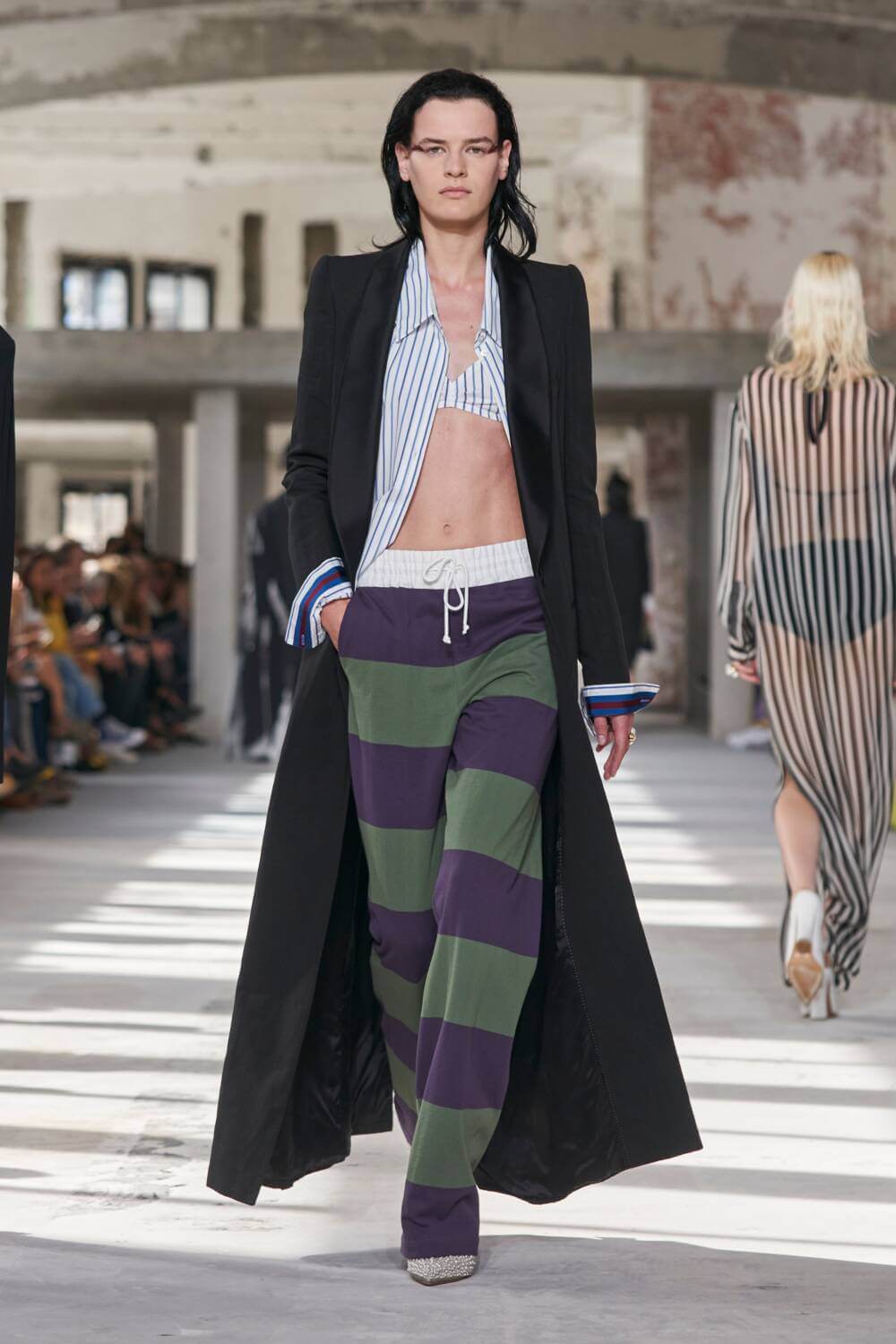 Blazers were squarely shaped and coats were oversized, both with a healthy helping of pockets and buttons. Prints were popular, dancing from marble-like swirls to decisive checkerboard to remind onlookers that fanciful formality isn’t defunct. Thick stripes reminiscent of a school rugby kit added a collegiate flare with the occasional mesh dress and bra top giving the collection an overall feel of effortless cool. Pointed-toe heels were strapped over geometric, shin-high socks while muted yet colourful plimsoll trainers popped out throughout. Striped shirts were reworked into dresses and off-the-shoulder jumpers, reimagining the conventional into something more daring and forward thinking.