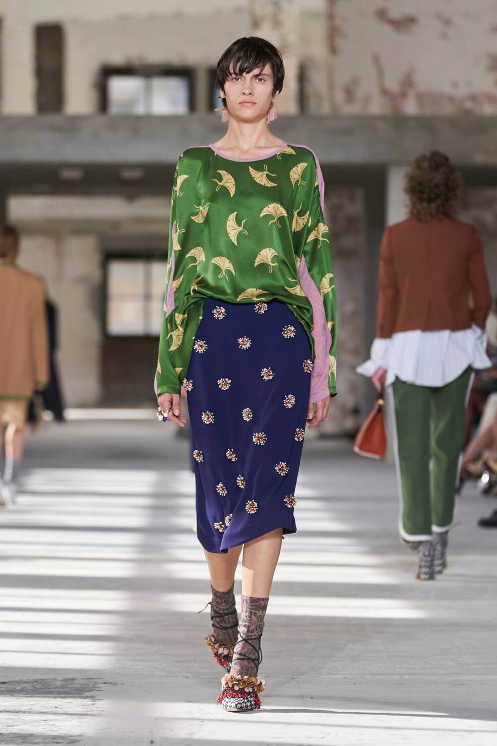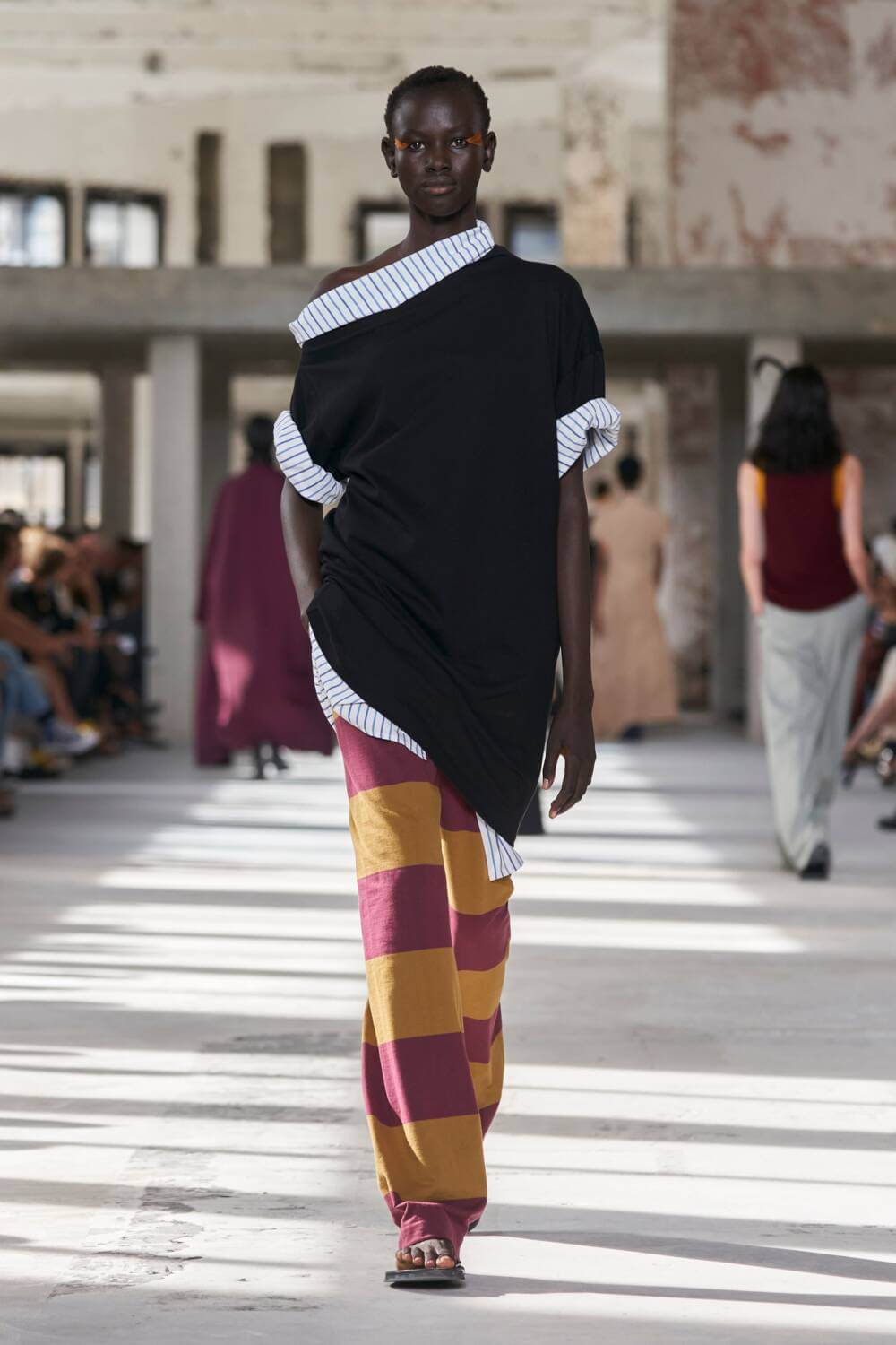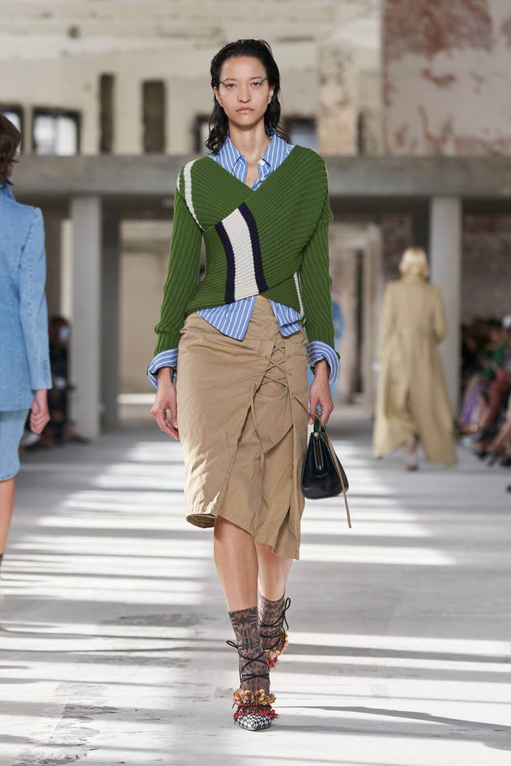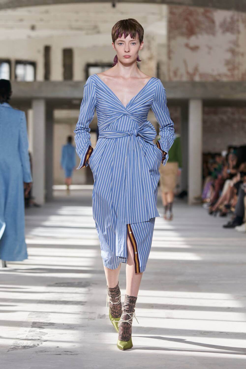 Blazers were squarely shaped and coats were oversized, both with a healthy helping of pockets and buttons. Prints were popular, dancing from marble-like swirls to decisive checkerboard to remind onlookers that fanciful formality isn’t defunct. Thick stripes reminiscent of a school rugby kit added a collegiate flare with the occasional mesh dress and bra top giving the collection an overall feel of effortless cool. Pointed-toe heels were strapped over geometric, shin-high socks while muted yet colourful plimsoll trainers popped out throughout. Striped shirts were reworked into dresses and off-the-shoulder jumpers, reimagining the conventional into something more daring and forward thinking.