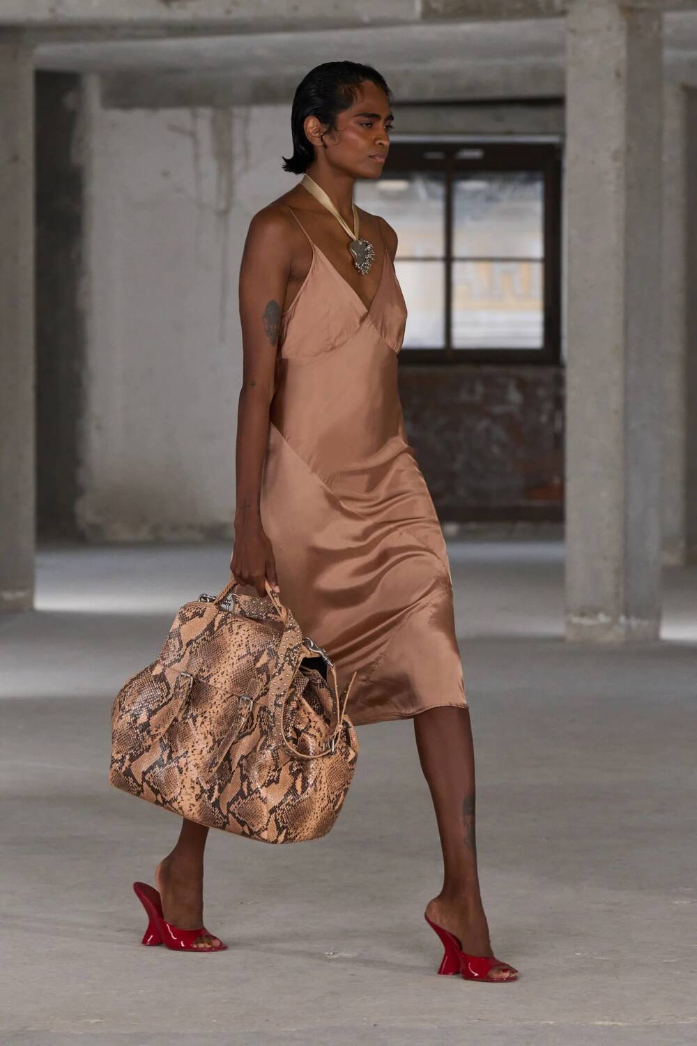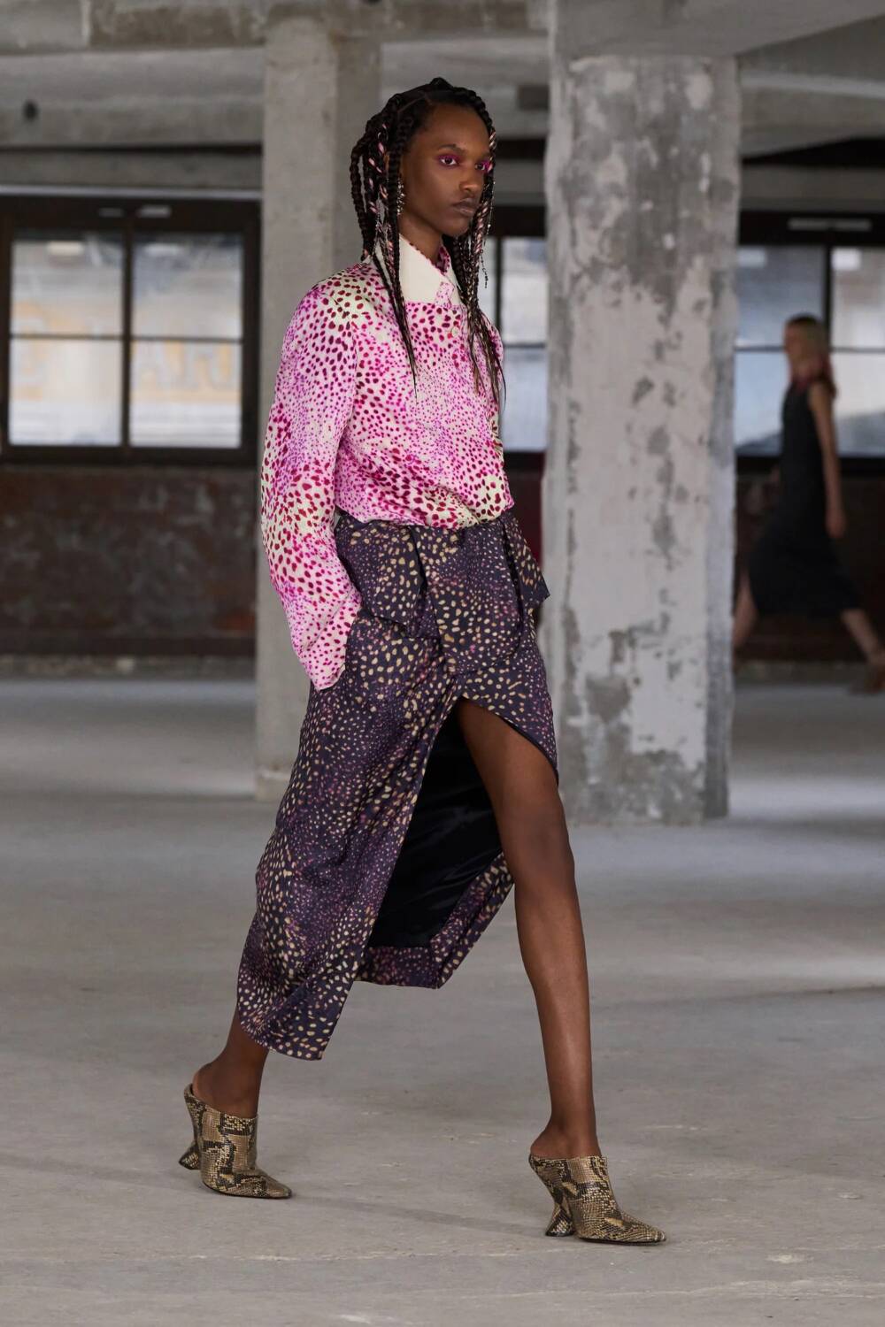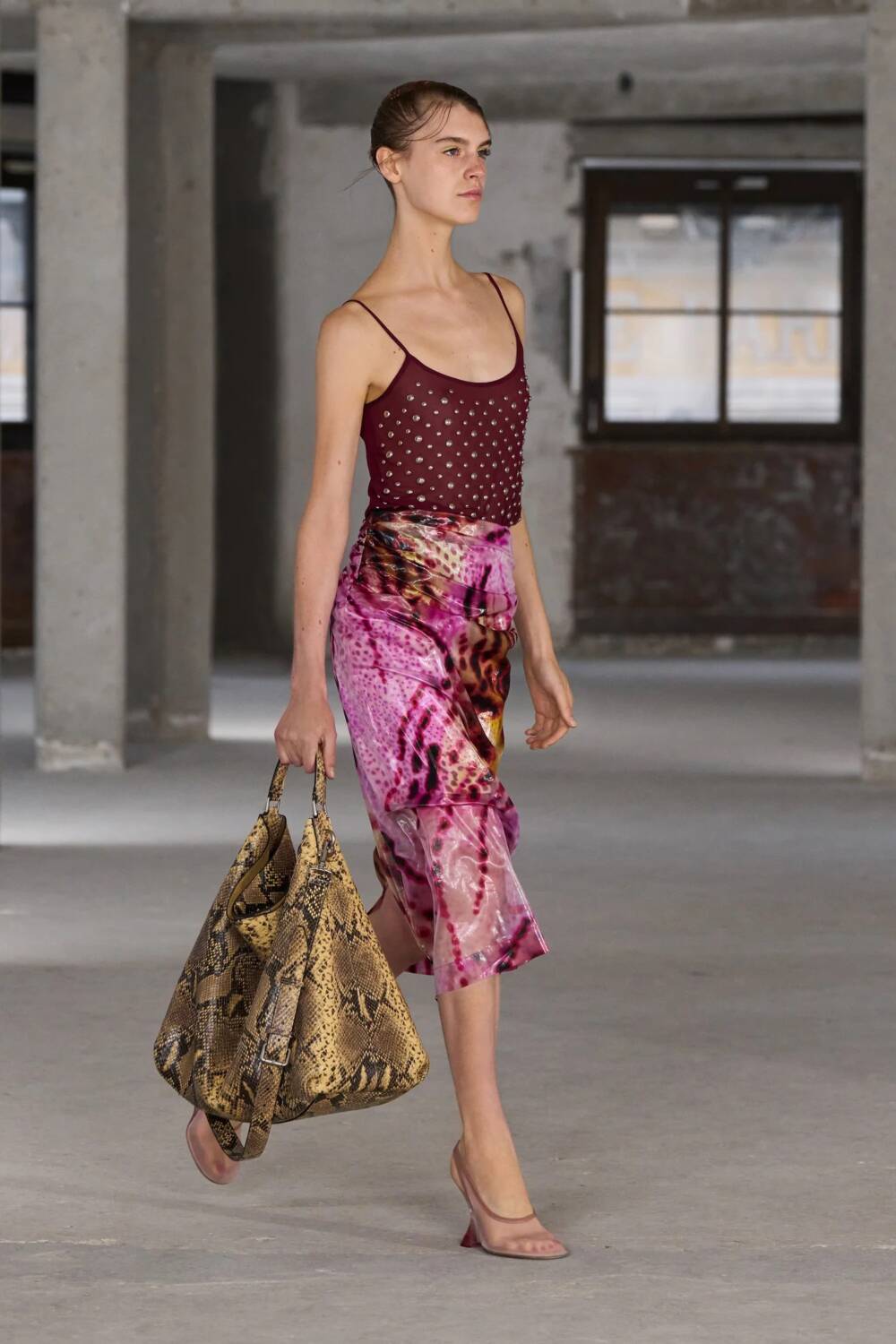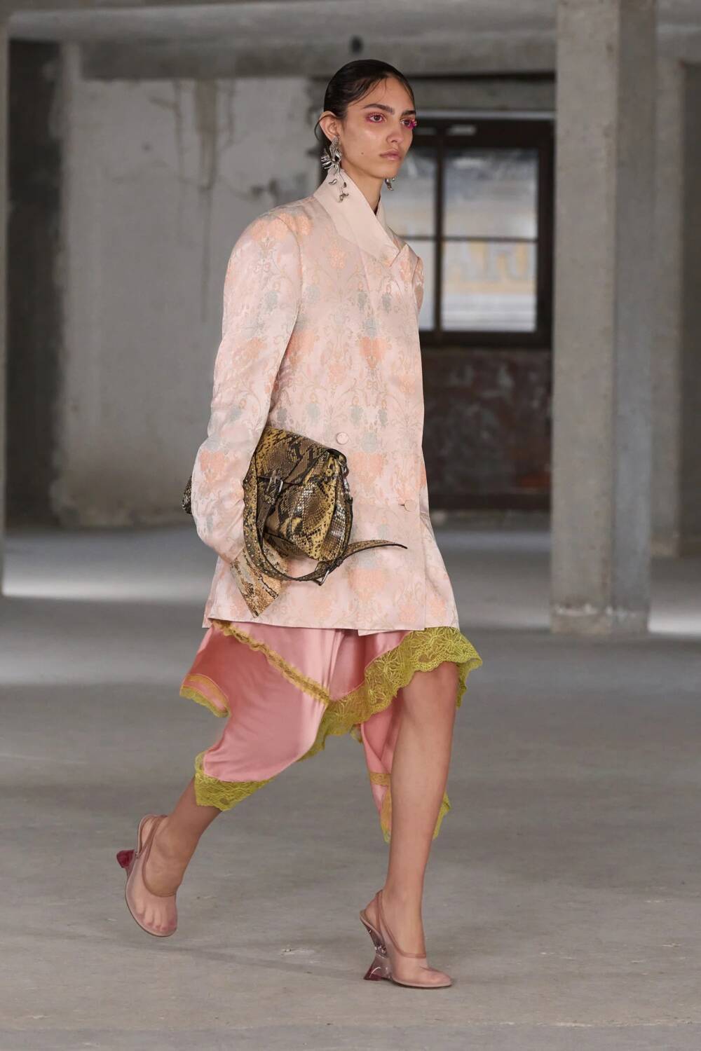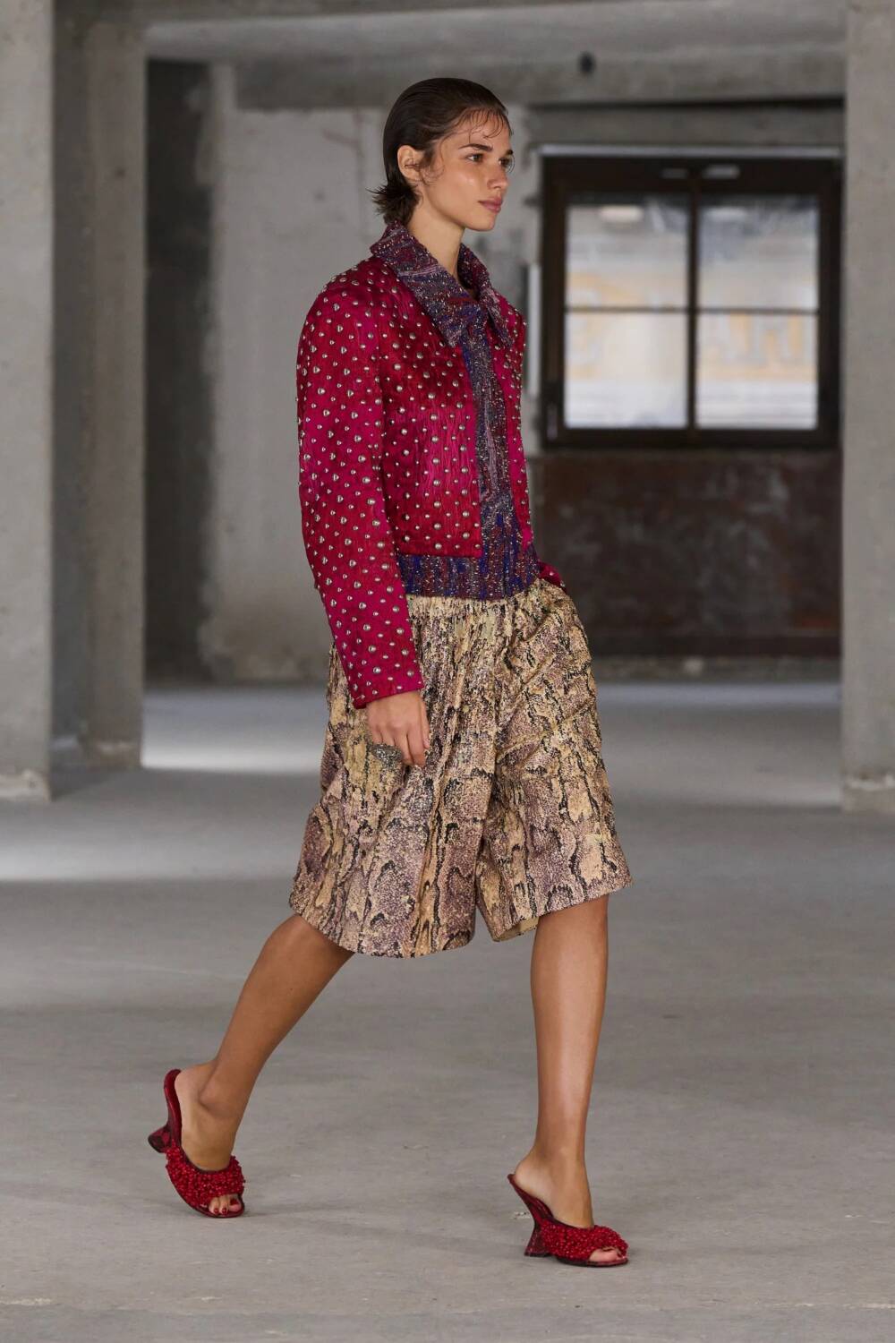 Fluid in the founder’s design language, the team worked to reinterpret his identifiable codes through an intoxicating array of prints – leopard, snake, fawn, floral and abstract. Coming in muddied, summer colours from blood red and violet to chartreuse and fuschia – there were slinky skirts and structured jackets. A fun step forward for the brand, lots of the looks were cinched in in strategically flattering places or draped in body-engulfing swaths of silk and lined with lace. Straight, cigarette trousers were worn with brocade blousons, eccentrically beaded hot pants or knee-length skirts with slouchy knit shirts, and tuxedo jackets were tucked into paper-bag trousers.