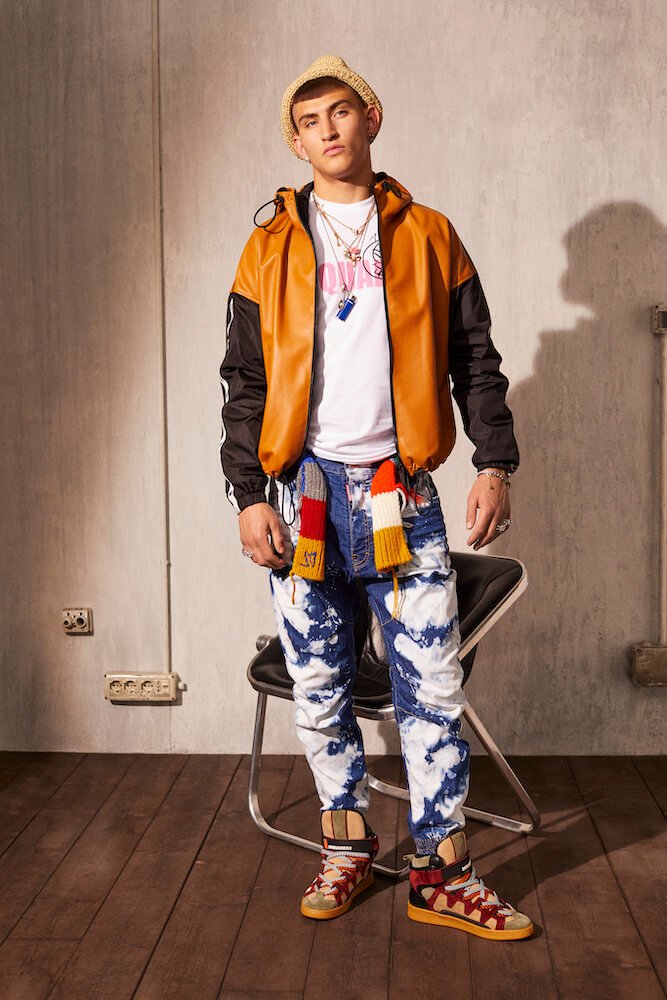 His-and-hers grungy knits and bleached denim jeans are worn alongside distressed, tweed twinsets and slouched cargo trousers dotted with plenty of pockets. Trousers are tagged in illustrations akin to your signed shirt on the last day of school, made from mismatched chino fabric mixed with jersey – worn with tie-dye hoodies and layered plaid shirts. There’s a grittier feel to these clothes, taking the glitzy sort of sexiness we expect from the Dsquared2 boys. These garms are rough, ready and rearing to dress you on a summer of unadulterated hedonism. You in?