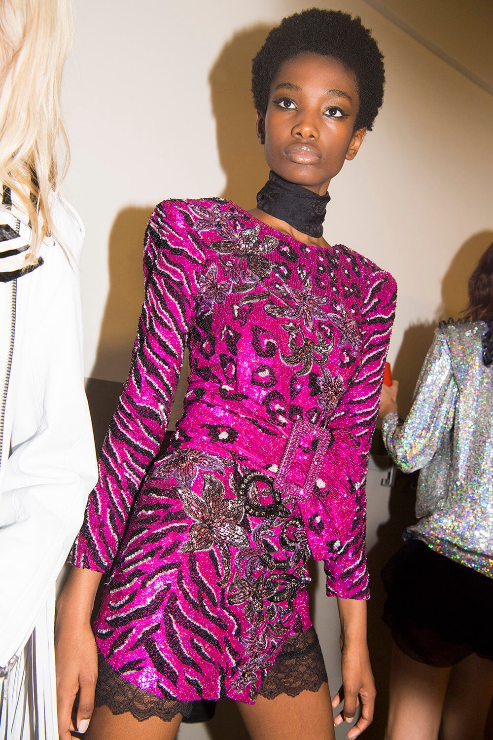 Vamp alert! Peter Dundas is on the prowl with a collection of teeny, tiny after dark looks, shown at the Musée Bourdelle in Paris. Importantly, he addressed the nagging problem of what pants to wear when your skirt skims your VJJ? His ingenious solution: lace cycling shorts worn under ultra short leopard lamé dresses. Well, sportswear is a major trend and Dundas has the glamazon answer. How about teeny tiny cocktail dresses with shoulder pads of American football-sized proportions, sequin hoodies and bedazzled sweatshirts (cropped of course – there’s nowhere to hide in a Dundas look). What does the Dundas girl do in the day? Who cares. She’ll see you at the party.