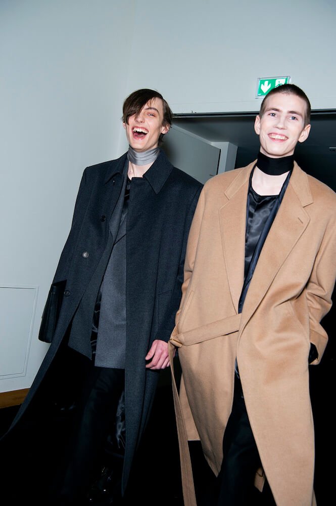 As ever, silhouettes were ace, as was the cuts, with strong shoulders and prominent collars being all the range. However, now more daring additions entered the mix. Royal blue and inky black shirts came in gorgeous satins, worn with skinny scarves styled like chokers. A crinkled PVC made several appearances, and looked particularly great when dyed a crimson red on a brilliant pair of trousers. Leather capes and cozy overcoats that were fitted with a belt fastening that started at the lining proved the strongest outerwear moments, whilst a selection of nifty mini-trunks will undoubtedly win over a new slew of Dunhill devotees.