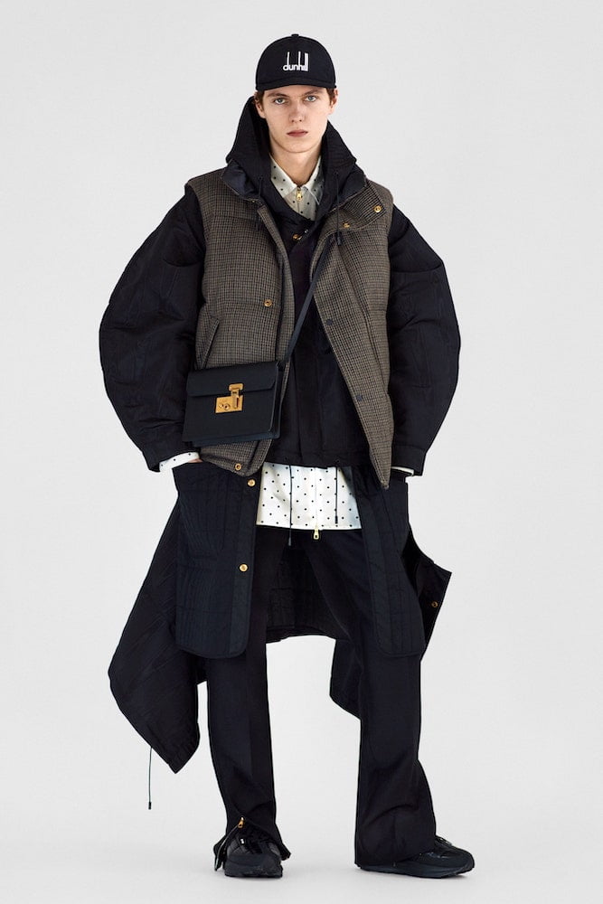 There’s more colour in this Dunhill collection and the long, multicolour knit scarves are remakes of ones that he and his brother had when they were children. Weston’s also introduced a pleasing element of versatility, inspired by a compendium from the Dunhill archive. A what? “It’s a multifunctional gentleman’s item,” he explained showing a picture of the beautifully crafted object that combined a cigarette case with a watch and penknife. This archive piece inspired him to create several multifunctional, adaptable pieces, including reversible shearlings and zip-off parkas that become short coats and also have snap-in, quilted liners that can be worn separately.