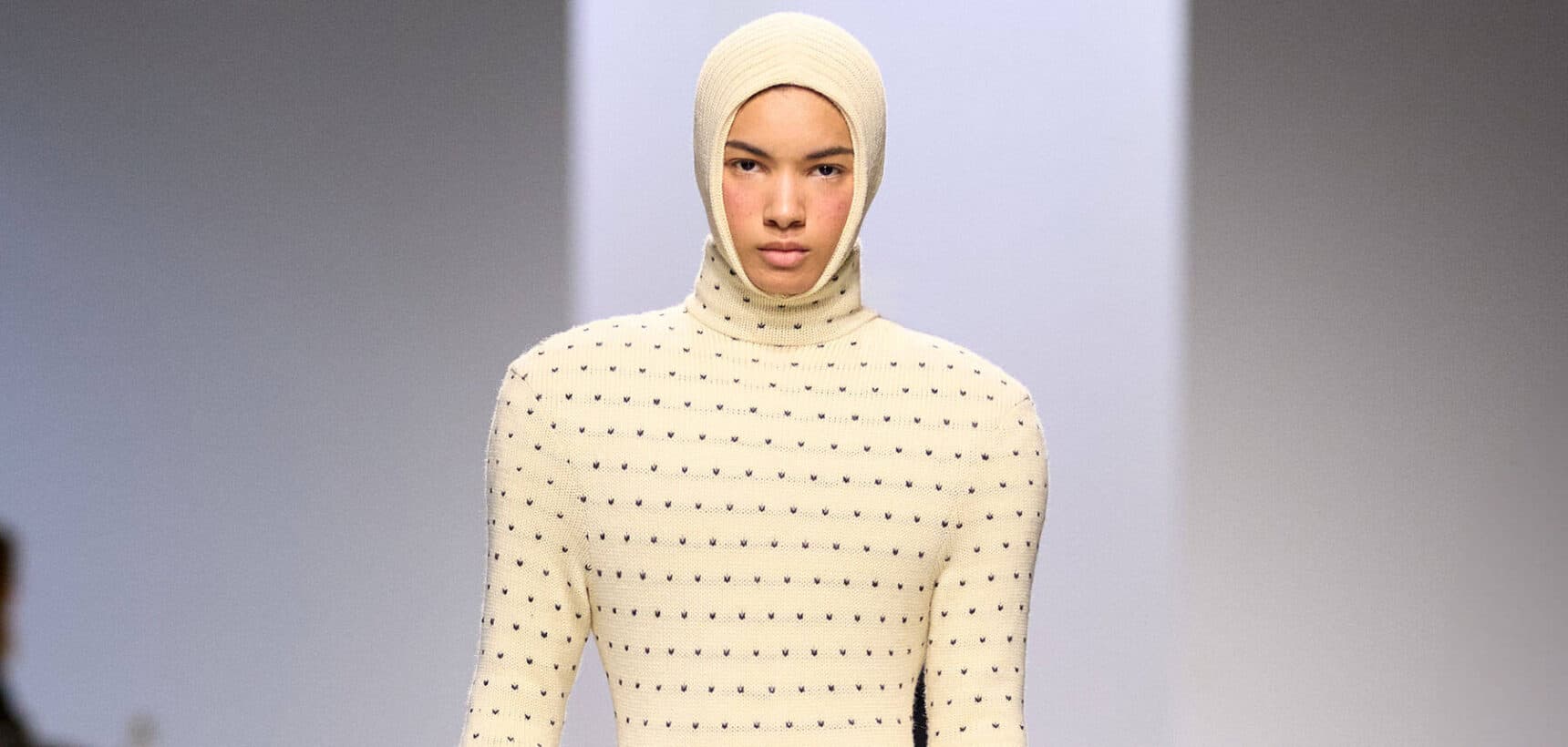 Titled Duran-Ski, Lantink transported attendees to a wintery playground of post-ski slope champagne filled fun for the show. Reinterpreting the power shaping ’80s skiing style, the designer, who is based between Amsterdam and Paris, really homed in on wide, forward-facing shoulders as his focal point. This meant volumes were taken to new extremes within silhouettes shaped by micro padded hot pants, cropped puffer jackets and three-dimensional vests that looked like some kind of Fair-Isle-covered lifejacket and spiralled down the body with a large cut-out coming in just below the ribs. A lot of the collection was three-dimensional actually, with an array of shoulder-padded cardigans and stocky, fury, mini-gilets appearing throughout.