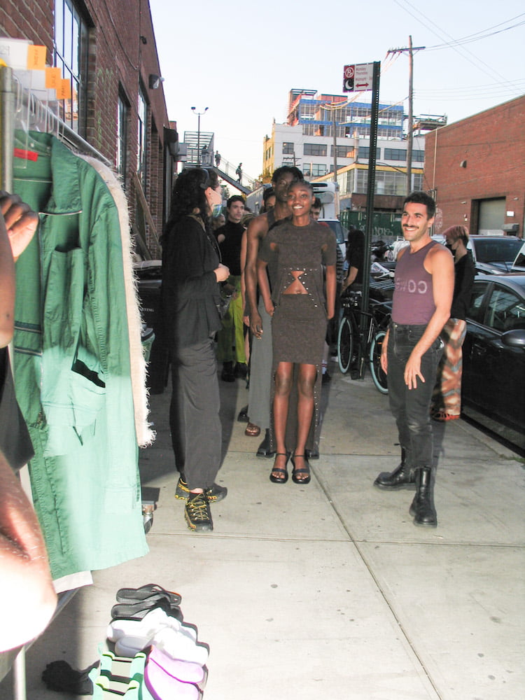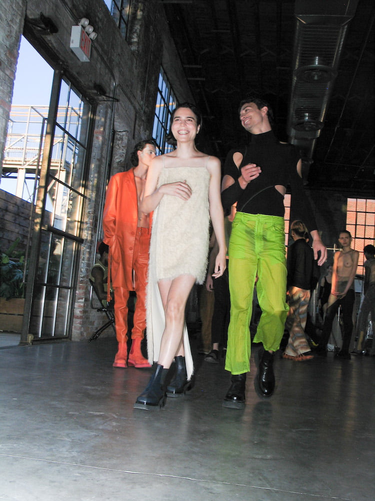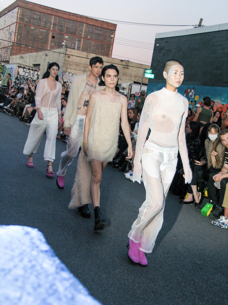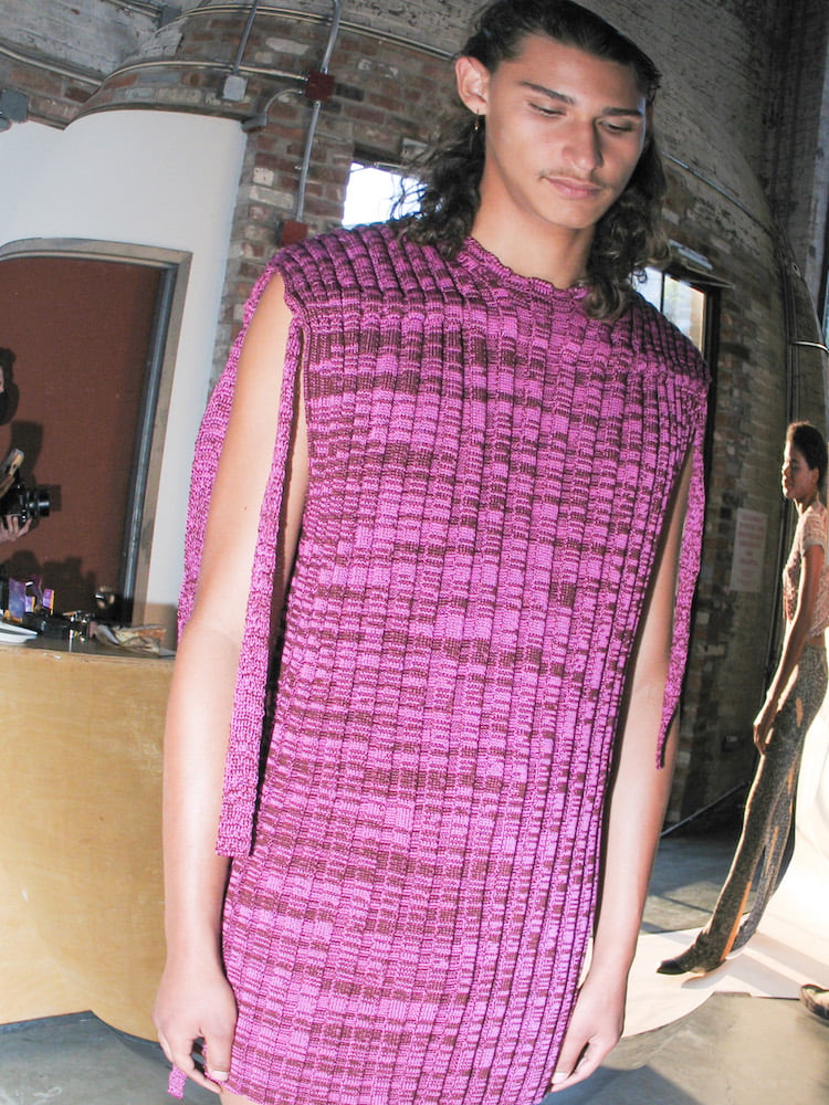 Whilst the brand’s contemporaries turned to fashion films during the pandemic, Eckhaus Latta managed to stage IRL fashion shows – the first to a crowd of nine, the second in a gloomy, audience-less warehouse. Last Saturday, the pair made their way back to Bushwick, where the likes of Rosalia and Troye Sivan watched on as models strode in sheer combo trousers, woollen twinsets and sexy, Helmet Lang-esque, leather get-ups. While knitted numbers in purple, green and putty brown signalled a more mature Eckhaus Latta – seen across the brand’s most recent collections – barely-there dresses, whispy shirts and sensual cut-outs signalled a pent up libido, probably from all that time in lockdown. Judging from the brand’s raunchy escapades in the past – remember that campaign? – don’t expect that side of Eckhaus Latta to disappear anytime soon.