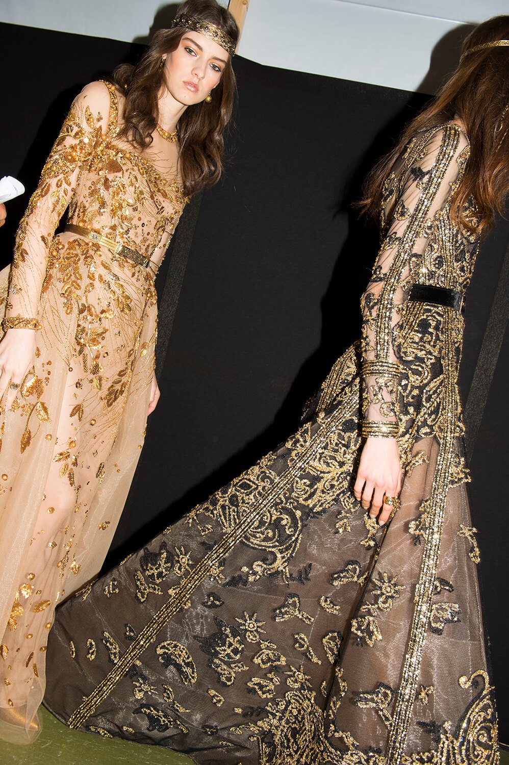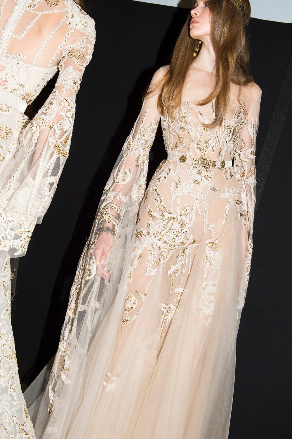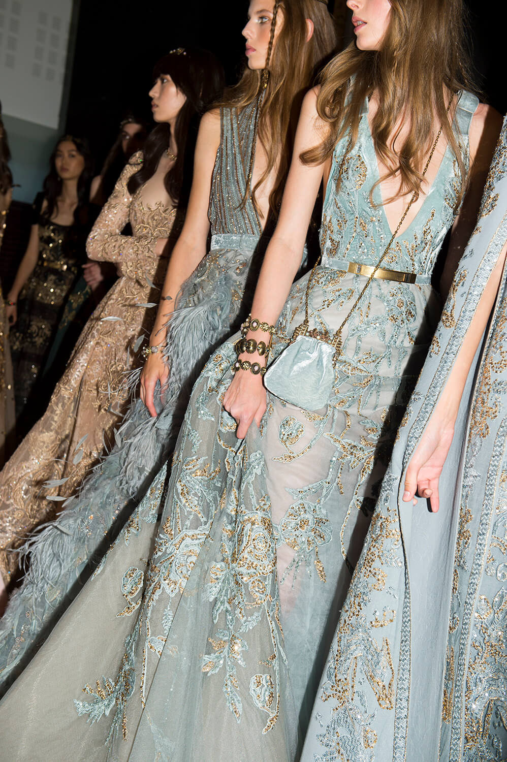 And what better at to bid battle than in yards of chiffon, mouseline and tulle? Because Elie Saab is, and always will be, about fantasy gowns – but here they were toughened up with beaded bodices that cinched the waist, or long overcoats with flared bell sleeves. Something about the fit of the gown suggested armour, sculpting the girl’s bodies and long in the arms, plunging at the neckline. It finished, as an Elie Saab couture show always does, with a bride – this time in gold, hooded and with a train so long that it took two models to carry it after her. If you can’t do a two-man train at couture, when can you?