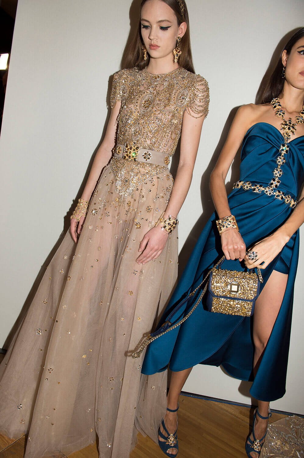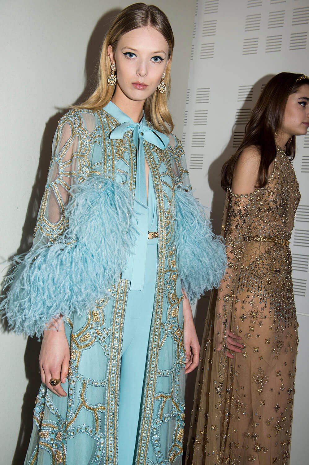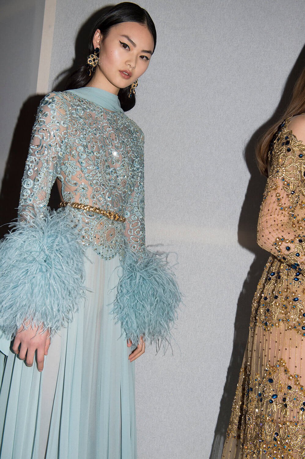We’re easily pleased, us. Throw a bucketload of sparkling things in our general direction and we’ll probably end up having some sort of pleasure-based seizure in which our eyes roll into the back of our head and passersby check that we are, in fact, okay. Sensory overdrive, then, this PM at the Elie Saab show, as this was pretty much a full-on Disney princess fantasy moment. As Elie Saab is so very good at. Except, this time, it was inspired by the country of Egypt. Which has not, as far as we know, been the setting of a Disney film just yet, but, if it were to be, then our heroine would look something like this – a parade of semi-sheer goddess gowns dripping in sparkle, that, on closer inspection evoking such things as the eye of Horus and boats on the Nile. Sort of Cleopatra, were she to be reborn in the year 2017 to a multi-billionaire oil baron. In other news, wondering whether it was just us or was there a touch of the boudoirs to this? Something about those poofs of ostrich feathers, all that sheer and those silky bits and bobs gave us luxe-y bedroom wear. I mean, what else to wear to bed that a hand hand-stitched Haute Couture gown?