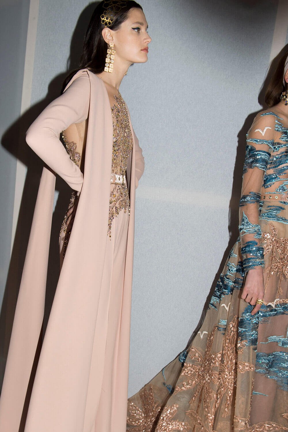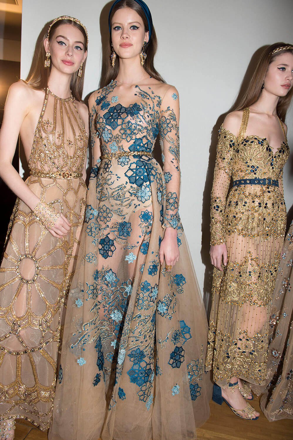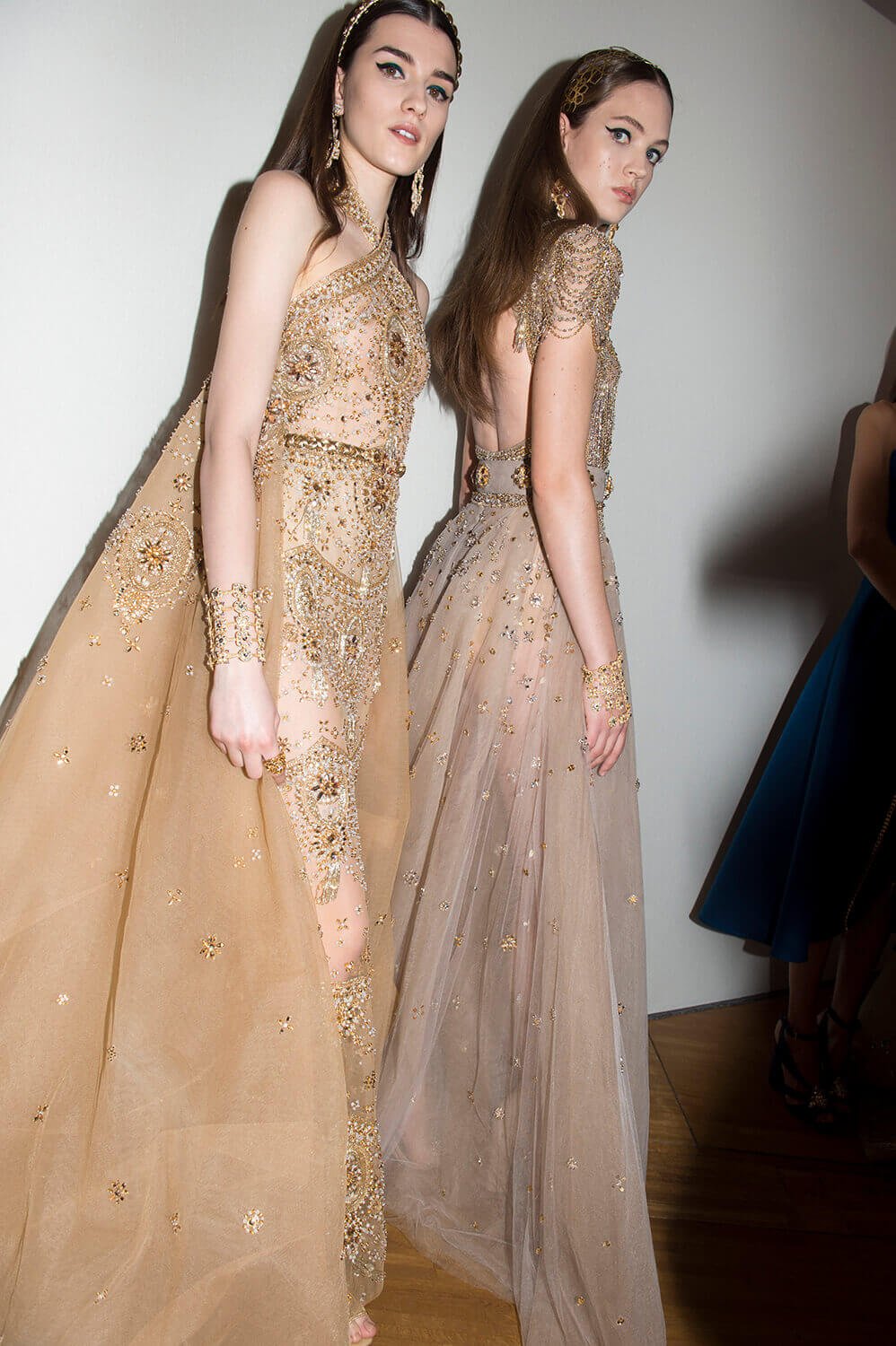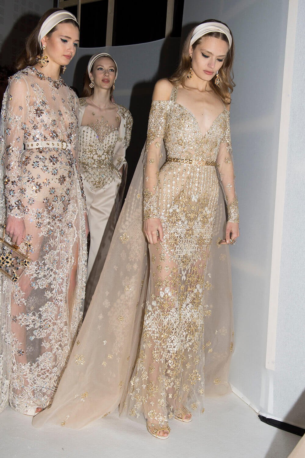 We’re easily pleased, us. Throw a bucketload of sparkling things in our general direction and we’ll probably end up having some sort of pleasure-based seizure in which our eyes roll into the back of our head and passersby check that we are, in fact, okay. Sensory overdrive, then, this PM at the Elie Saab show, as this was pretty much a full-on Disney princess fantasy moment. As Elie Saab is so very good at. Except, this time, it was inspired by the country of Egypt. Which has not, as far as we know, been the setting of a Disney film just yet, but, if it were to be, then our heroine would look something like this – a parade of semi-sheer goddess gowns dripping in sparkle, that, on closer inspection evoking such things as the eye of Horus and boats on the Nile. Sort of Cleopatra, were she to be reborn in the year 2017 to a multi-billionaire oil baron. In other news, wondering whether it was just us or was there a touch of the boudoirs to this? Something about those poofs of ostrich feathers, all that sheer and those silky bits and bobs gave us luxe-y bedroom wear. I mean, what else to wear to bed that a hand hand-stitched Haute Couture gown?