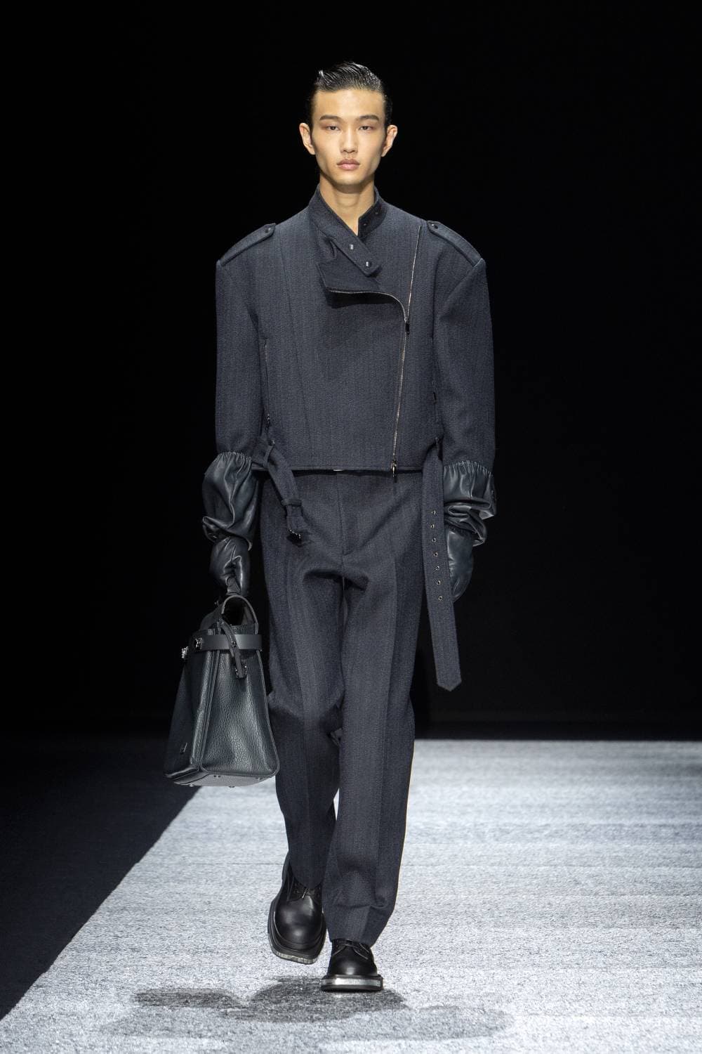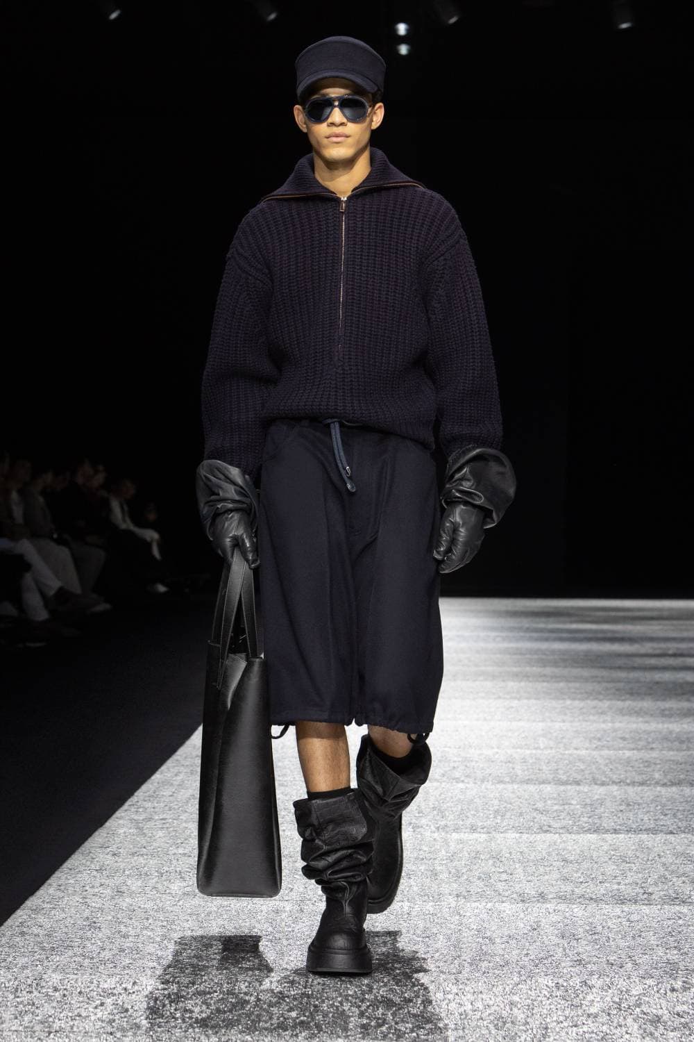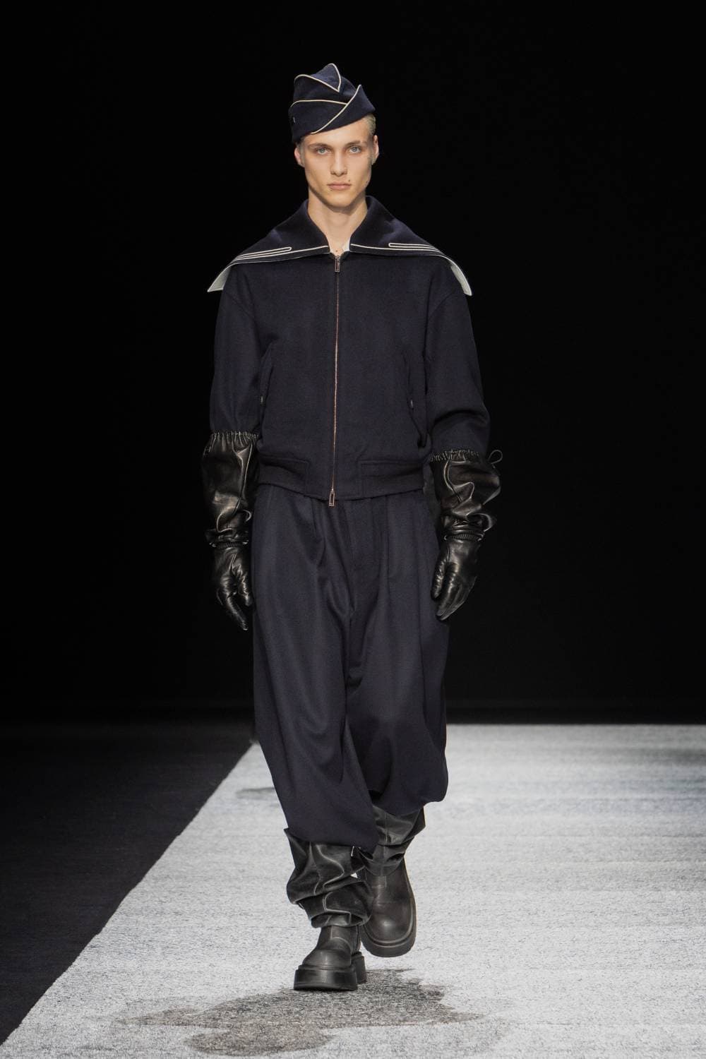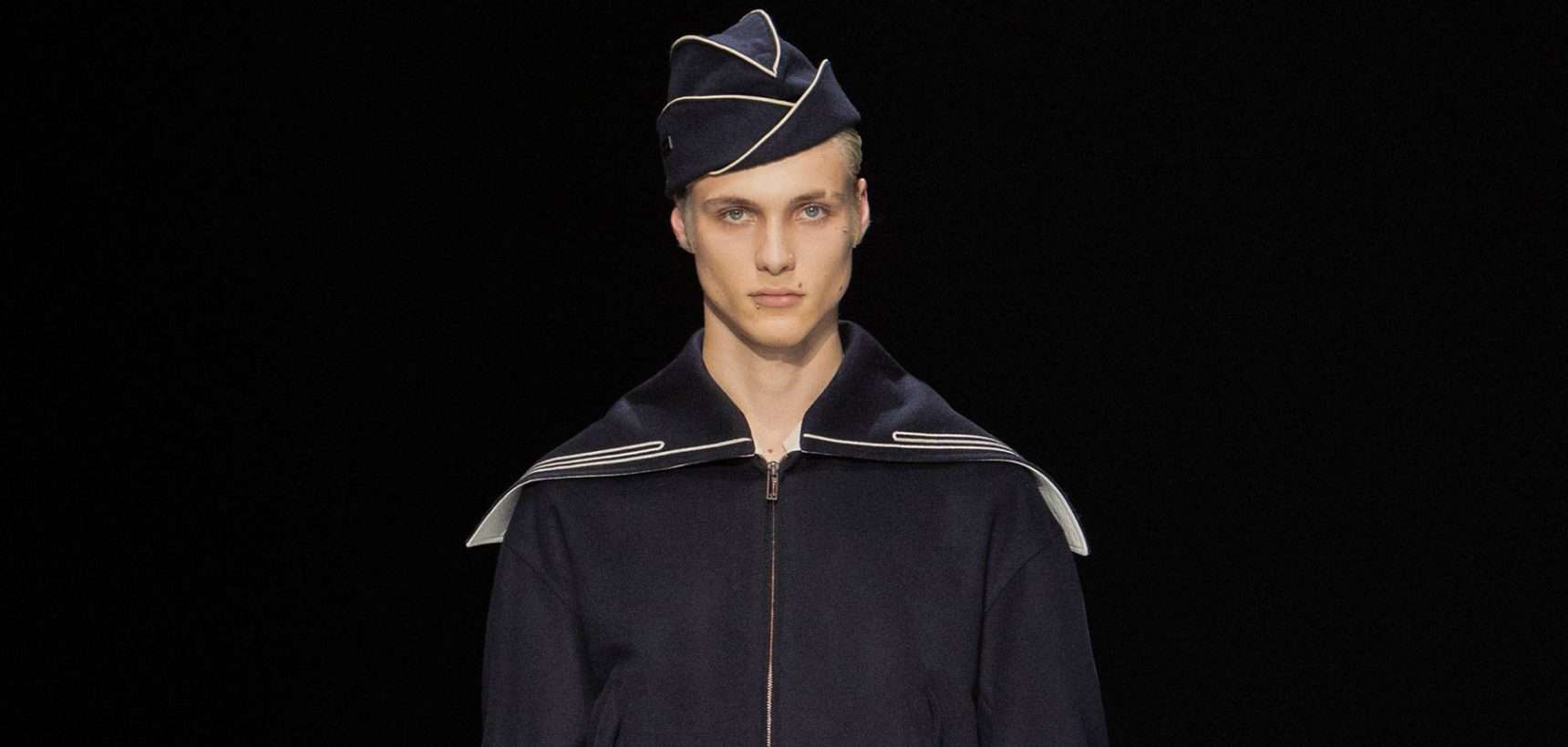 Sporting clear-cut silhouettes with broad, pronounced shoulders, the Emporio Armani boys brought a certain sophisticated charm to the nautically-inspired attire. There were brushed wool ankle-length overcoats and oversized greatcoats, billowing leather trousers with sharp, single breasted tweed wool blazers to match and a series of expertly tailored suits that were styled with frothy ruffled Victorian jabots. Dungarees were worn atop wet-weather ready rubberised tops while Breton striped collared shirts, gilets and bibs were styled under boxy cropped jackets with flowy suspended trousers, many of which were worn with militant sailor hats and carrying bags, like hand luggage with massive mesh details and seabags under their arms. Intermixed with womenswear, variations of the men’s collection which came adapted and re-proportioned, gracefully bridging the borders of gendered dressing.