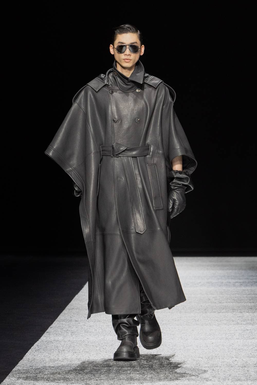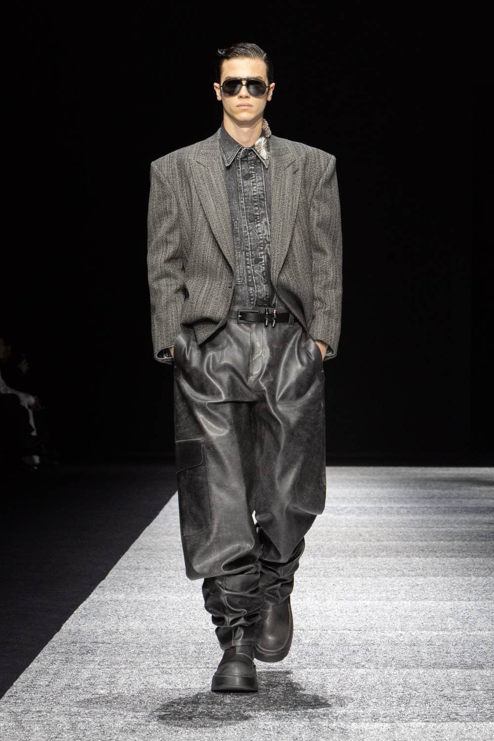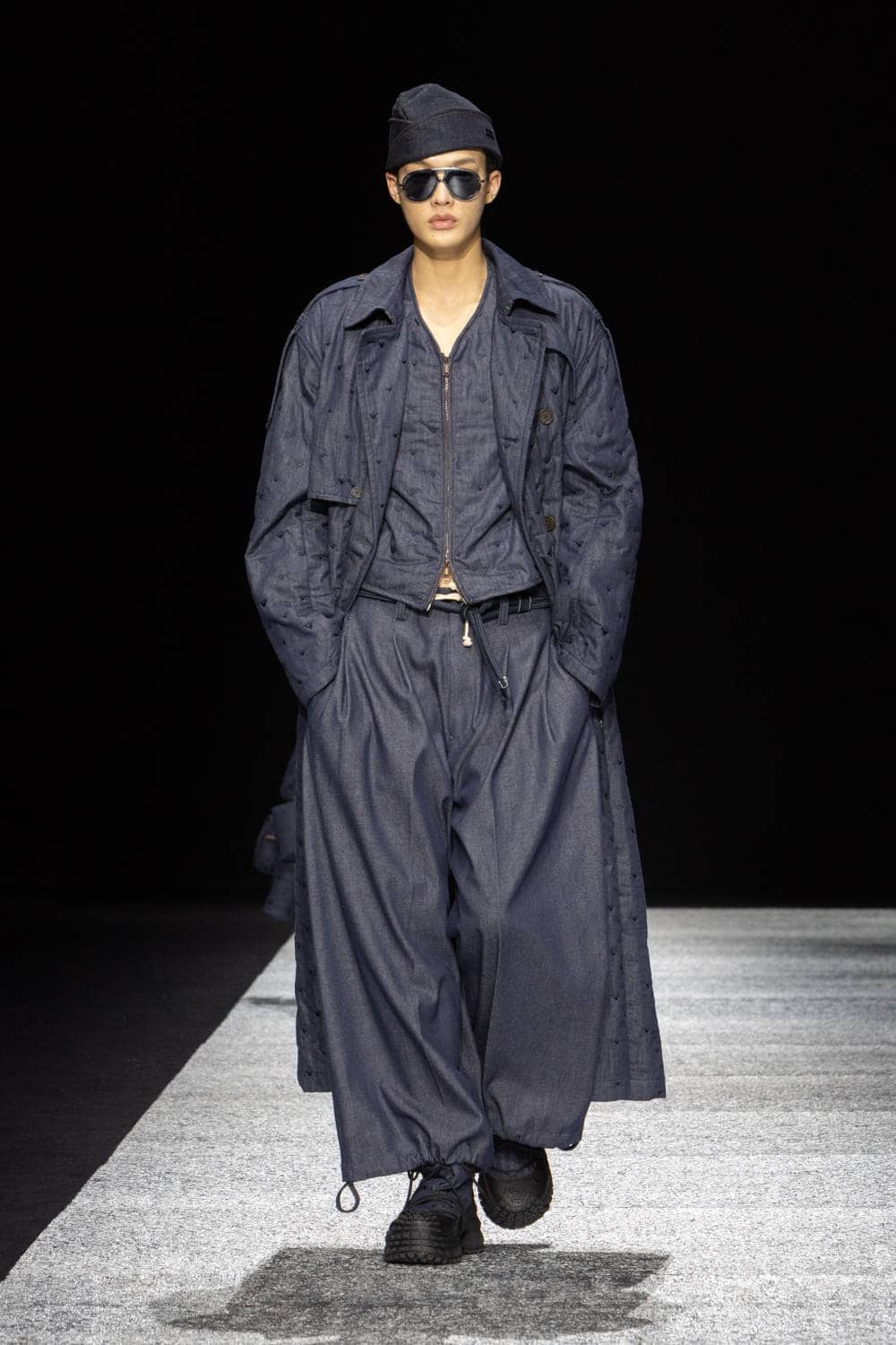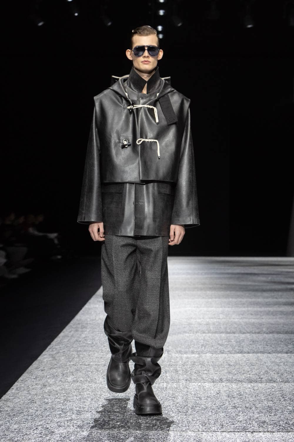 Sporting clear-cut silhouettes with broad, pronounced shoulders, the Emporio Armani boys brought a certain sophisticated charm to the nautically-inspired attire. There were brushed wool ankle-length overcoats and oversized greatcoats, billowing leather trousers with sharp, single breasted tweed wool blazers to match and a series of expertly tailored suits that were styled with frothy ruffled Victorian jabots. Dungarees were worn atop wet-weather ready rubberised tops while Breton striped collared shirts, gilets and bibs were styled under boxy cropped jackets with flowy suspended trousers, many of which were worn with militant sailor hats and carrying bags, like hand luggage with massive mesh details and seabags under their arms. Intermixed with womenswear, variations of the men’s collection which came adapted and re-proportioned, gracefully bridging the borders of gendered dressing.