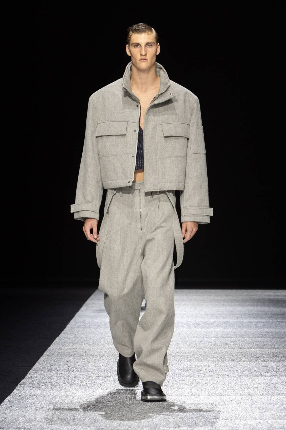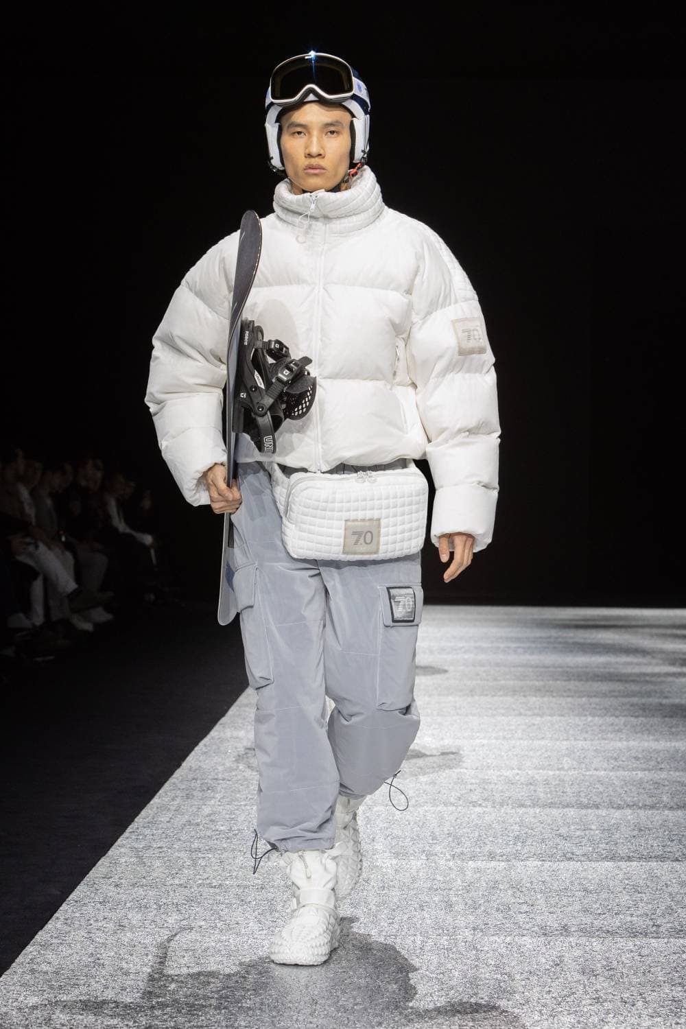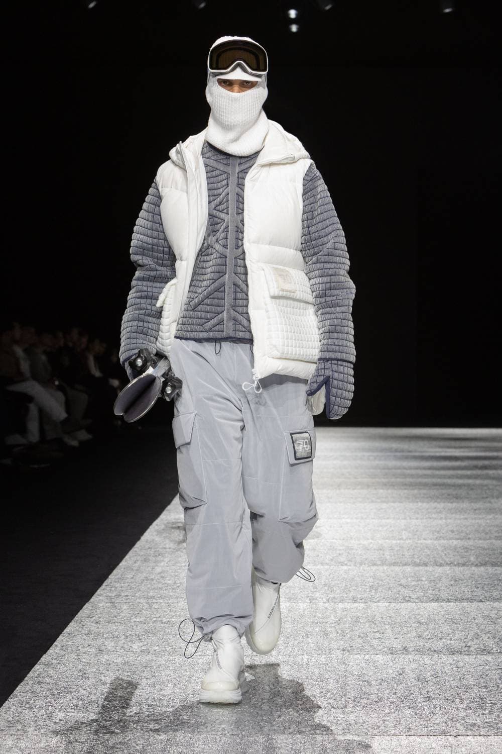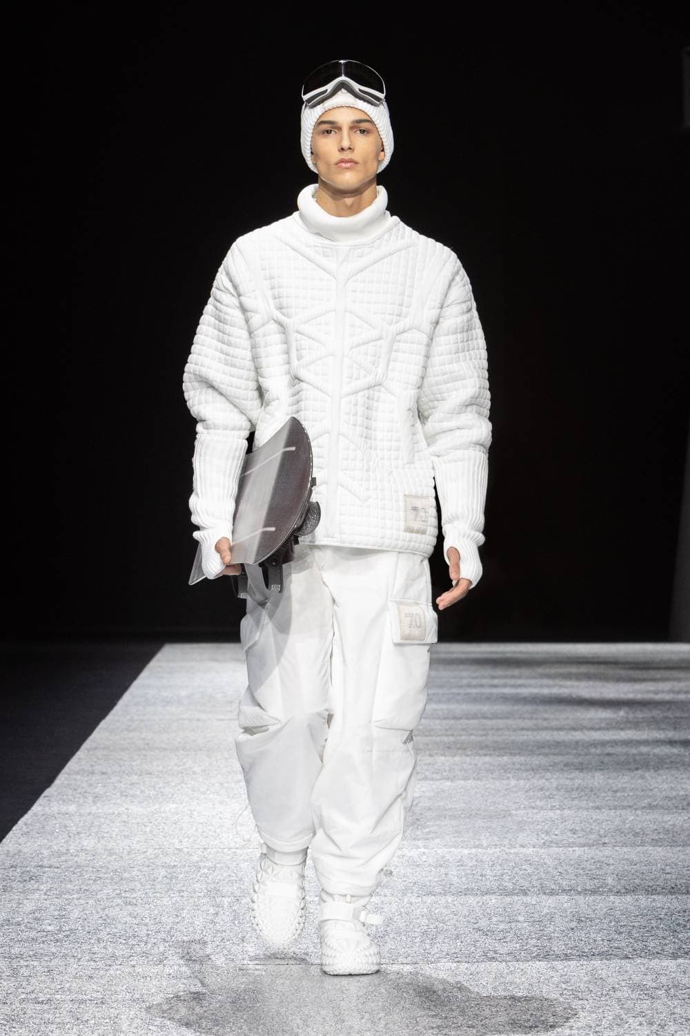 A sudden onslaught of crisp white snowboard and skiwear cut through the otherwise classic collection, one riddled with exceptionally tailored pieces all in navy blue, steel grey, white and midnight black. However, every look that came out was “anchored to the ground by lace-up with high soles”, footwear which, when mixed with gaiters became soft boots, even when they were meant for the slopes rather than the sea.