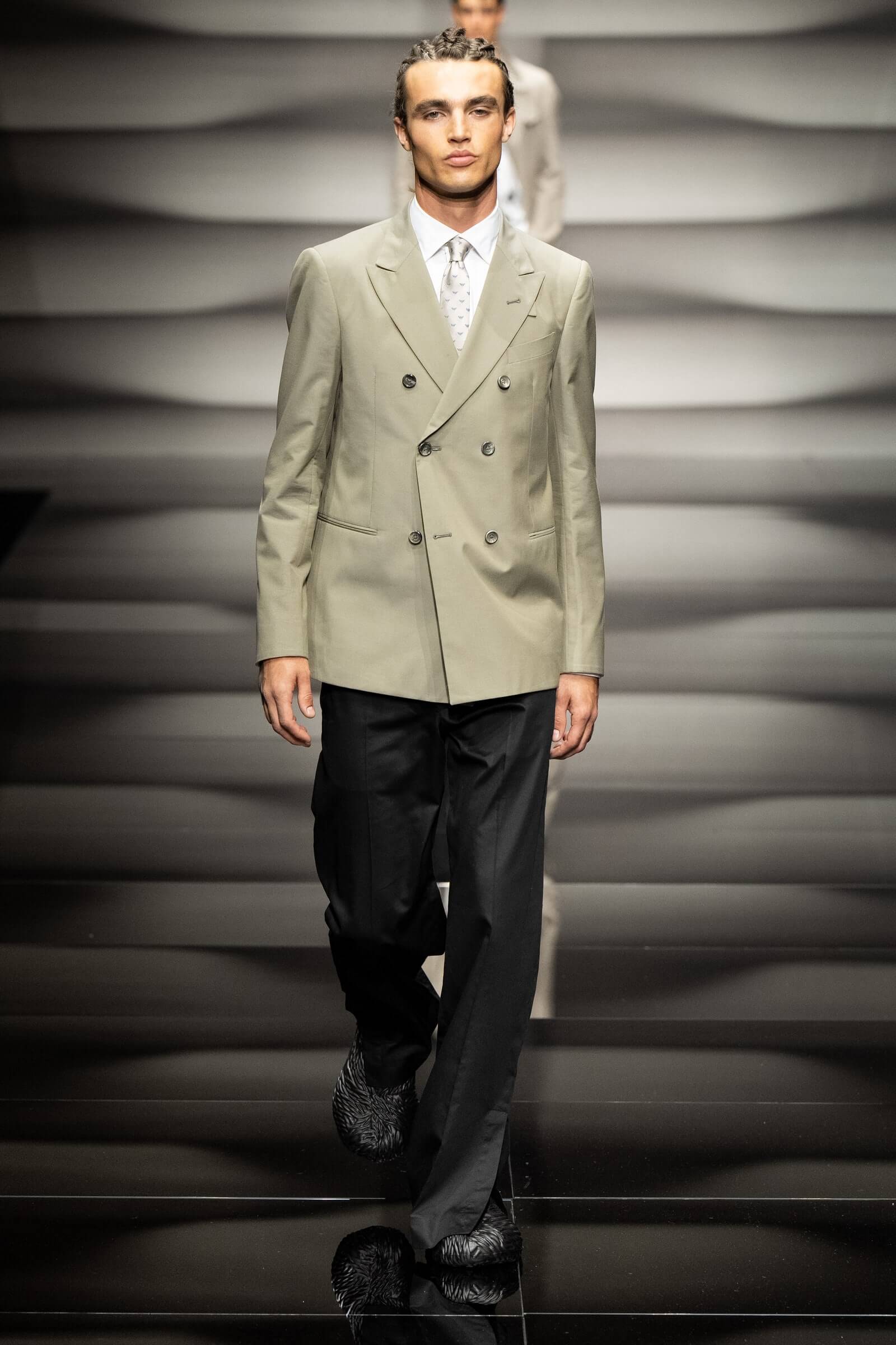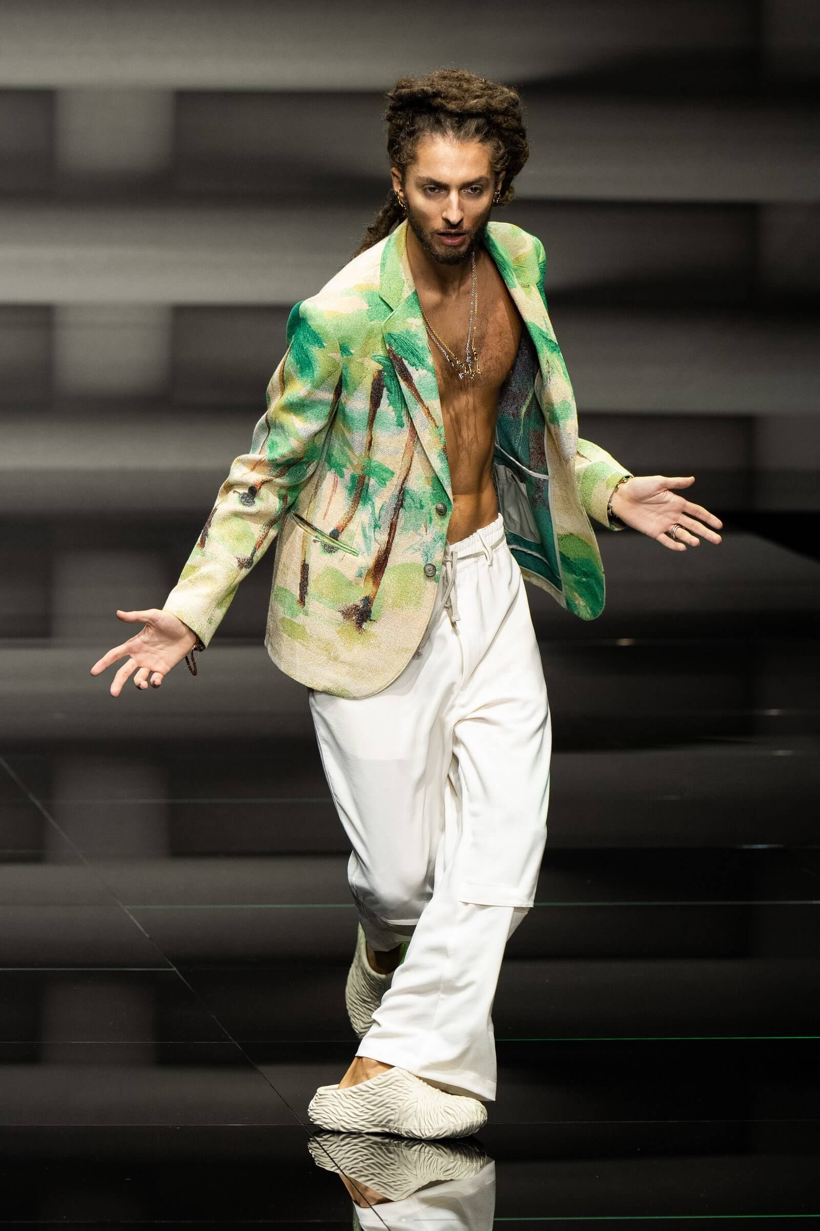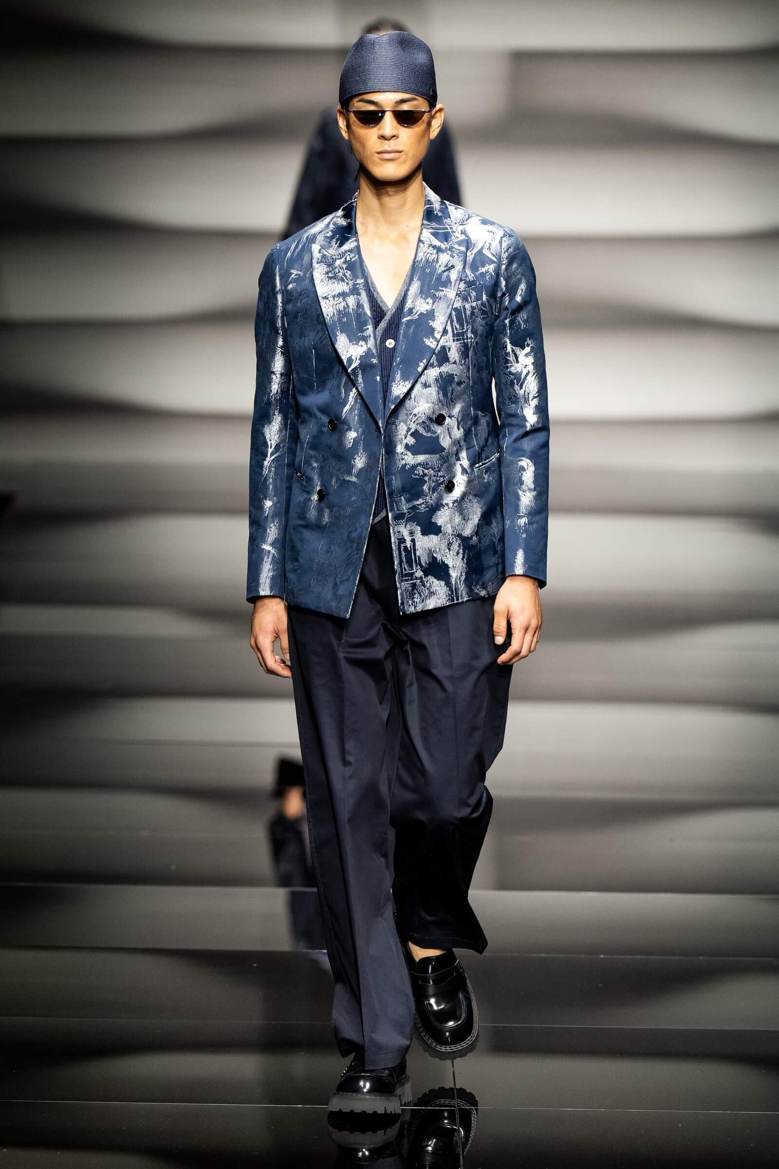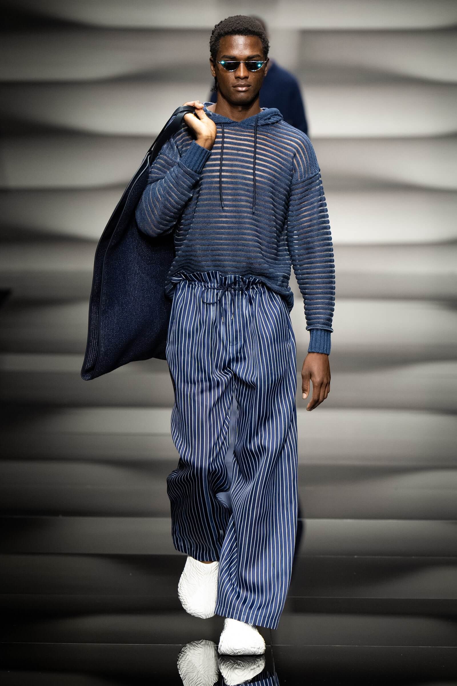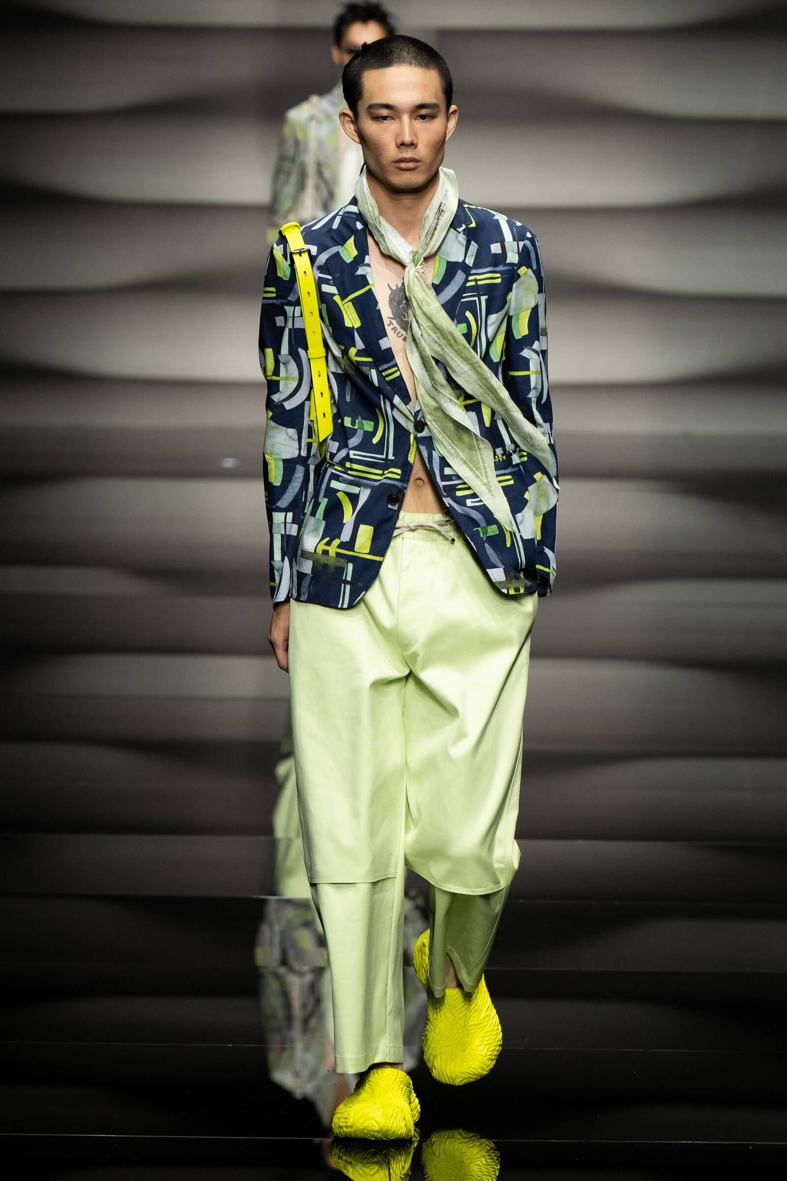 Amongst the 93 looks were jacquard blazers and black-tie tuxedos, which walked alongside easy-going, pinstripe tunic tops, wide-leg trousers slashed open at the thigh and hoodies laden with painterly brush strokes in signature Armani blues. A section EA7 sportswear – double zip track jackets, mesh vests, navy track shorts – made way for hedonistic shades of lime green and pistachio across carefree summer tailoring, ideal for open air parties and sunkissed cocktail hours at the beach.