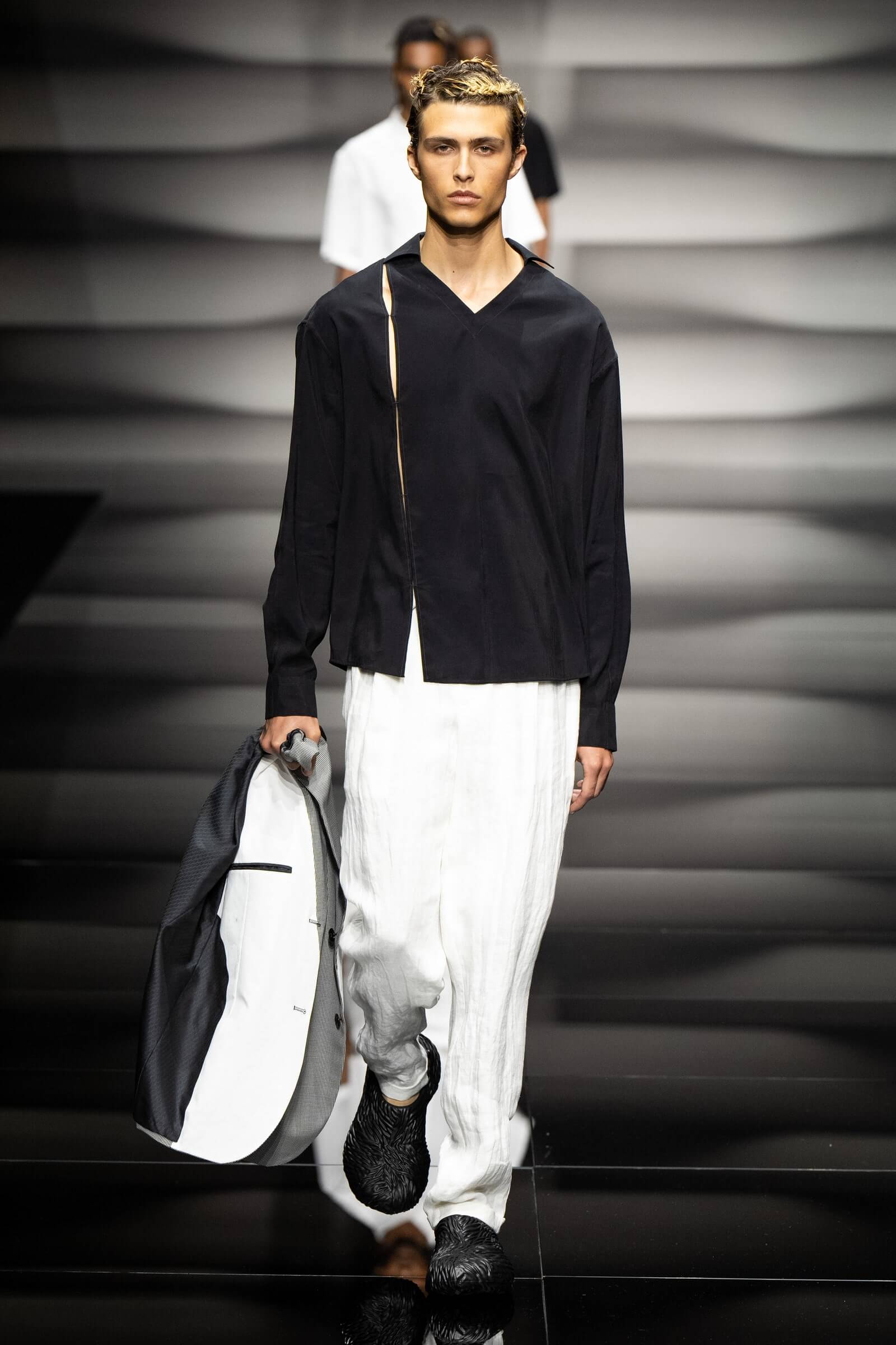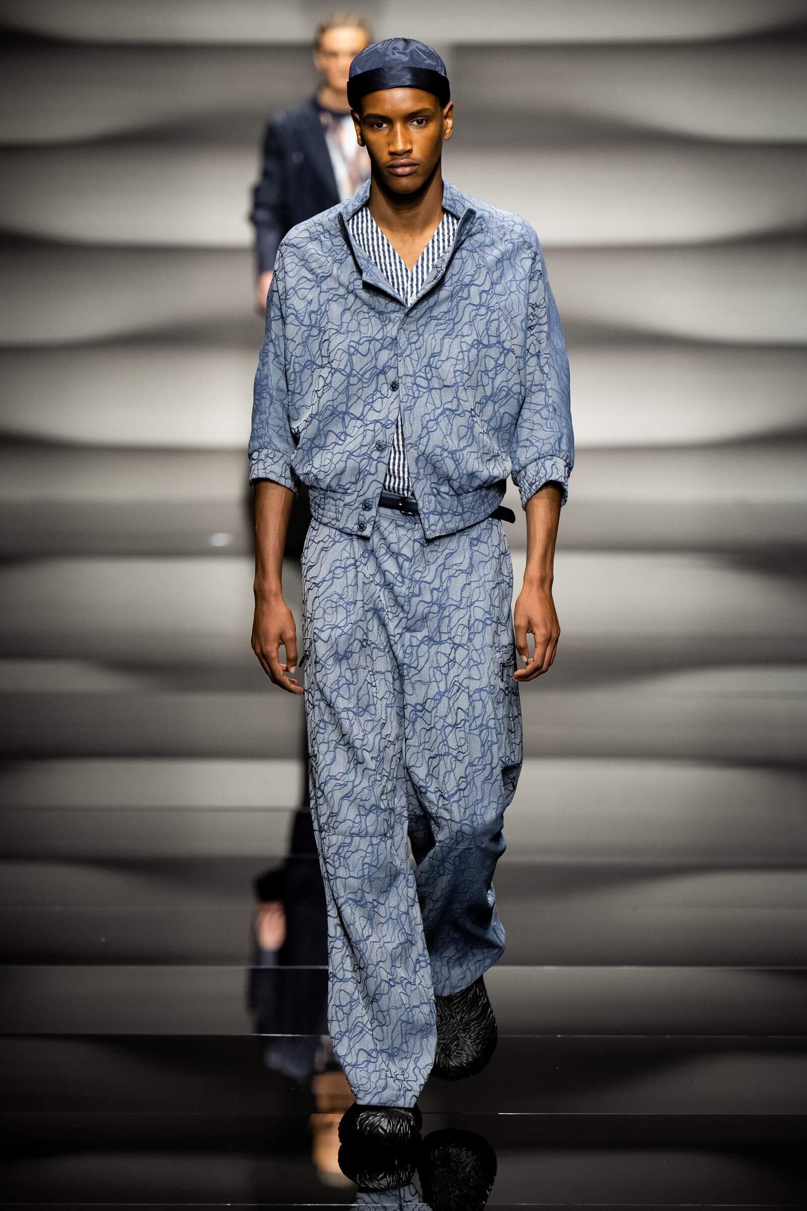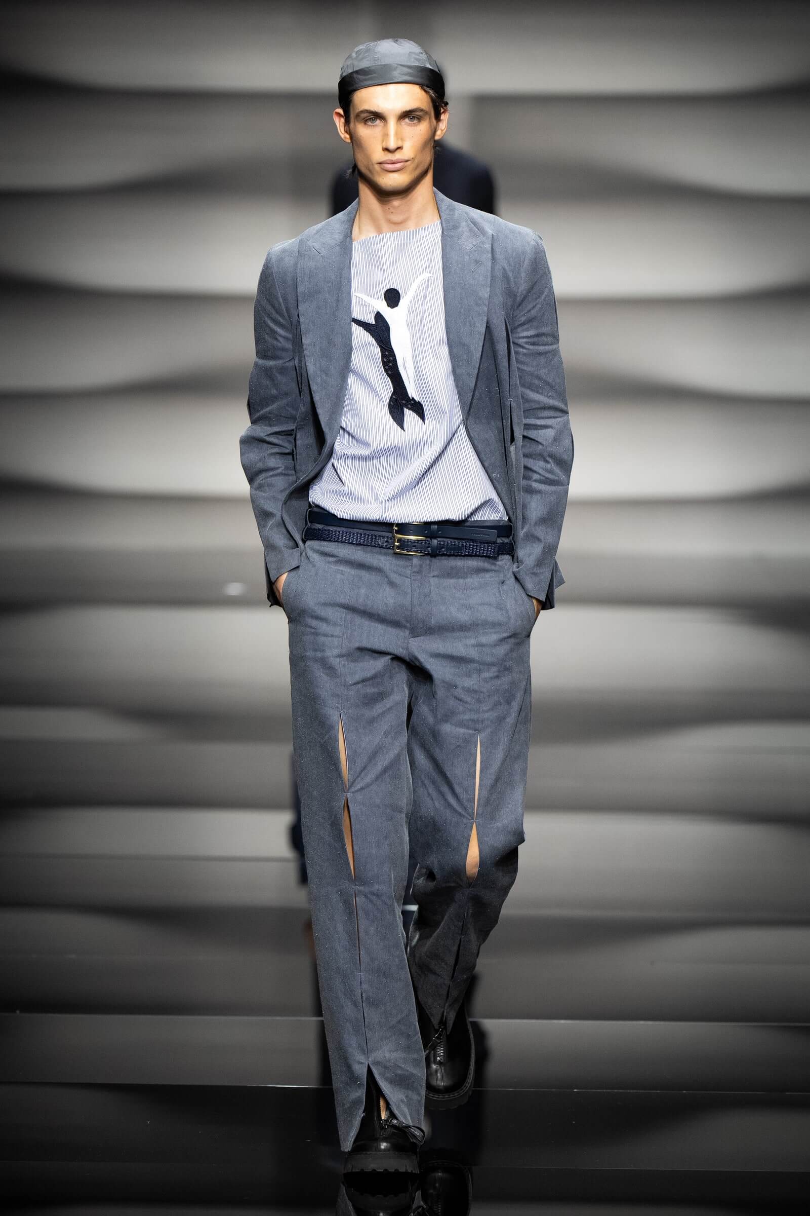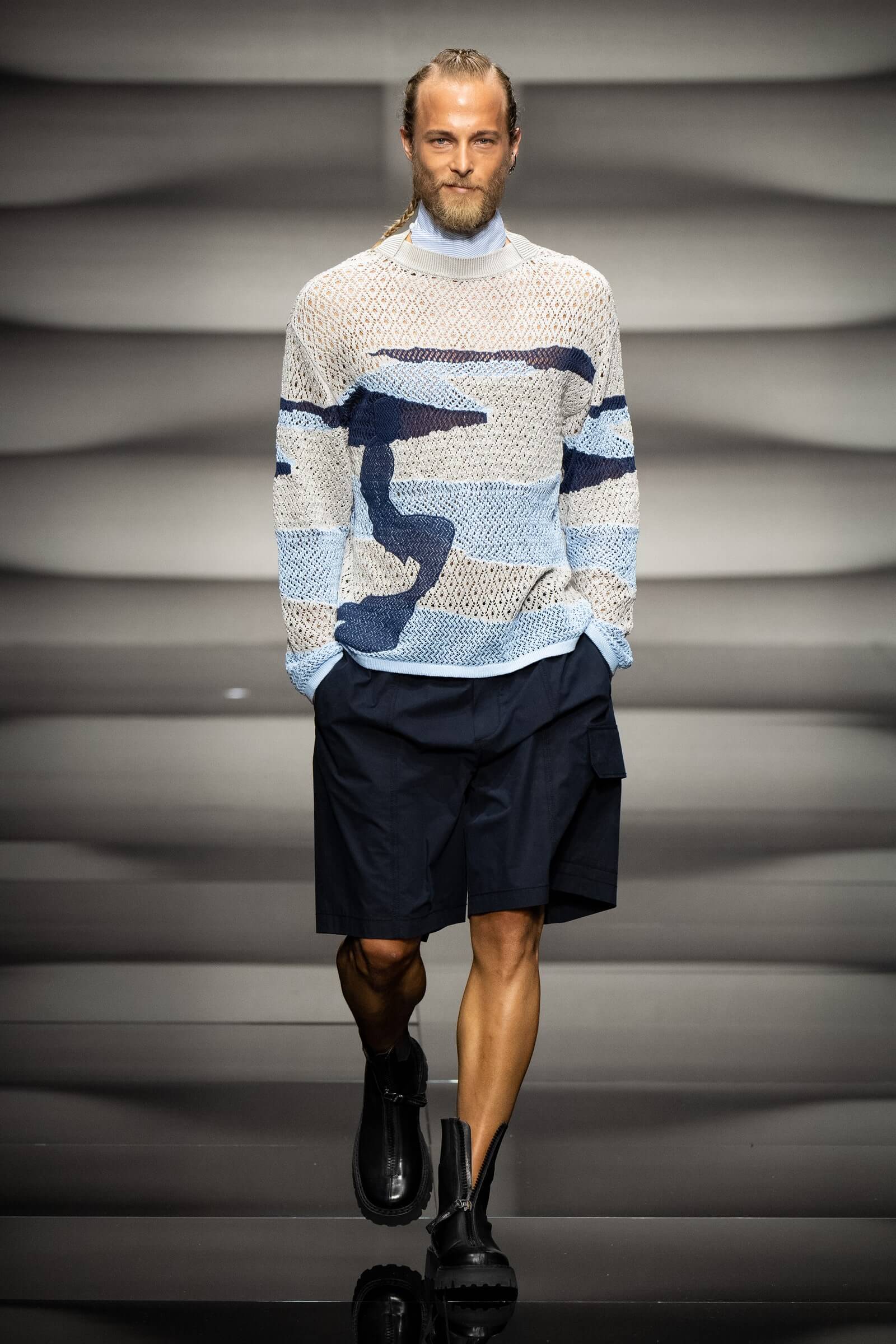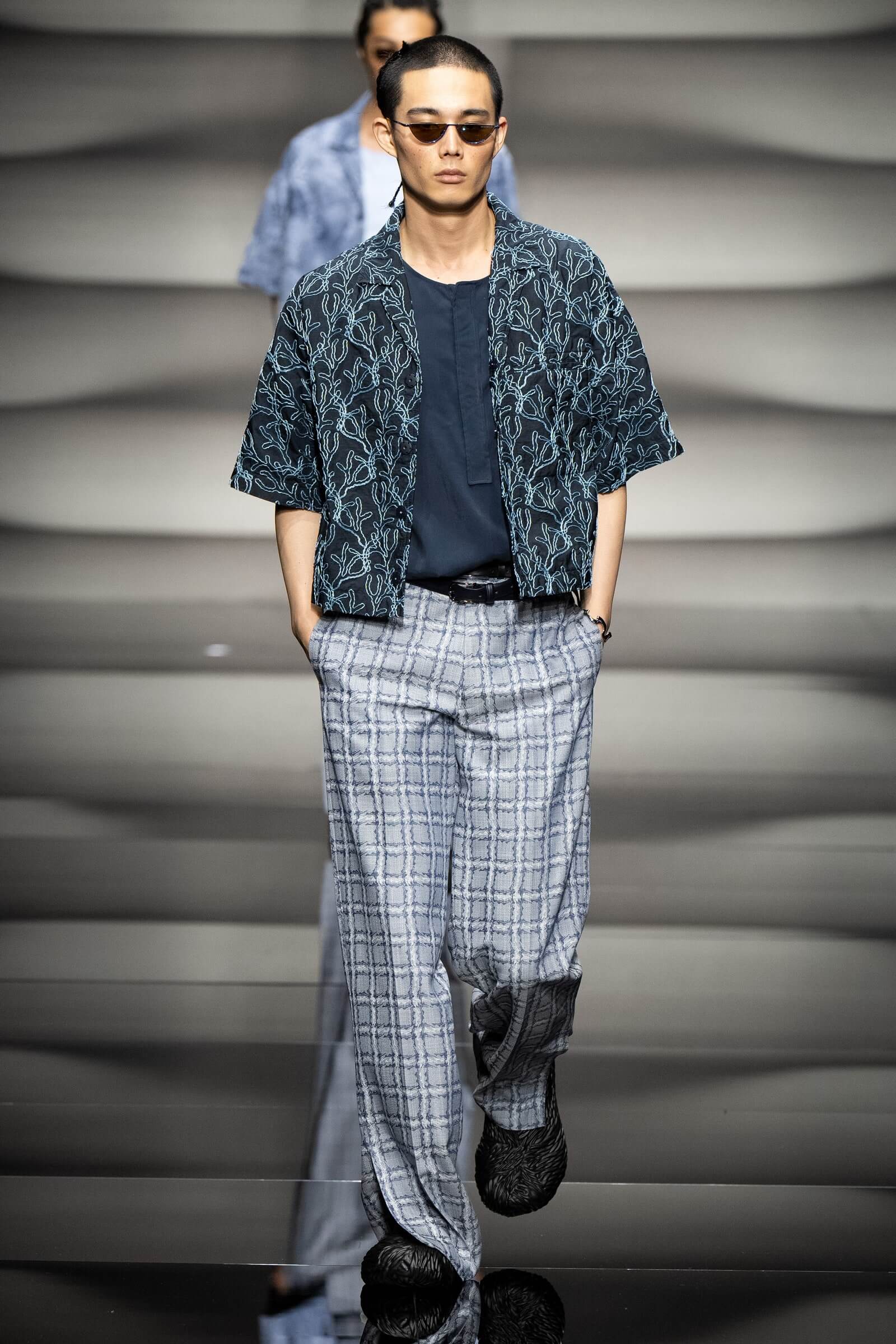 Amongst the 93 looks were jacquard blazers and black-tie tuxedos, which walked alongside easy-going, pinstripe tunic tops, wide-leg trousers slashed open at the thigh and hoodies laden with painterly brush strokes in signature Armani blues. A section EA7 sportswear – double zip track jackets, mesh vests, navy track shorts – made way for hedonistic shades of lime green and pistachio across carefree summer tailoring, ideal for open air parties and sunkissed cocktail hours at the beach.