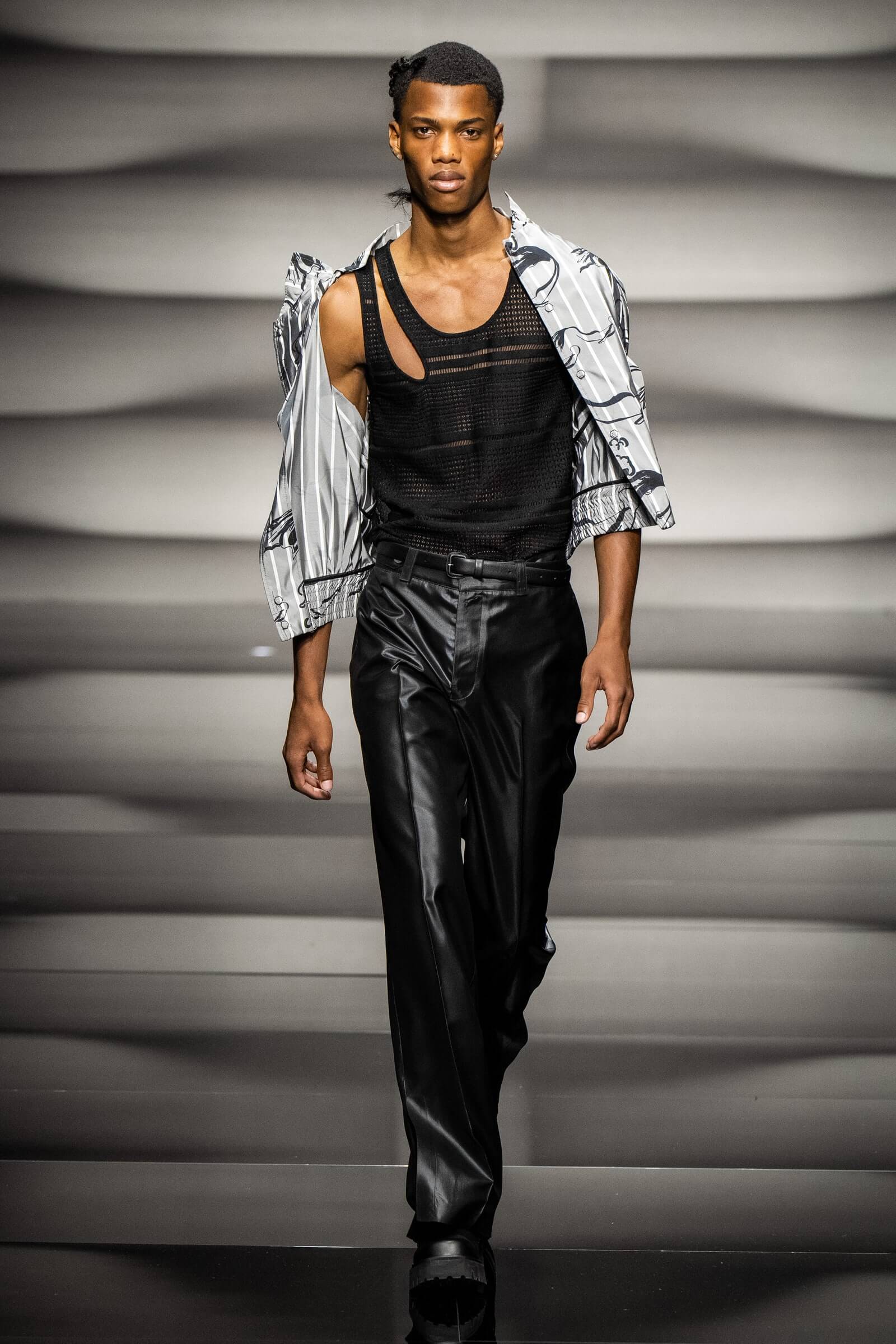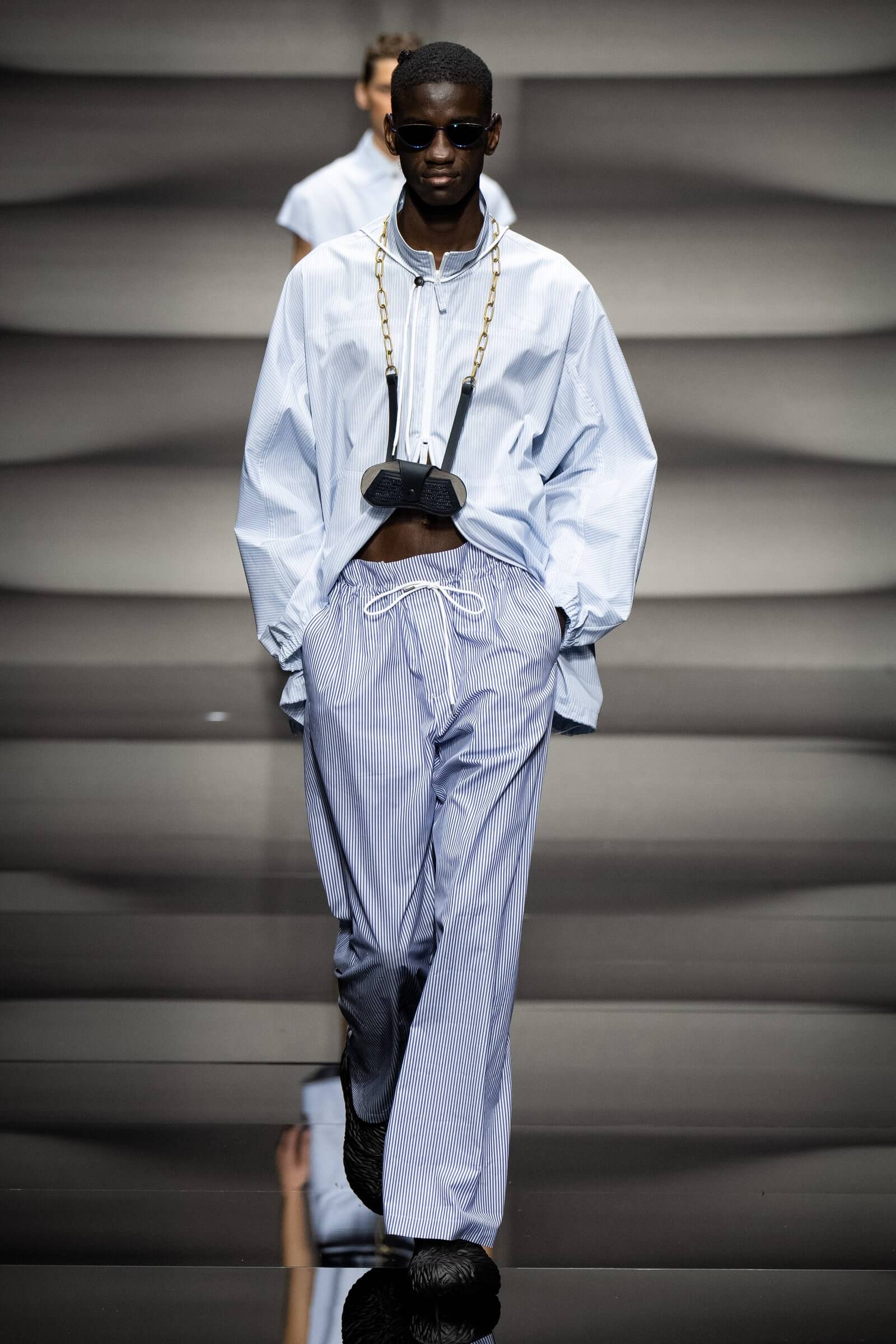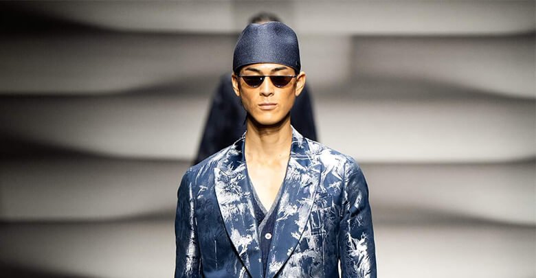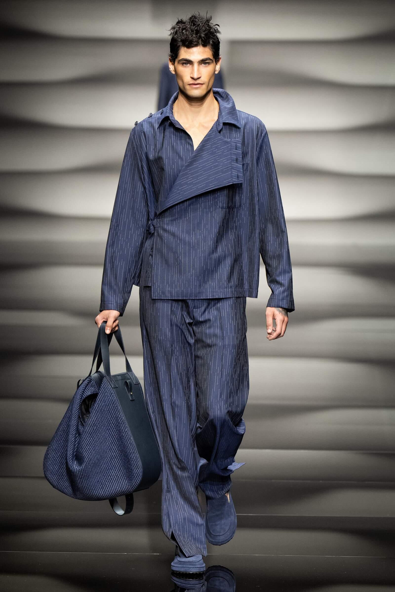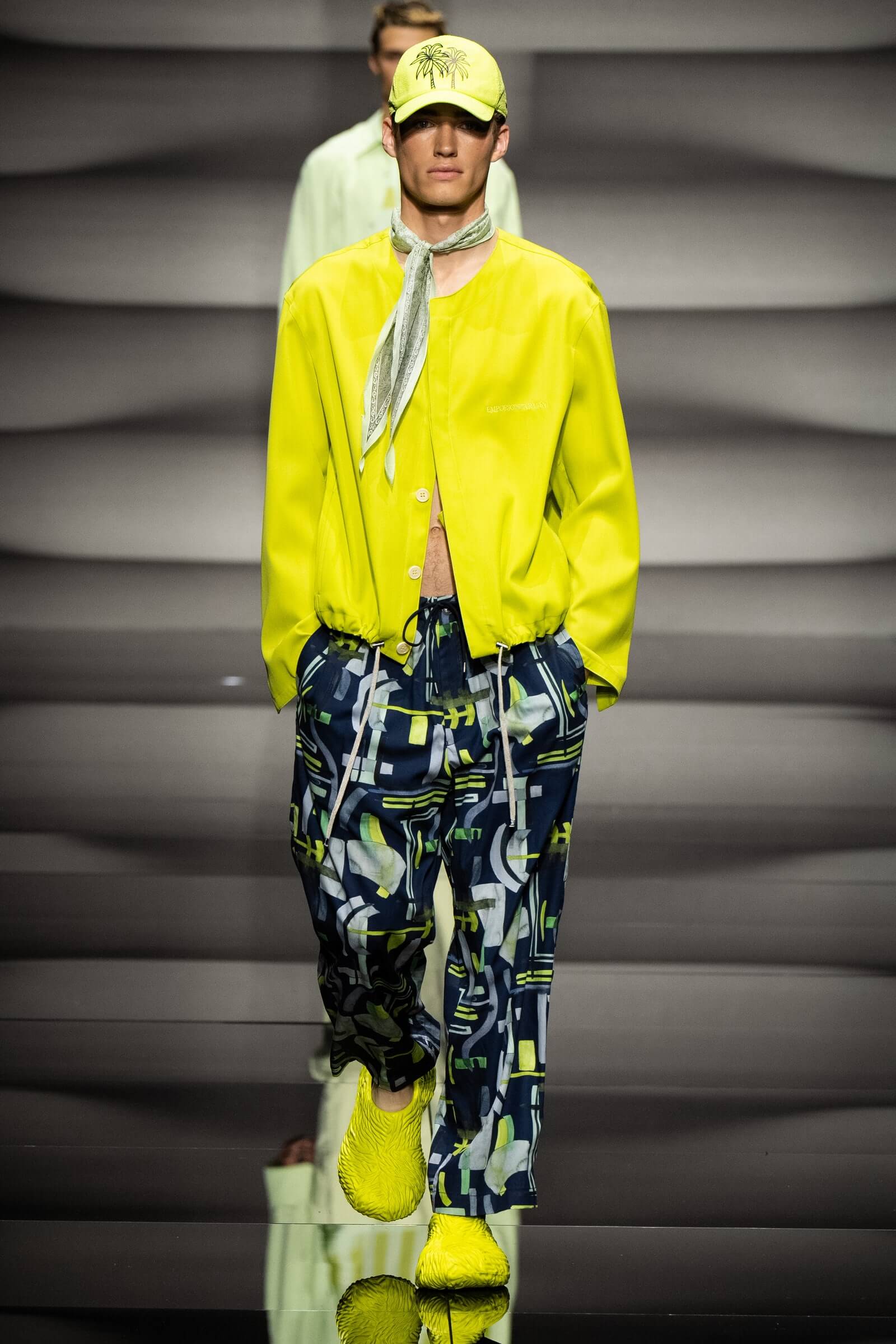 Amongst the 93 looks were jacquard blazers and black-tie tuxedos, which walked alongside easy-going, pinstripe tunic tops, wide-leg trousers slashed open at the thigh and hoodies laden with painterly brush strokes in signature Armani blues. A section EA7 sportswear – double zip track jackets, mesh vests, navy track shorts – made way for hedonistic shades of lime green and pistachio across carefree summer tailoring, ideal for open air parties and sunkissed cocktail hours at the beach.