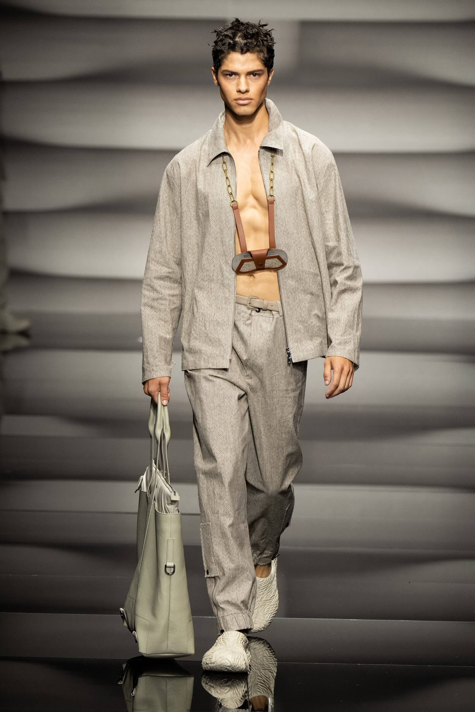 This season’s Emporio Armani men’s show began with the shoes. Dubbed The Wave, these molded rubber concoctions derived their off-kilter proportions from the texture of a weaved basket. Much like the collection itself, they proved Mr Armani as no one trick pony; a maestro of classicism and refinement, angled more so now at a youthful customer.
