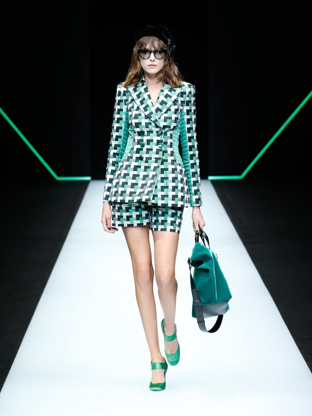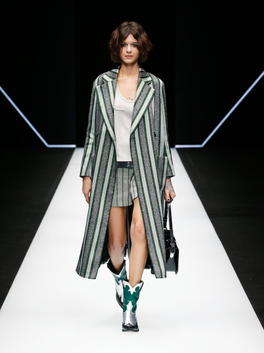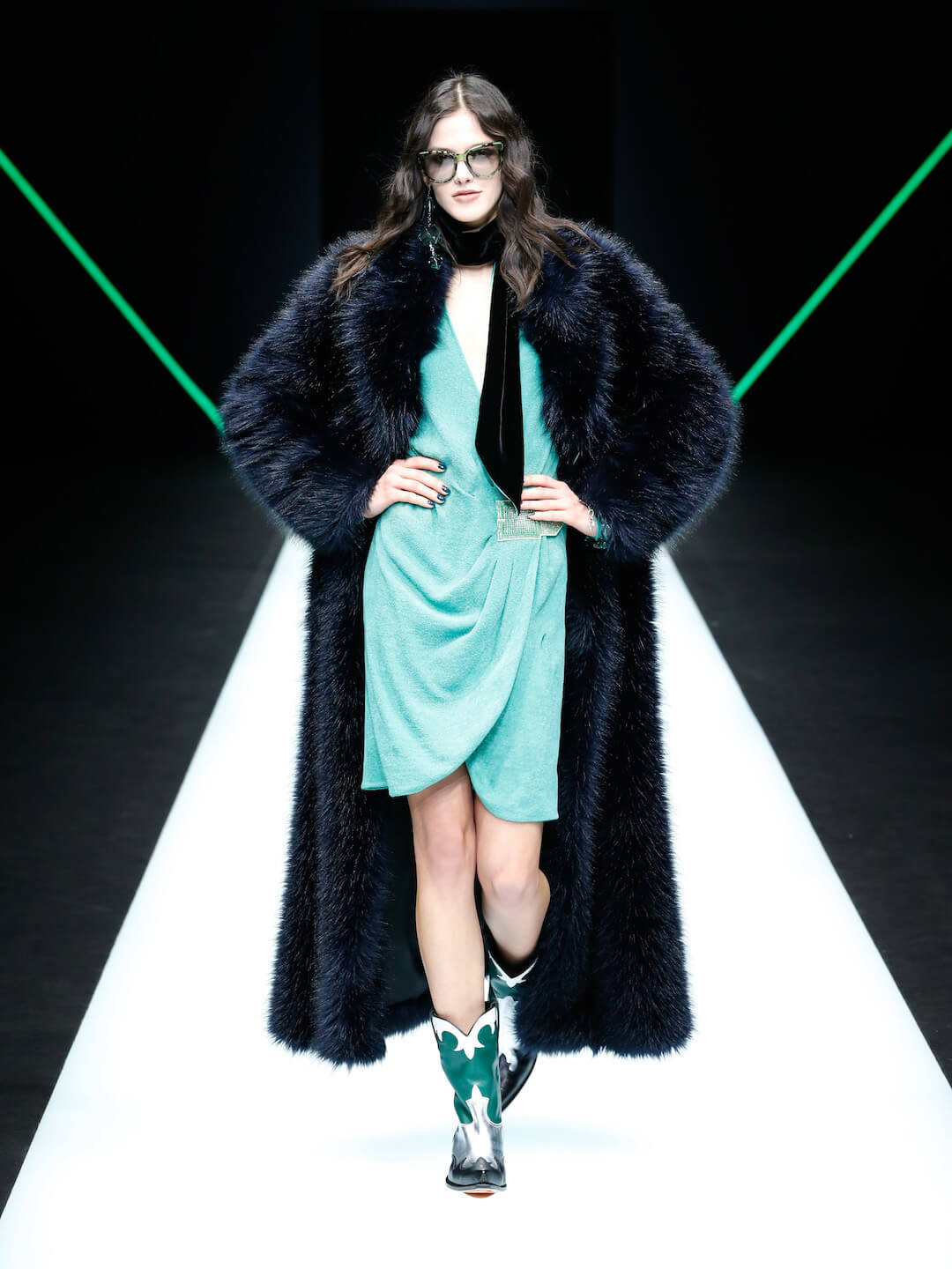 Green meant go hard or go home infused into metallic emerald cowboy boots, cross body bags and in your face EA branded belts. Showing them who’s boss. The men were in the bedrock grey knee length jumpers and coats and lush velvets. There was a swift sharpness to each piece, the Armani signature of precision and utmost quality shining. Sweeping deep metallic green eyeshadow elevated this girl into new realms, partying on Cloud 9 to Mr Armani’s playlists. Today that included Candi Stations’ ‘You Got the Love’ a spot on surge of sureness that was felt through the whole collection. Confidence, no limits.