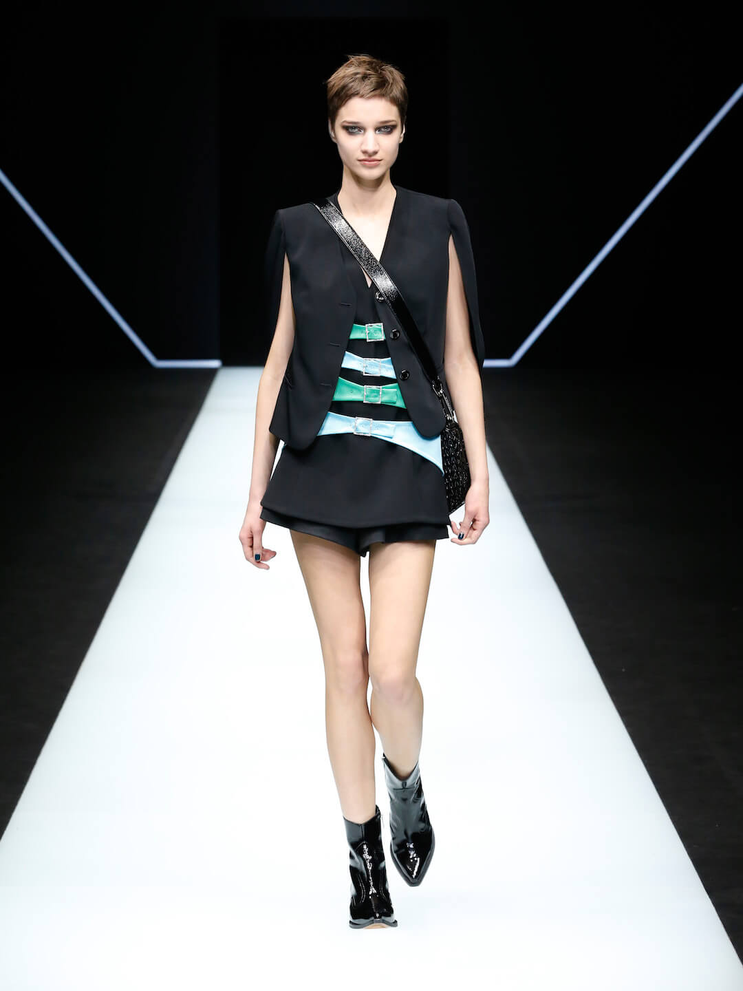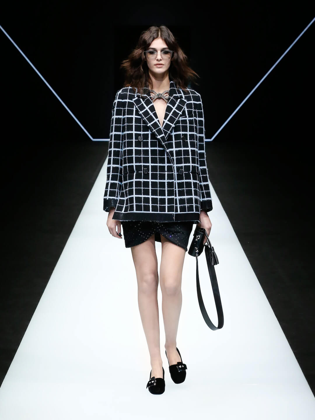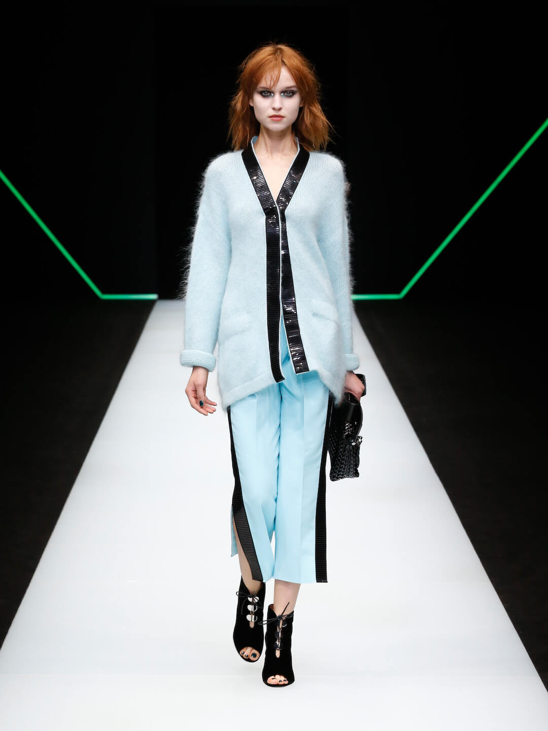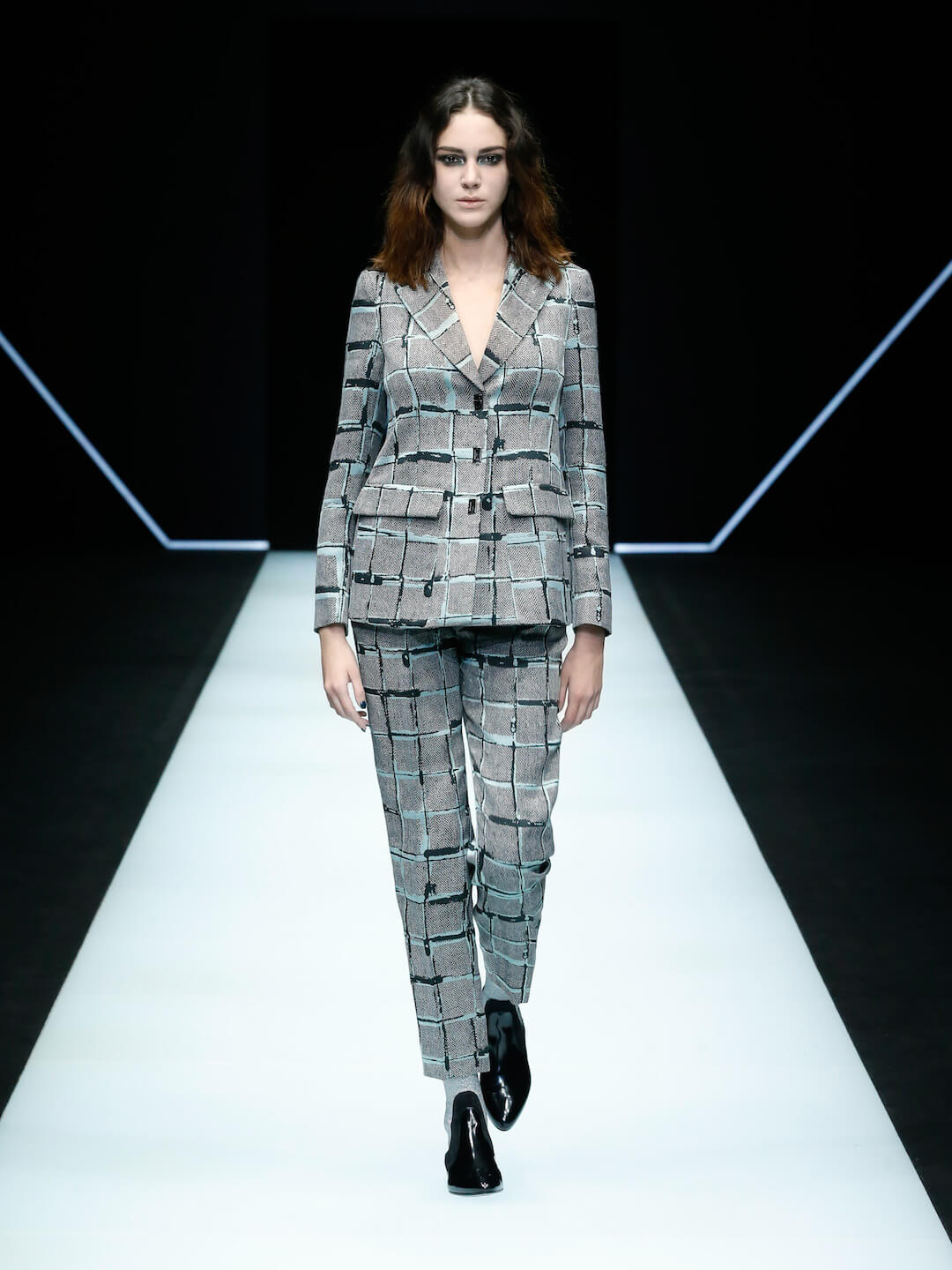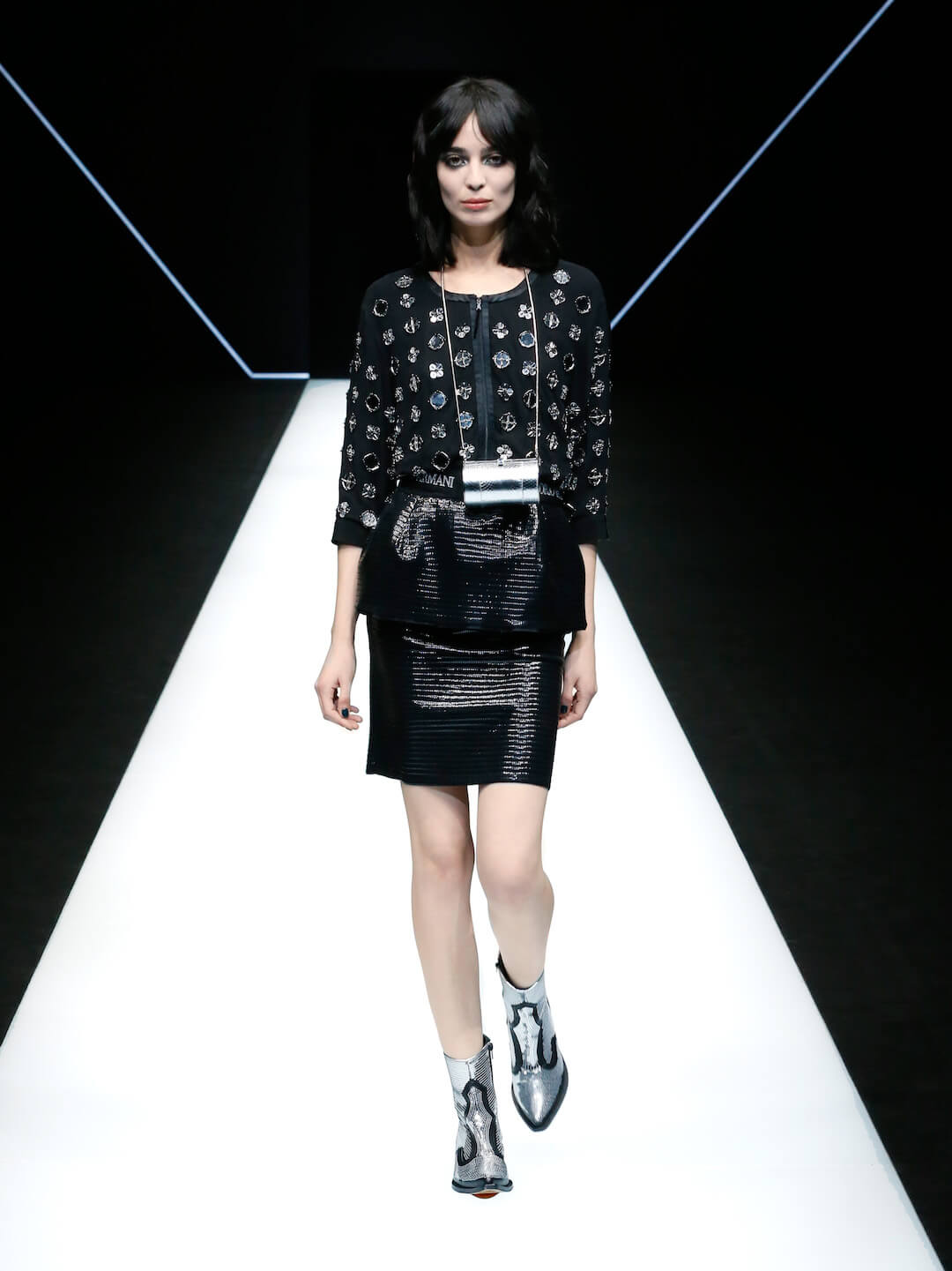 The Emporio Armani girl came to play ‘tonight’, in a show entitled ‘Post Meridiem’. She brought the sass, a whole lotta love and some damn good looks. “I enjoy watching people, bringing into my world the spirit of what I see around me, processing and reinventing it. Today everything gets mixed up, rules have been turned upside down. That’s the freedom I wanted to capture in this collection,” Mr Armani said. There was an air of liberation happening here, girls walking out of the pitch blackness inside the neon Emporio Armani logo and into the light. It was right for the night but so ready for the day. Mini tailored double breasted patterned suits moved so smoothly, precise, dresses were the appropriate amount of party and classy. Nice. A baby blue silk organza suit softly boomed, sleek black satin suits were fitted, sweatshirts with sequins and mirrored discs shimmered into the night. Accessories were on fire.