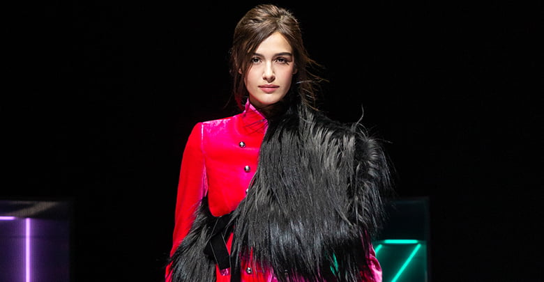 Set against a neon-laden backdrop spelling out the brand’s name, there was an air of fluidity to these looks, where pops of colour accented soft, grey tailoring and jacquard eveningwear. “I like to use bold colours, especially in Emporio,” concurs Mr Armani. “I choose them as notes that catch the eye.” Slithers of pink and purple slash through dominating greys and blacks, as a reference to the neon lights of a city skyline – “the ideal scenario that fuels my inspiration for the Emporio Armani woman and man,” he says.
