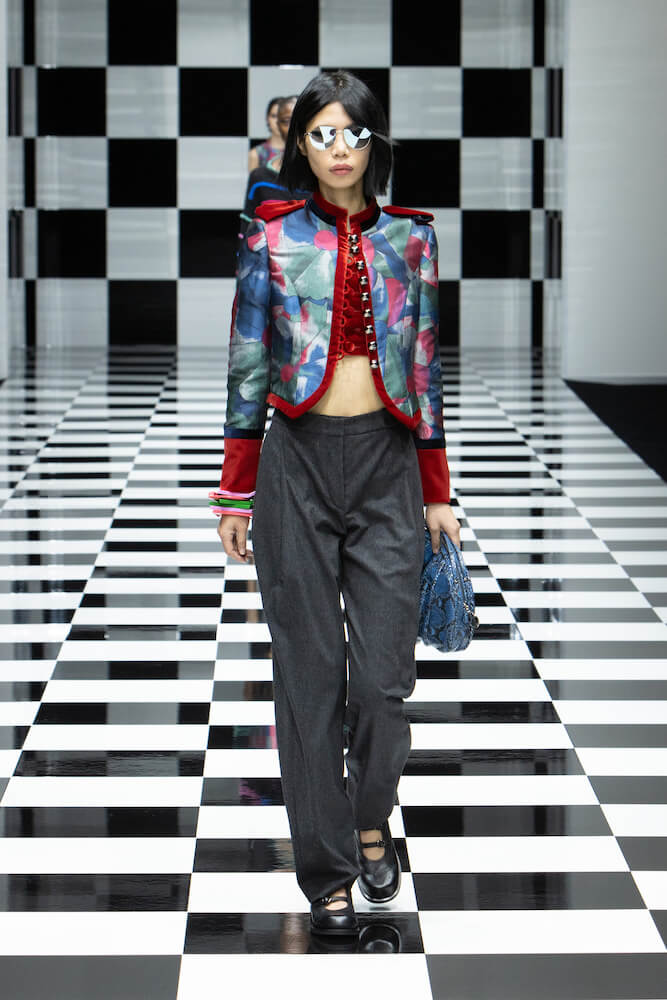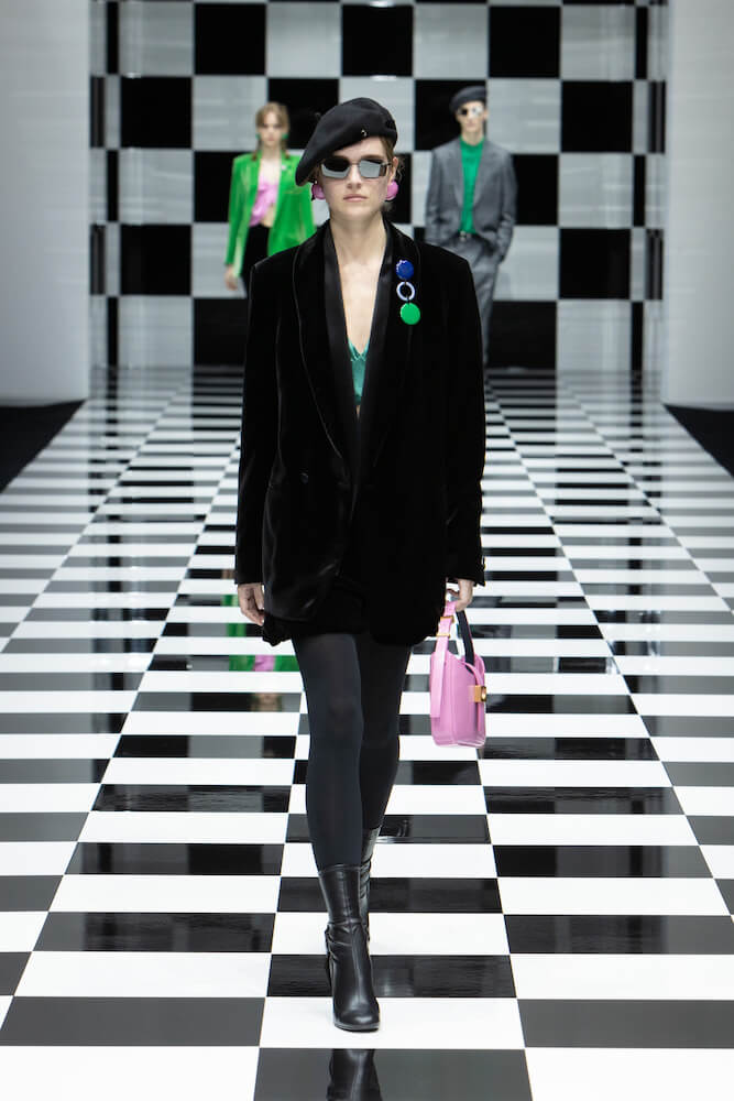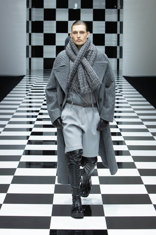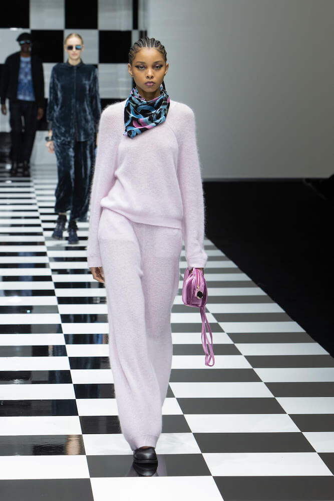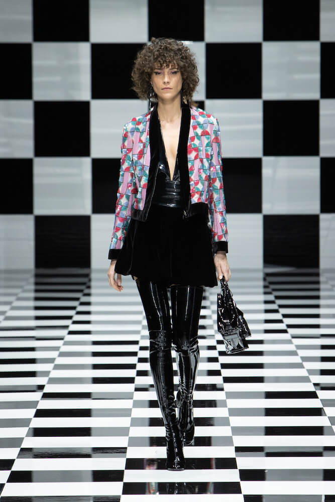 So, better get set as the Emporio Armani world for AW22 will be a silvery one, with an abundance of the softest wool cashmere, super supple leather boots as leggings and cheeky party dresses. Mr. Armani likes to party; he has a tiny club in the basement underneath Nobu. He is a silver fox you see. Hot pink and abstract cubist/1980s patterns, a bit Memphis Studio, sashayed on micro short dresses and brought a playfulness to this soiree.