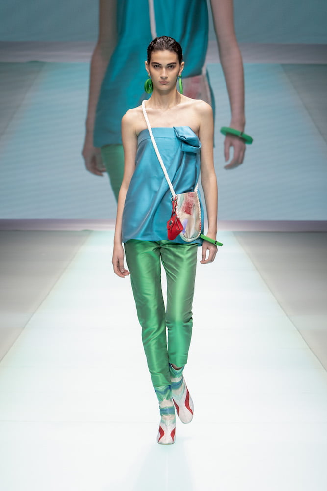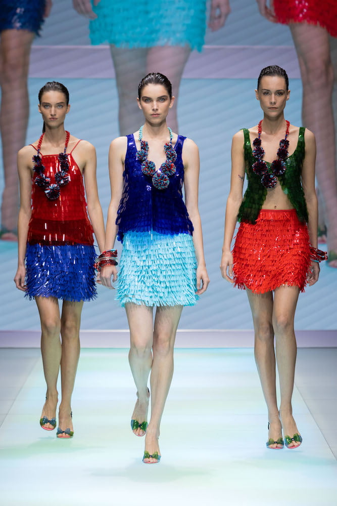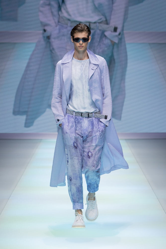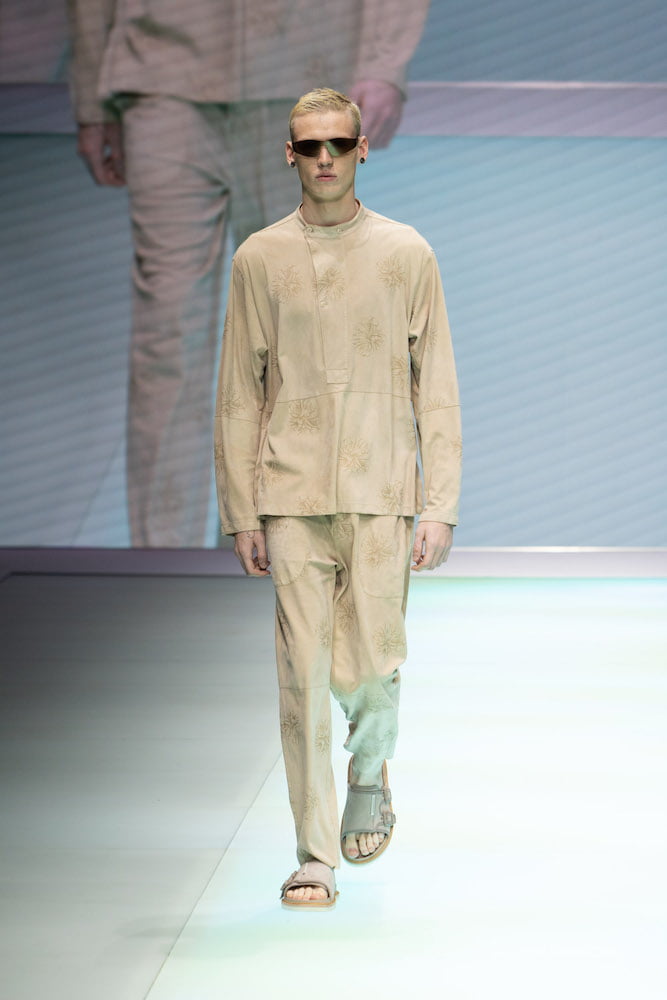 Of course, there were sections devoted to his signature navy and griege – the tasteful non-colour that Armani champions – but there were also watercolour prints for women, palm prints for men and vivid tropical greens and blues for both. The show ended with glistening sequin vests and mini-skirts. Pared but down impactful, it was very Armani.