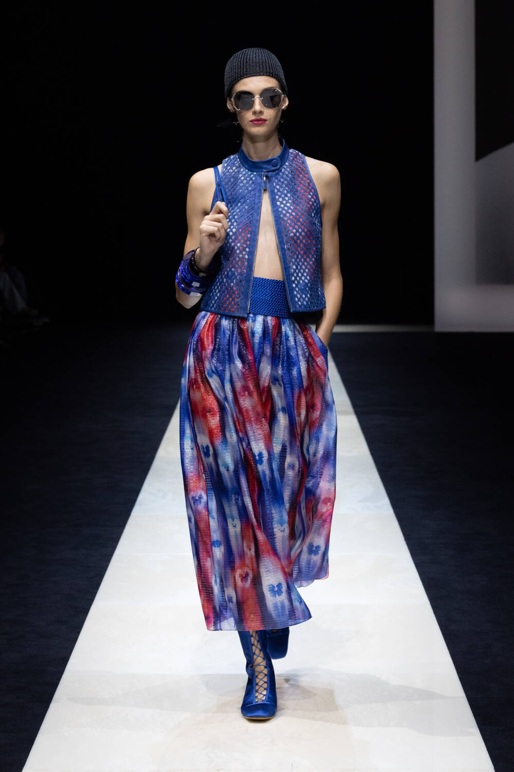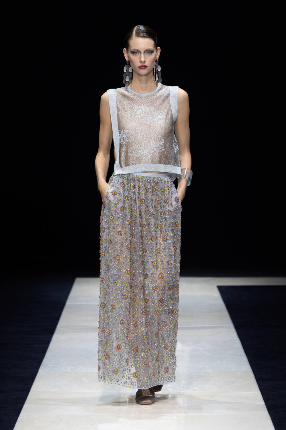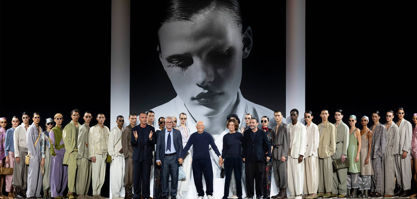 Like a balancing act between masculine and feminine dress codes, the SS25 Emporio Armani show proved that anybody can wear a suit. Key to the collection, Mr Armani dressed his girls in soft men’s blazers with satin trousers, sleek ties and square-toe ballet flats serving up an elegant expression of rebellious style. They also wore riding breeches, elongated skirts and airy summer dresses, sometimes sculpted by wrap-around sashes, and paper-bag trousers in watercolour-like prints, often paired with crochet and knit flat caps or Hepburn-esque wide-brimmed hats. Jackets were soft and free-falling. Blousons, parkas and trench coats finished off the looks.