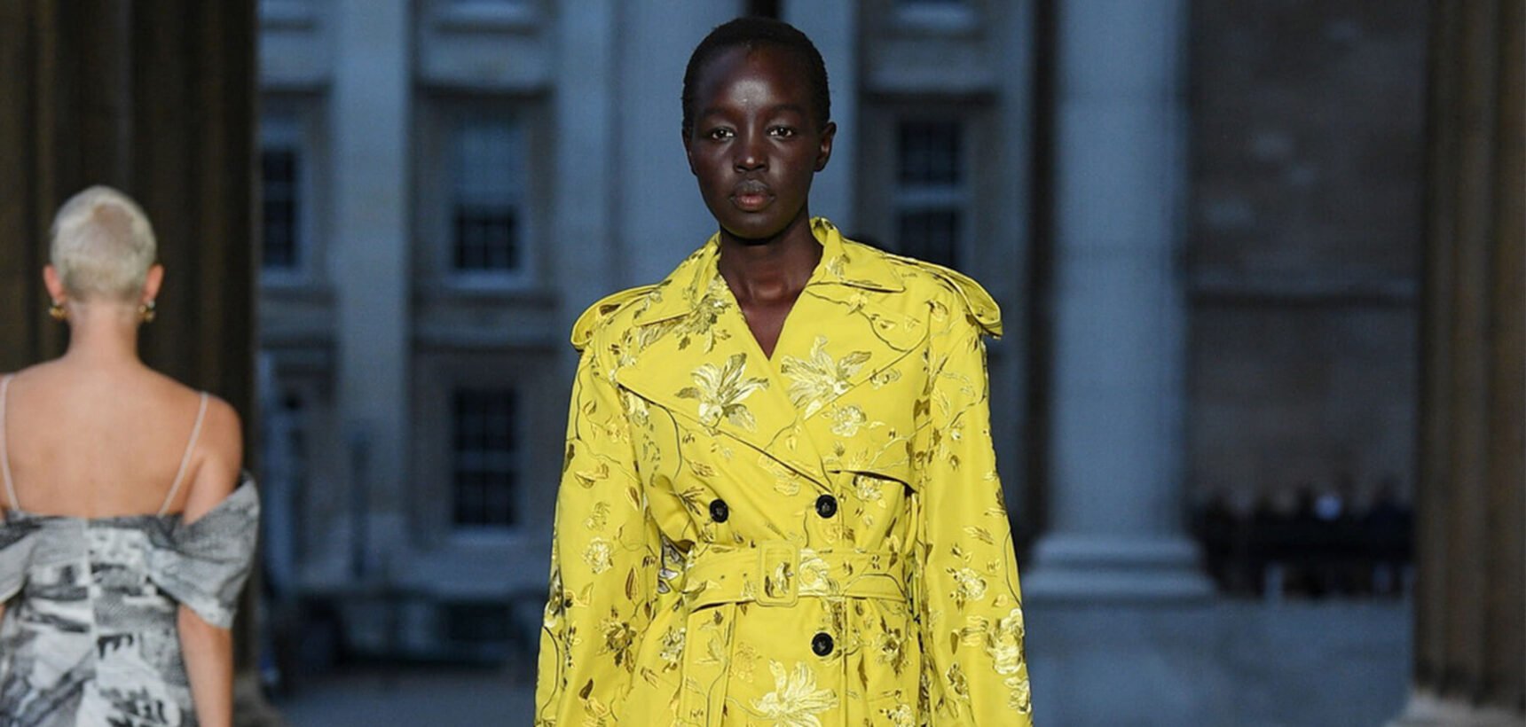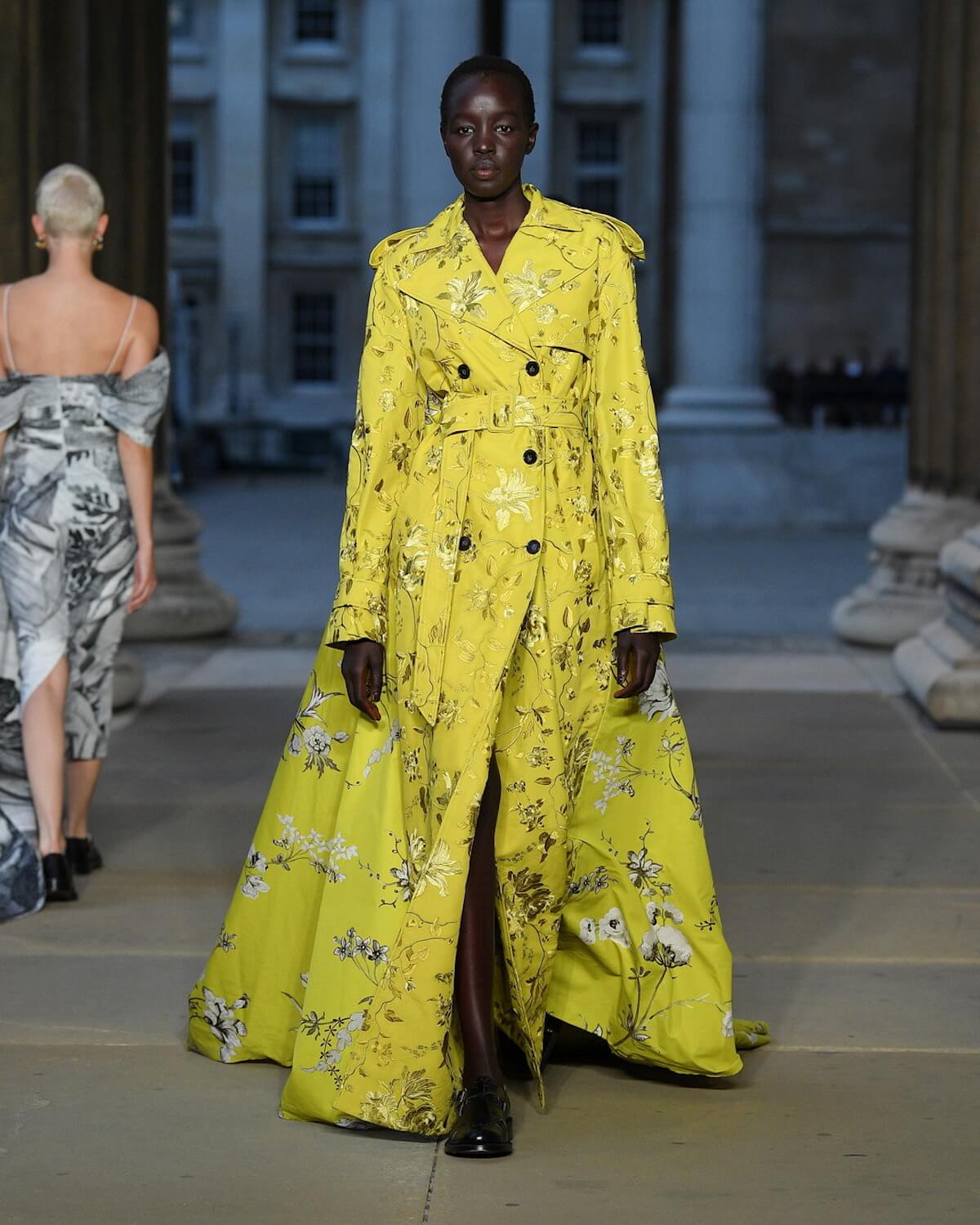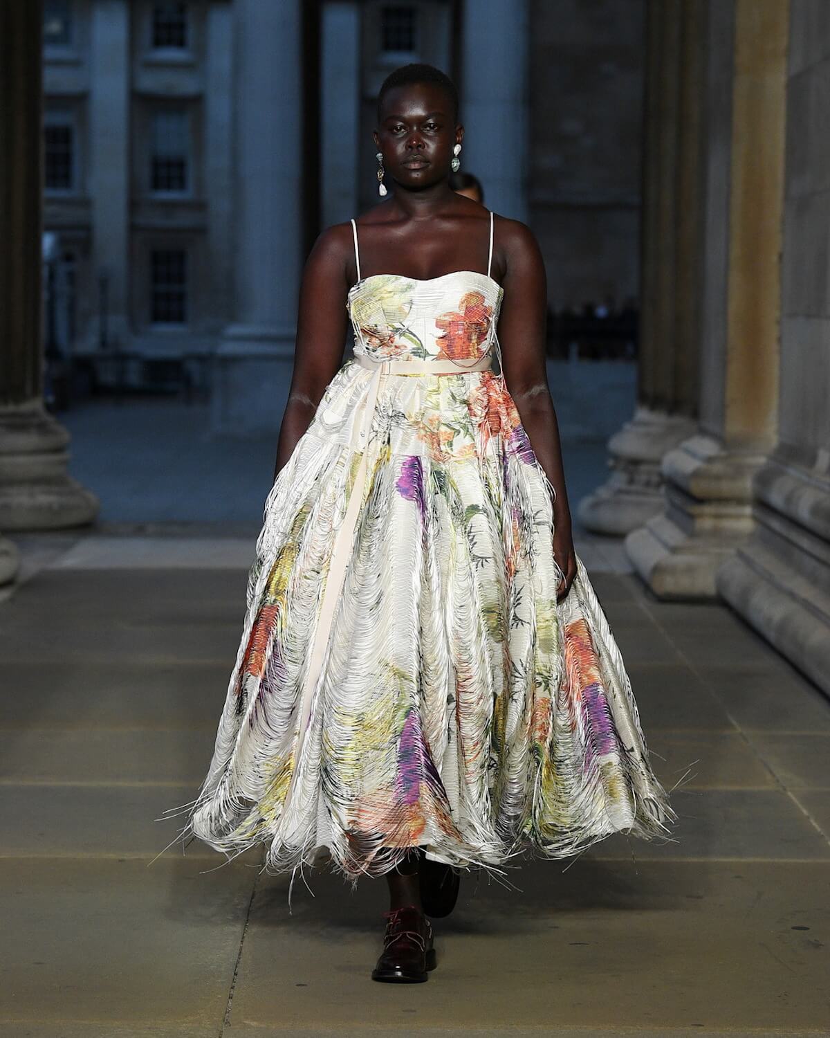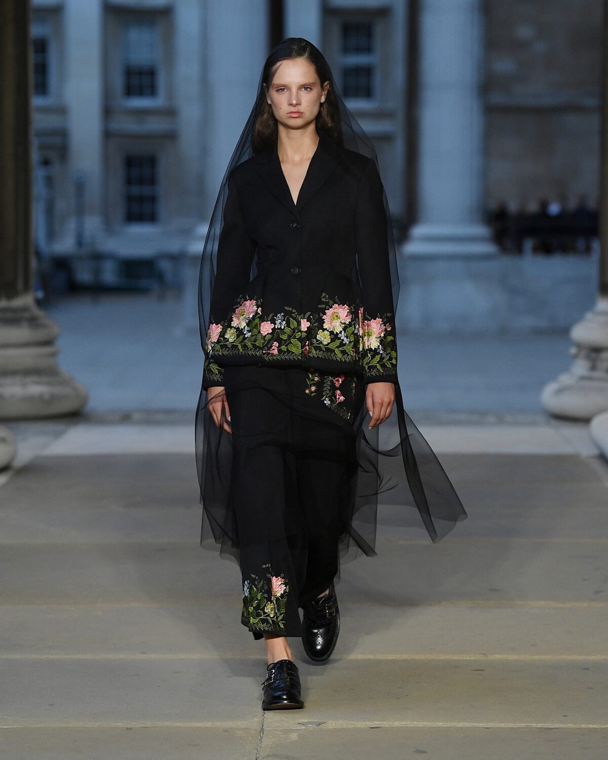 The first model strode out in a strict black fifties skirt suit, embellished with vivid floral embroidery at the hem. A black tulle veil – the show was on the eve of The Queen’s funeral – gave it a sombre elegance. Then Erdem worked his magic. His silhouettes jumped across fashion eras from renaissance via the twenties and fifties. His skills in the atelier were on display with romantic faded brocades, artfully shredded onto seeping duster coats and gowns.
