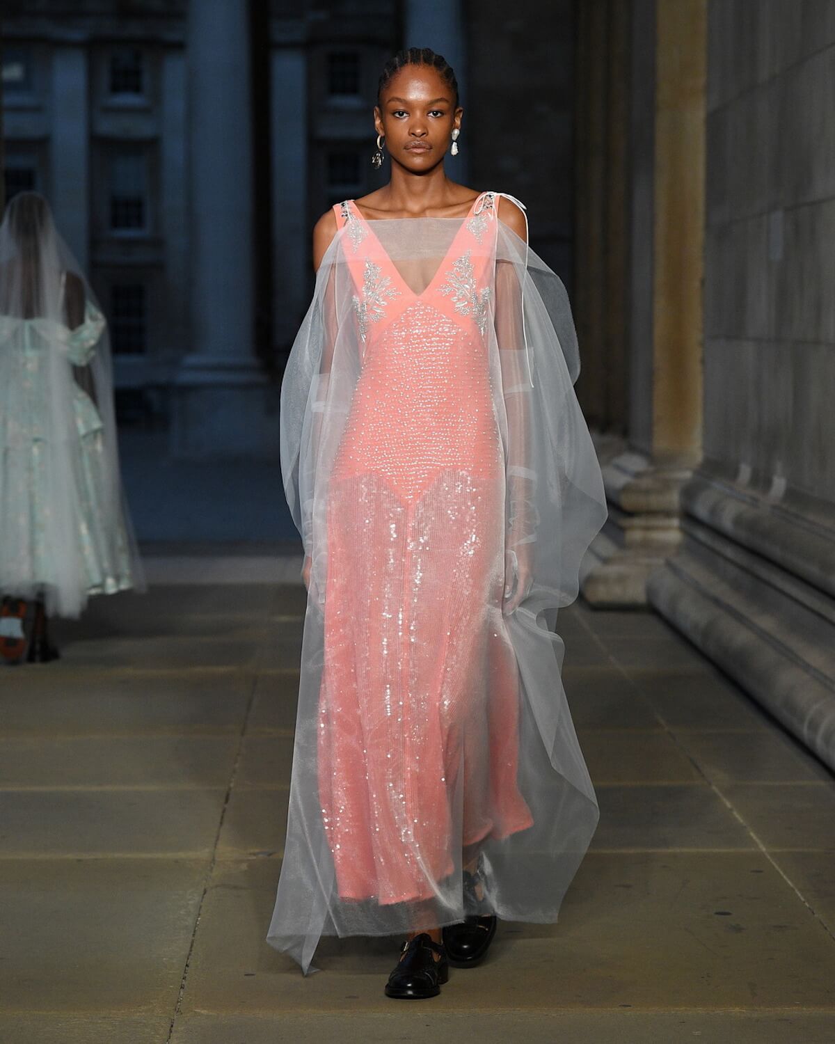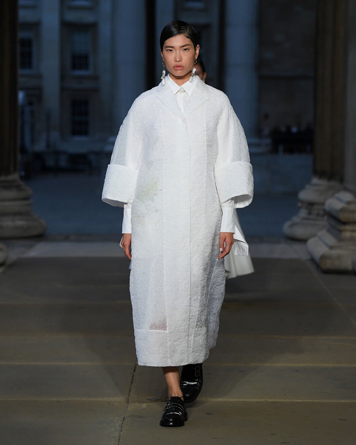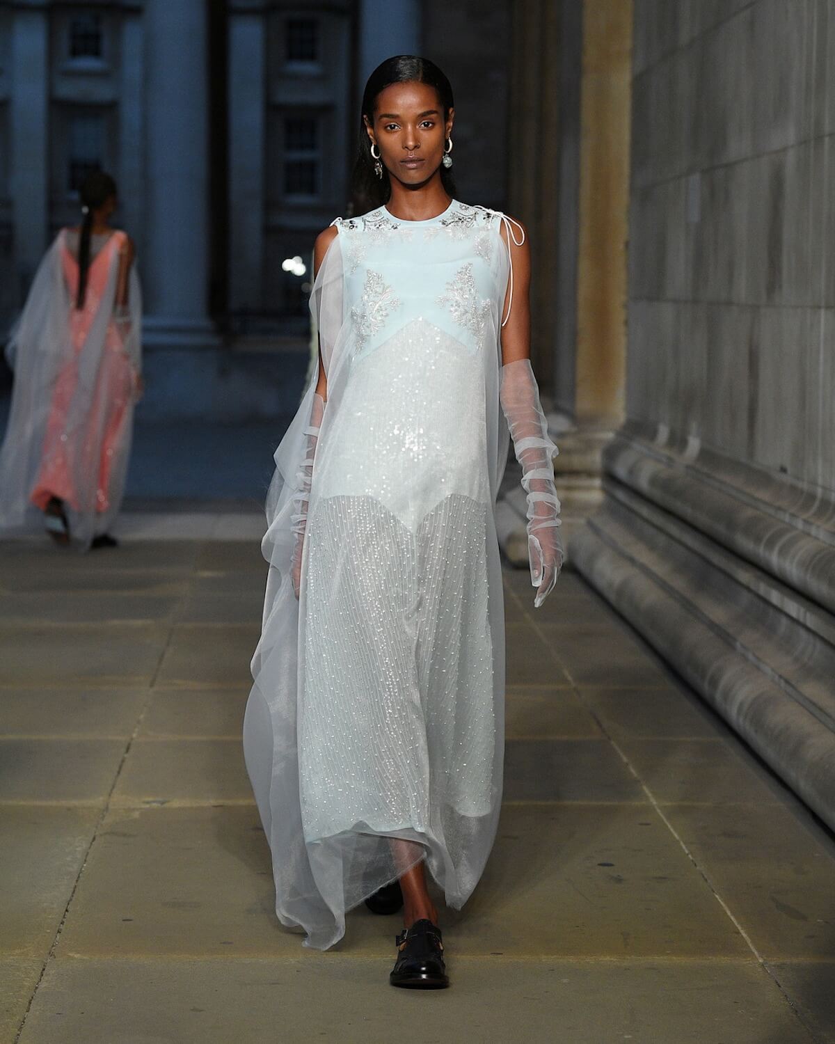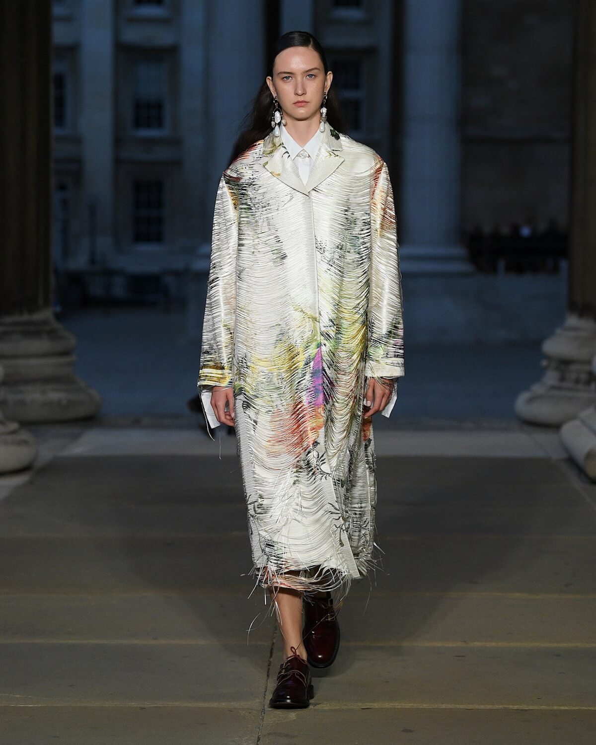 The first model strode out in a strict black fifties skirt suit, embellished with vivid floral embroidery at the hem. A black tulle veil – the show was on the eve of The Queen’s funeral – gave it a sombre elegance. Then Erdem worked his magic. His silhouettes jumped across fashion eras from renaissance via the twenties and fifties. His skills in the atelier were on display with romantic faded brocades, artfully shredded onto seeping duster coats and gowns.