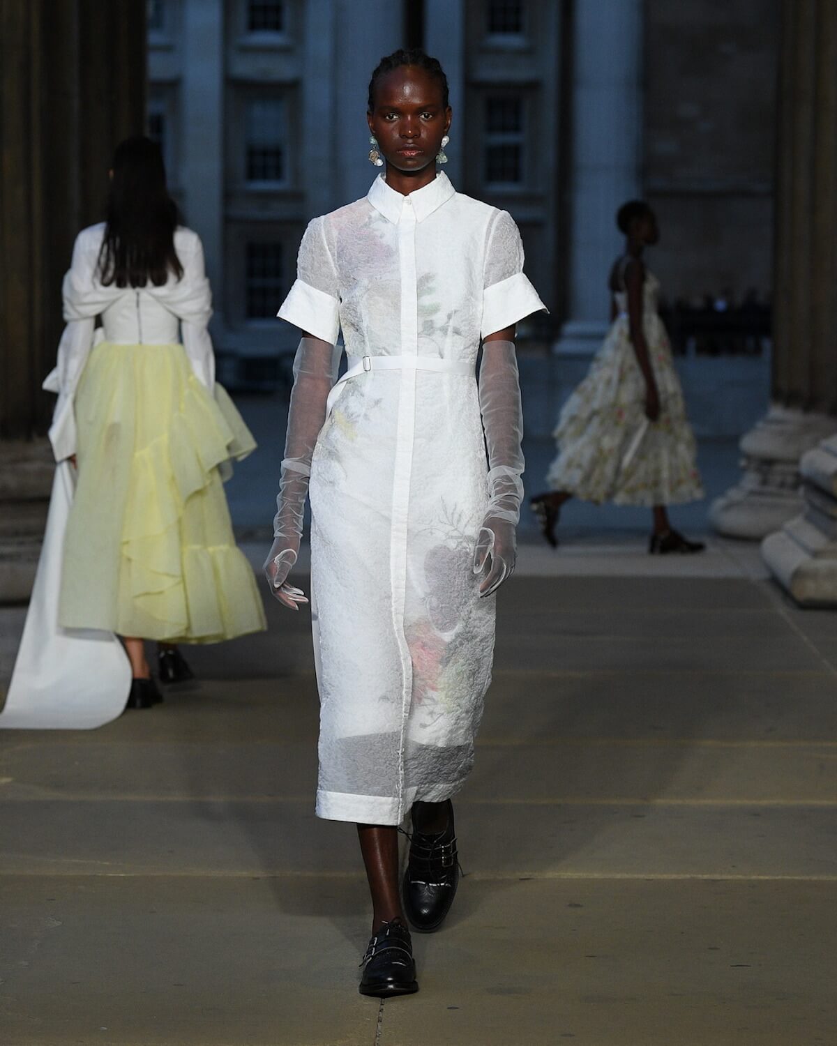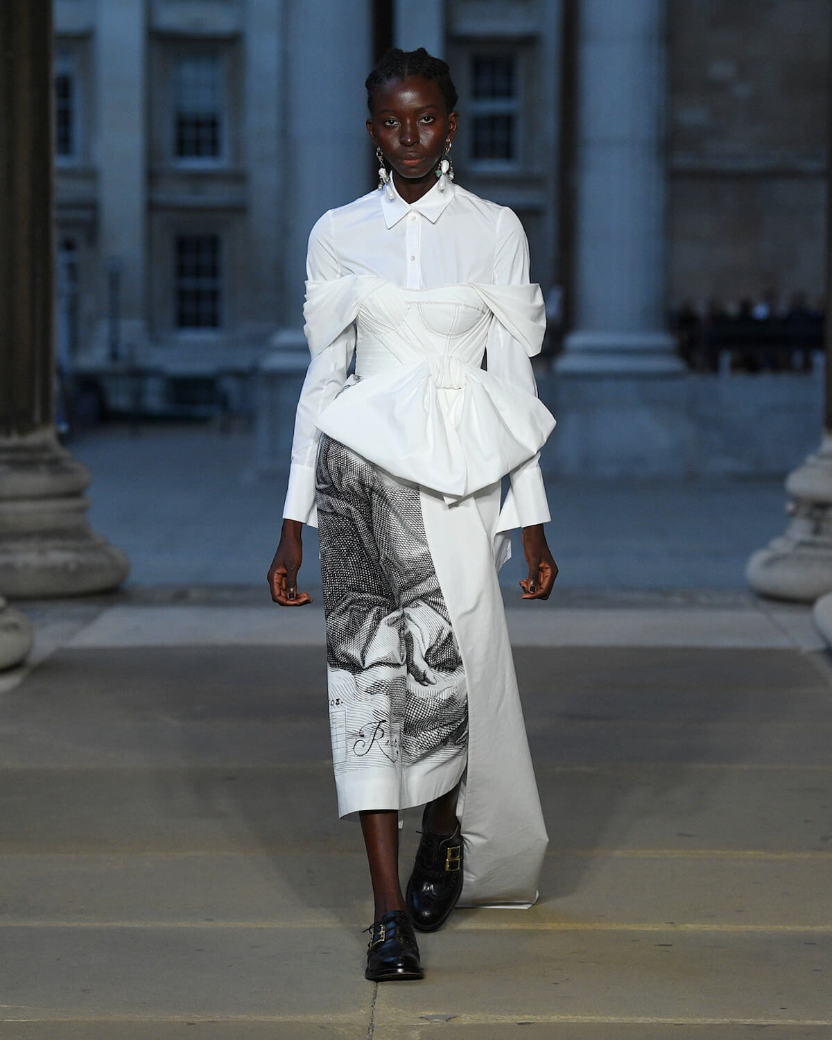 Old master etchings we’re blow up and collaged into prints, florals were patch-worked into corsets and ballerina length dresses. Crisp white shirting and mannish lace-ups tempered the femininity and made it all feel contemporary.