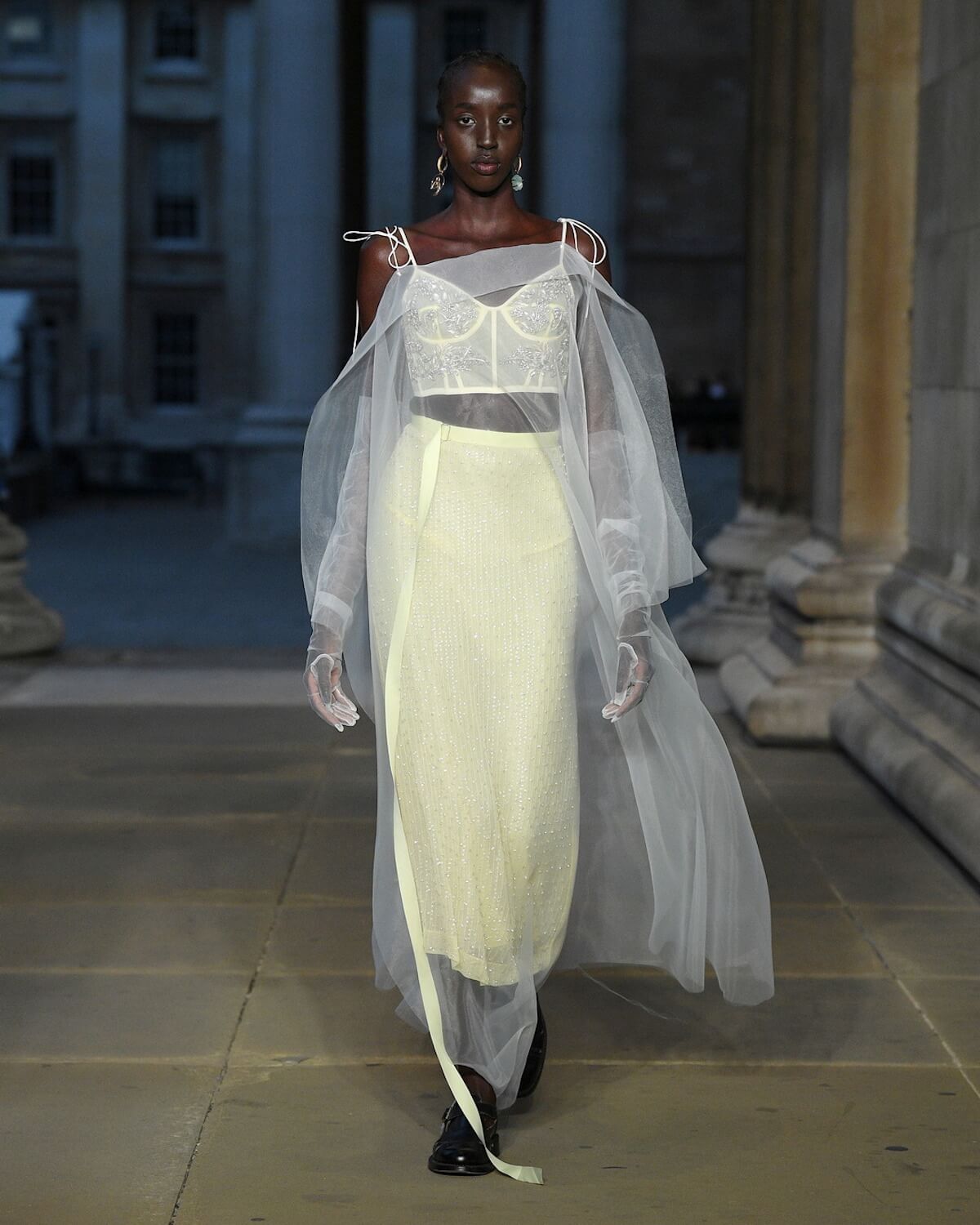 The designer also borrowed another idea from the conservation room. Inspired by the sheer voile shrouds used to protect precious pieces, he created ghost-like capes and veils for his pieces. It lent a sense of drama and ceremony to show and added to the heirloom effect. Who knows – some of these beautifully worked pieces may well be the museum pieces of the future.