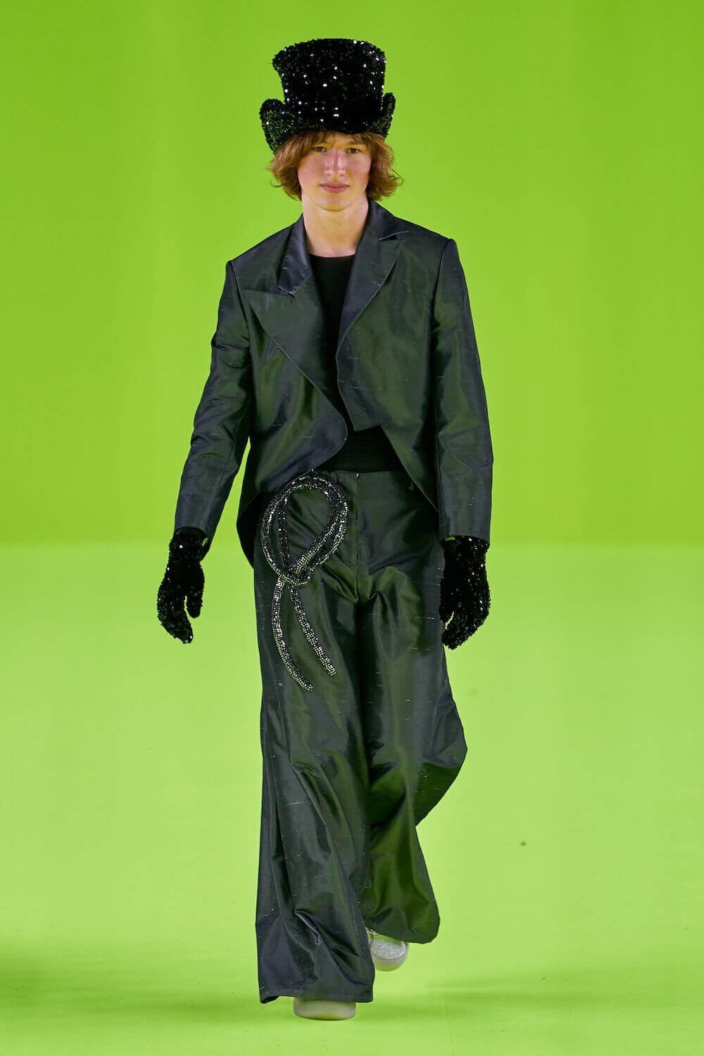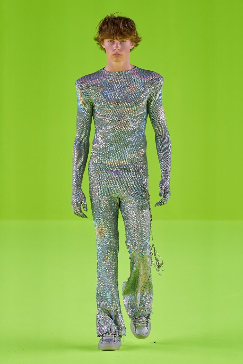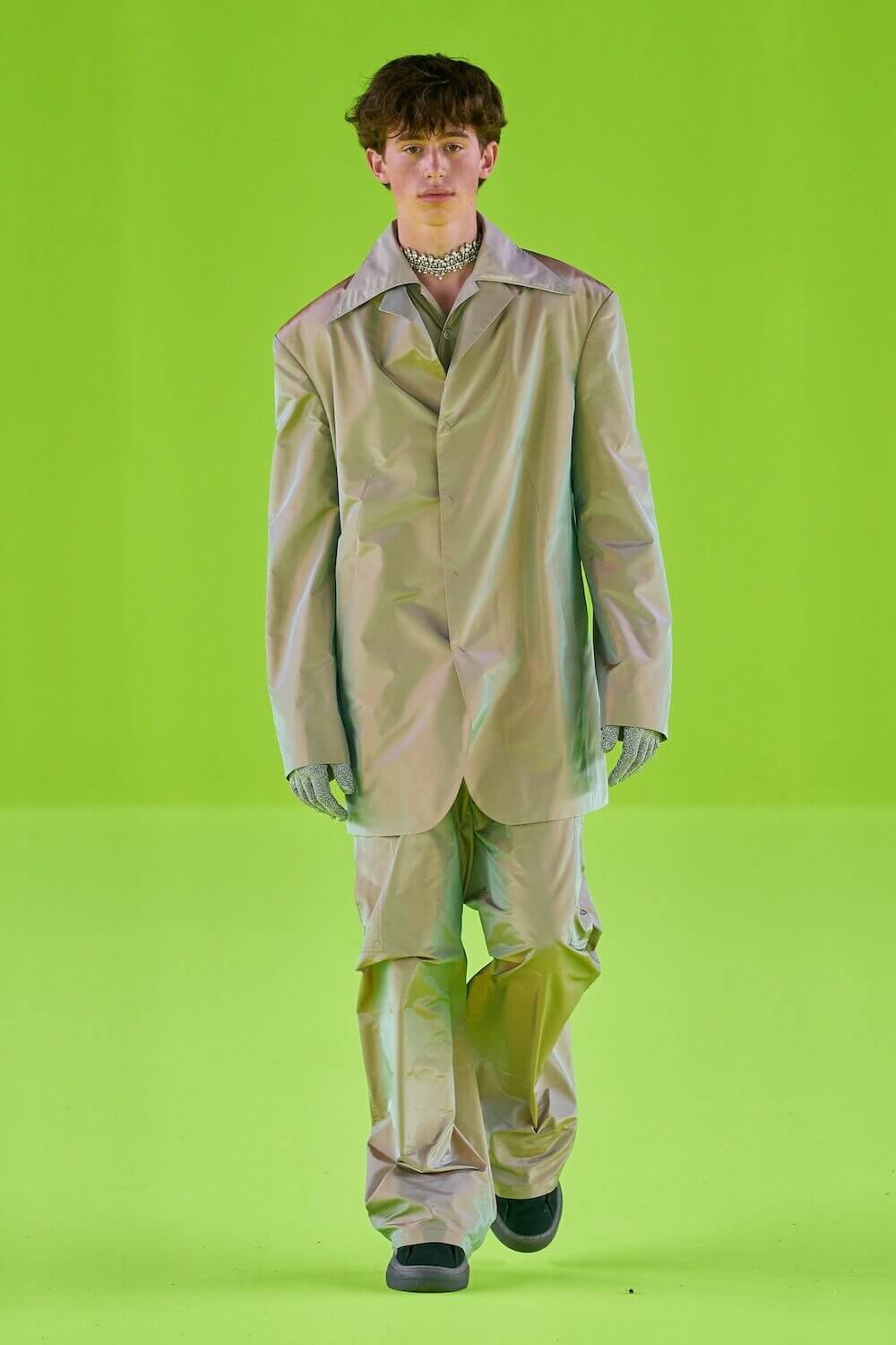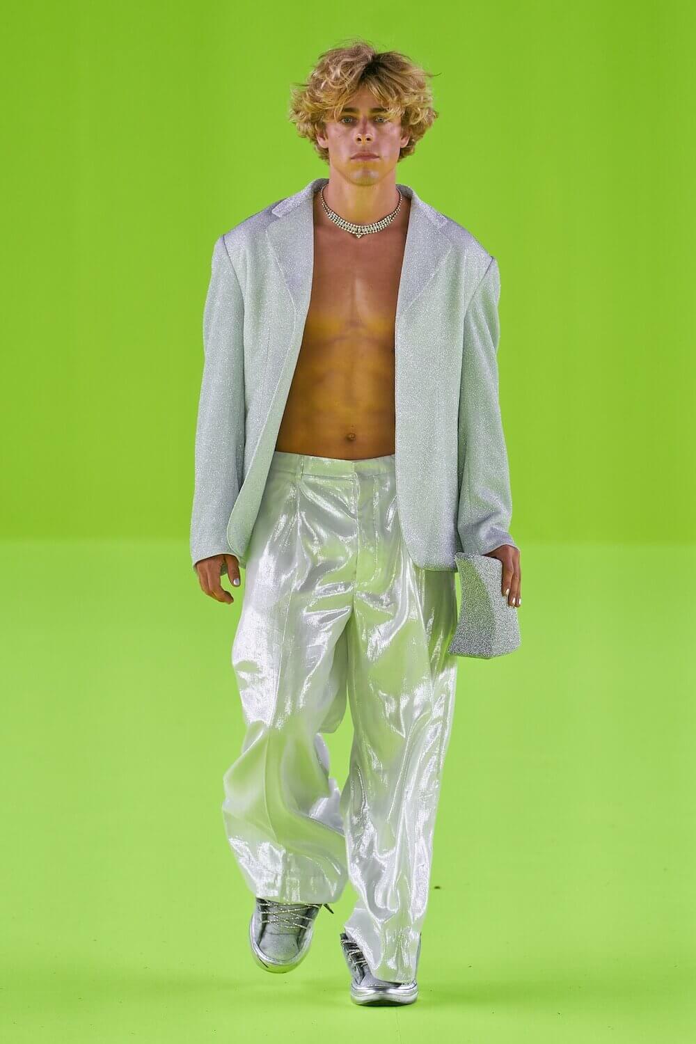 For the first time, he brought his own, distinct take on the American Dream to an international stage. As this season’s guest designer at Pitti Uomo, he staged his first standalone catwalk show in the courtyard of Palazzo Corsini, constructing a tennis green box that dripped in UV lights, which felt a bit like being inside a giant sun bed. Set in the year 2176, the collection saw Linnetz devise a plot around Florence being sunk underwater, with California skaters flocking to the city to chase the waves. Once arriving, they raided a lavish Ambassador’s closet during a swanky evening ‘do they crashed, nicking a load of family heirlooms, antiques. souvenirs and opulent togs. With a strong focus on louche tailoring, sun-kissed models charged to “Boys of Summer” clad in swollen suits with exaggerated clown collars, shiny, armour-inspired jackets and sparkly wide-cut trousers that borrowed their shape from the brand’s collaborative collection with Dior Men last year. A glitter-laden toga get-up inspired by the Statue of Liberty summed up the collection with a wink and a nudge – all proving cleverly ironic and thoroughly entertaining.