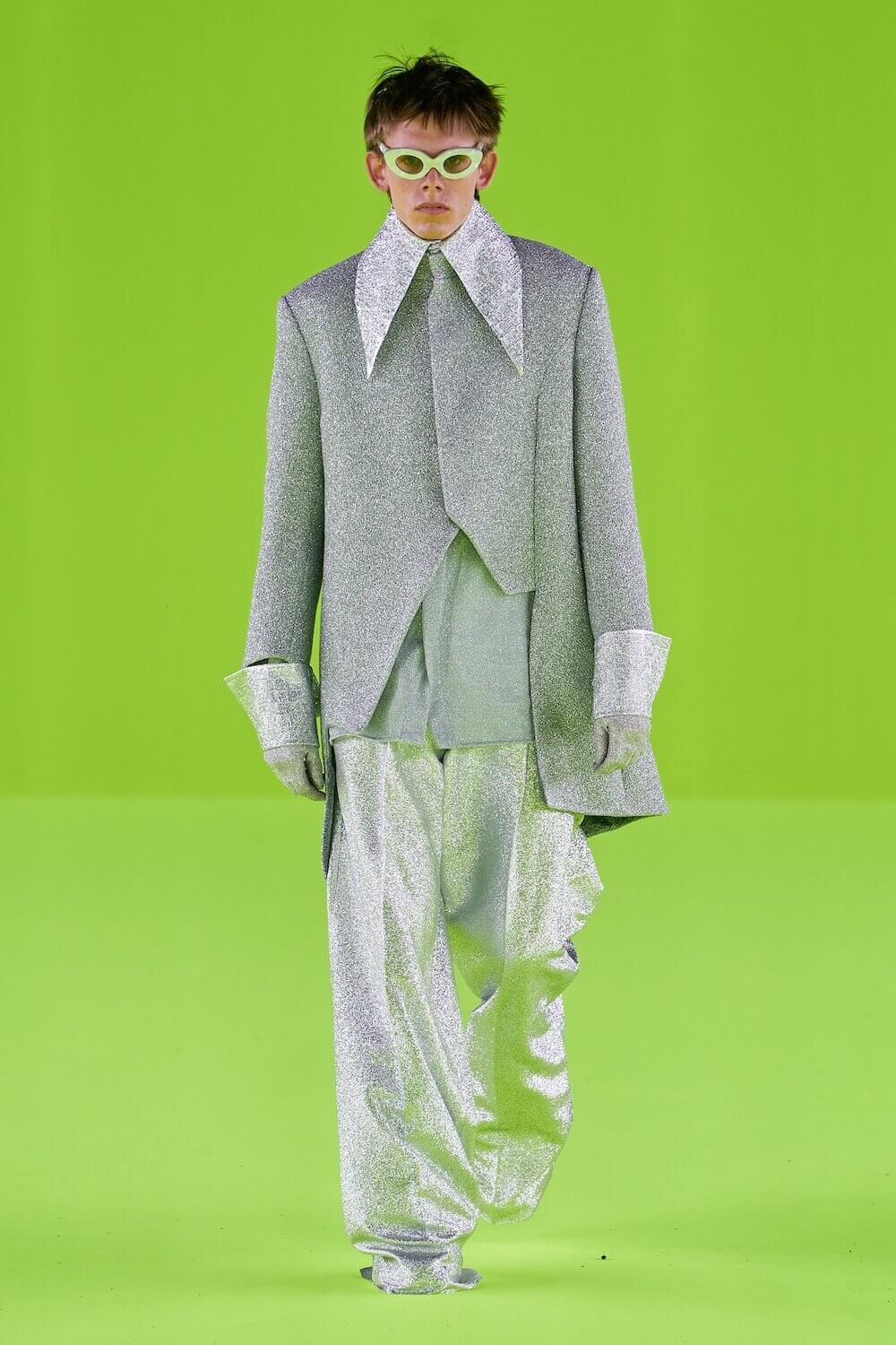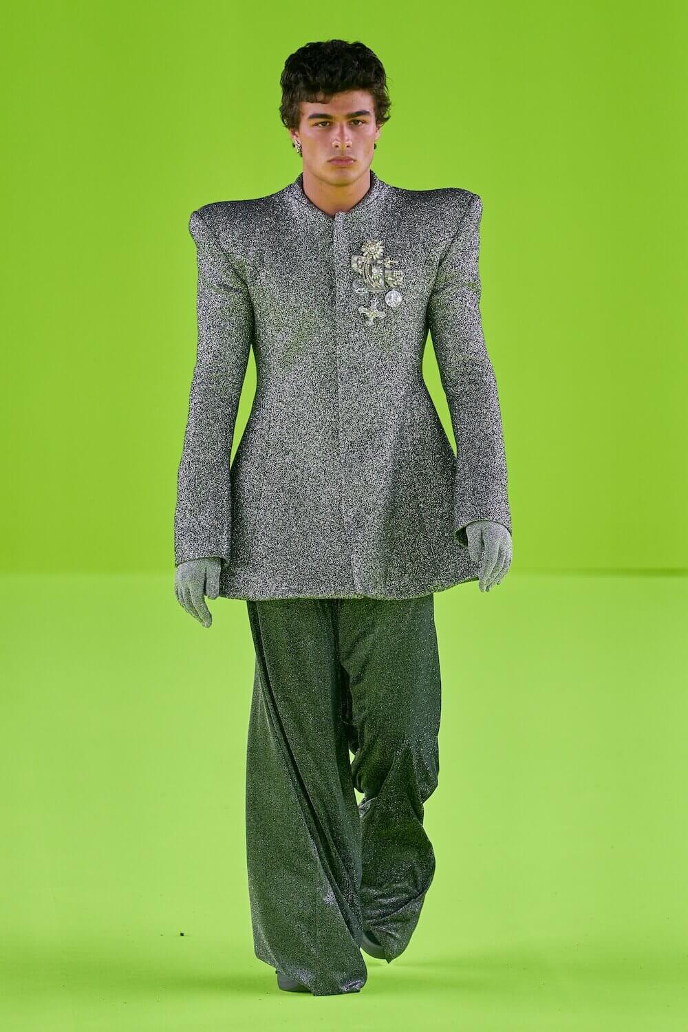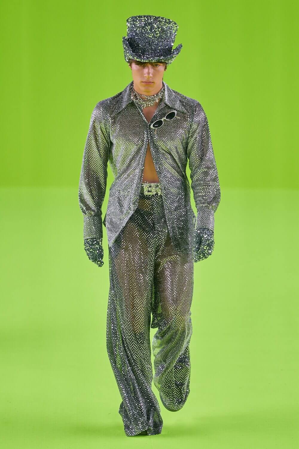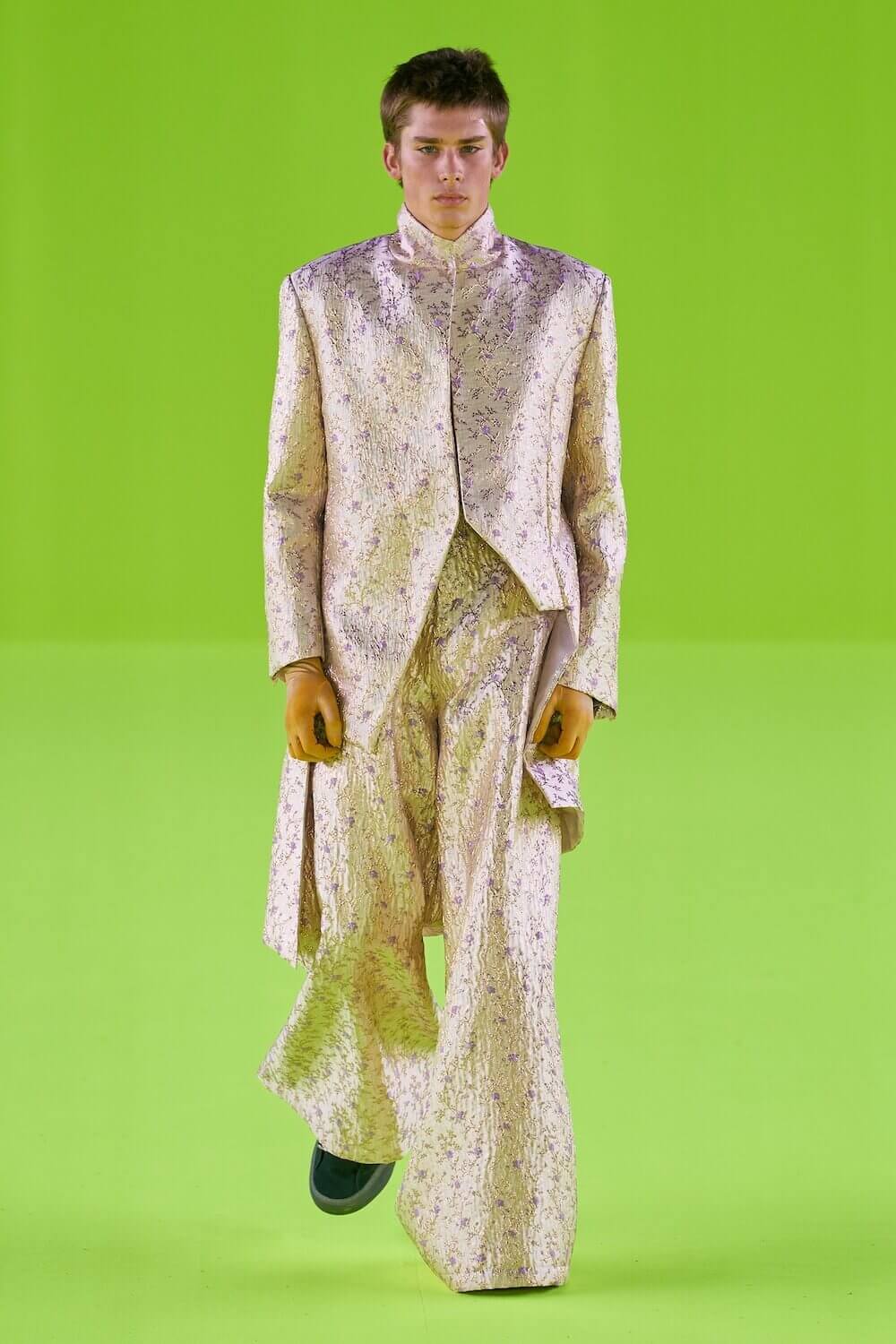 For the first time, he brought his own, distinct take on the American Dream to an international stage. As this season’s guest designer at Pitti Uomo, he staged his first standalone catwalk show in the courtyard of Palazzo Corsini, constructing a tennis green box that dripped in UV lights, which felt a bit like being inside a giant sun bed. Set in the year 2176, the collection saw Linnetz devise a plot around Florence being sunk underwater, with California skaters flocking to the city to chase the waves. Once arriving, they raided a lavish Ambassador’s closet during a swanky evening ‘do they crashed, nicking a load of family heirlooms, antiques. souvenirs and opulent togs. With a strong focus on louche tailoring, sun-kissed models charged to “Boys of Summer” clad in swollen suits with exaggerated clown collars, shiny, armour-inspired jackets and sparkly wide-cut trousers that borrowed their shape from the brand’s collaborative collection with Dior Men last year. A glitter-laden toga get-up inspired by the Statue of Liberty summed up the collection with a wink and a nudge – all proving cleverly ironic and thoroughly entertaining.