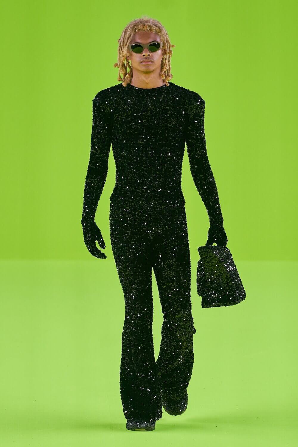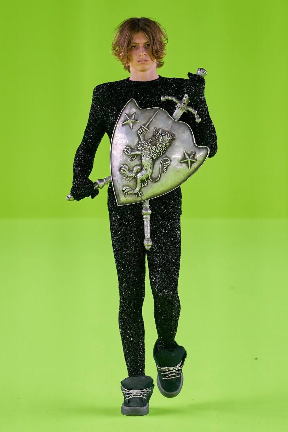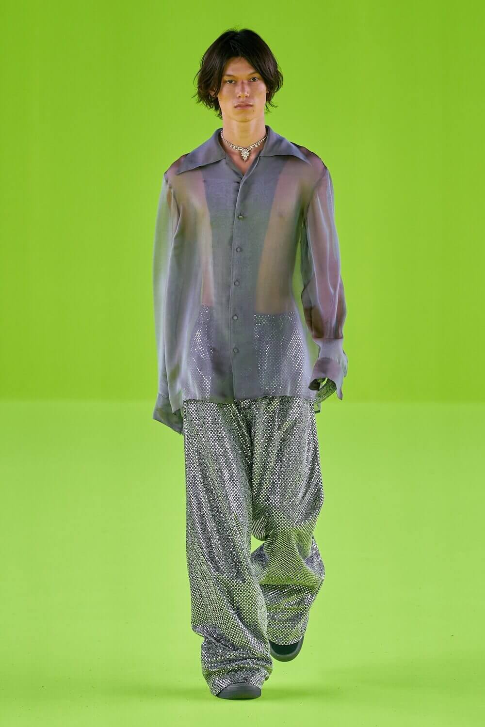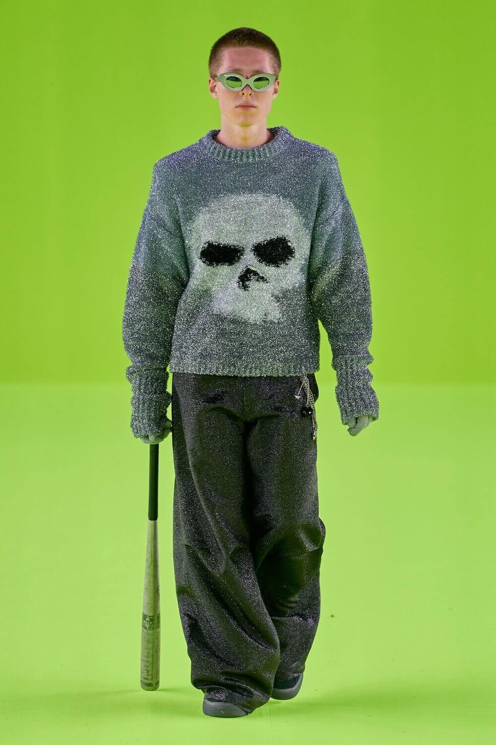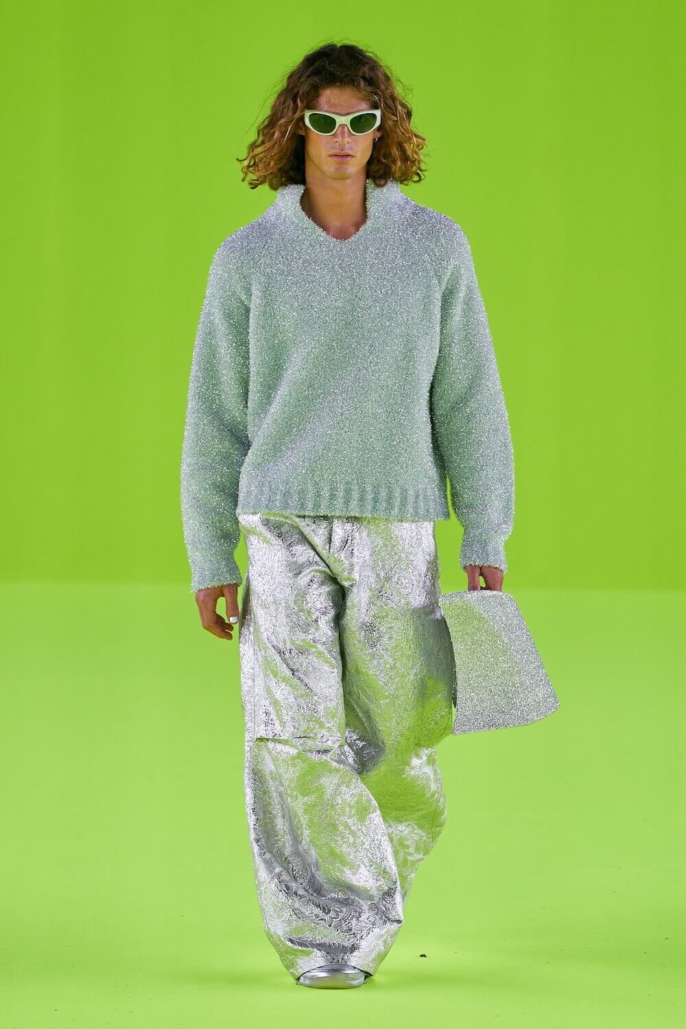 For the first time, he brought his own, distinct take on the American Dream to an international stage. As this season’s guest designer at Pitti Uomo, he staged his first standalone catwalk show in the courtyard of Palazzo Corsini, constructing a tennis green box that dripped in UV lights, which felt a bit like being inside a giant sun bed. Set in the year 2176, the collection saw Linnetz devise a plot around Florence being sunk underwater, with California skaters flocking to the city to chase the waves. Once arriving, they raided a lavish Ambassador’s closet during a swanky evening ‘do they crashed, nicking a load of family heirlooms, antiques. souvenirs and opulent togs. With a strong focus on louche tailoring, sun-kissed models charged to “Boys of Summer” clad in swollen suits with exaggerated clown collars, shiny, armour-inspired jackets and sparkly wide-cut trousers that borrowed their shape from the brand’s collaborative collection with Dior Men last year. A glitter-laden toga get-up inspired by the Statue of Liberty summed up the collection with a wink and a nudge – all proving cleverly ironic and thoroughly entertaining.