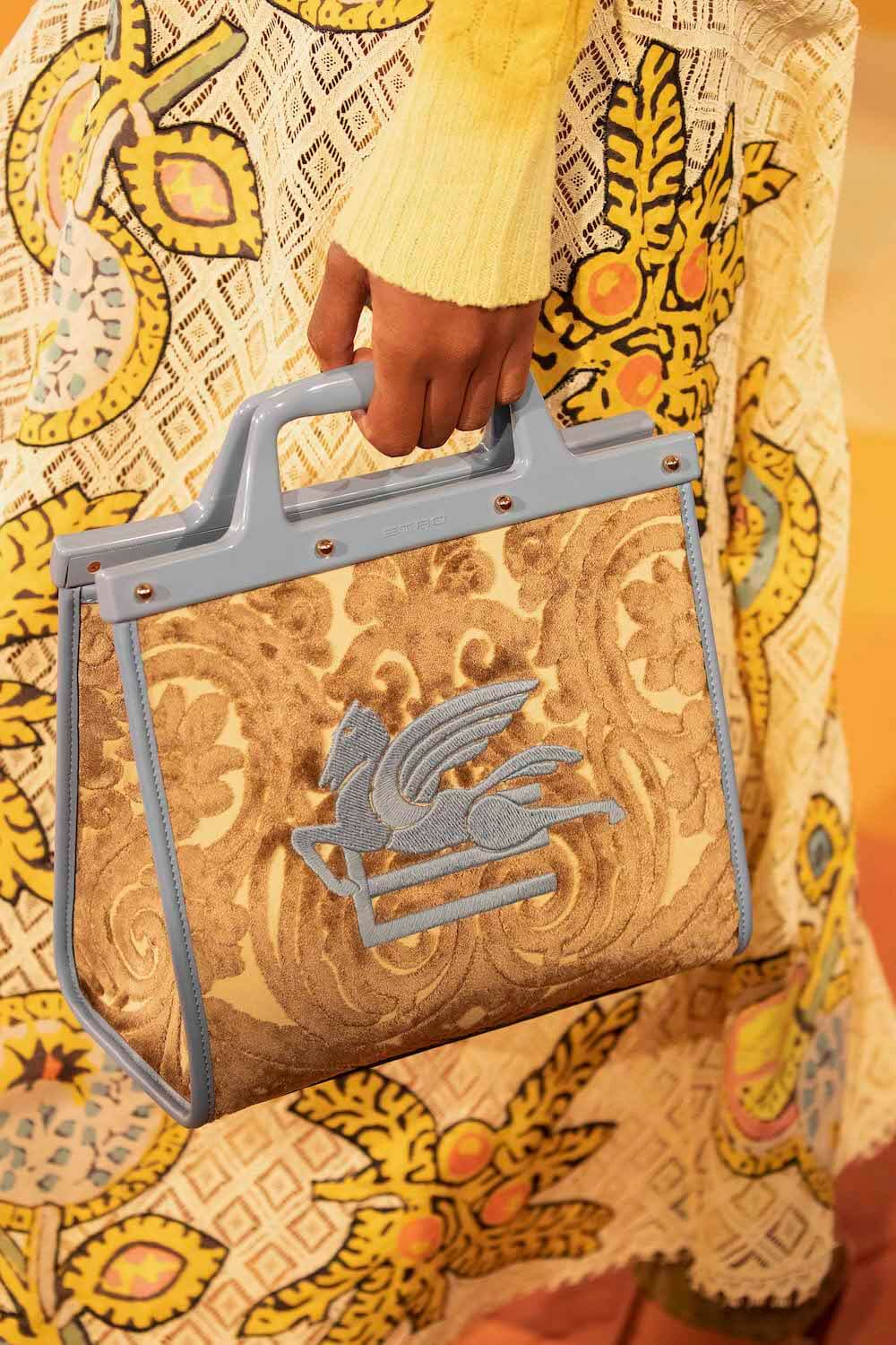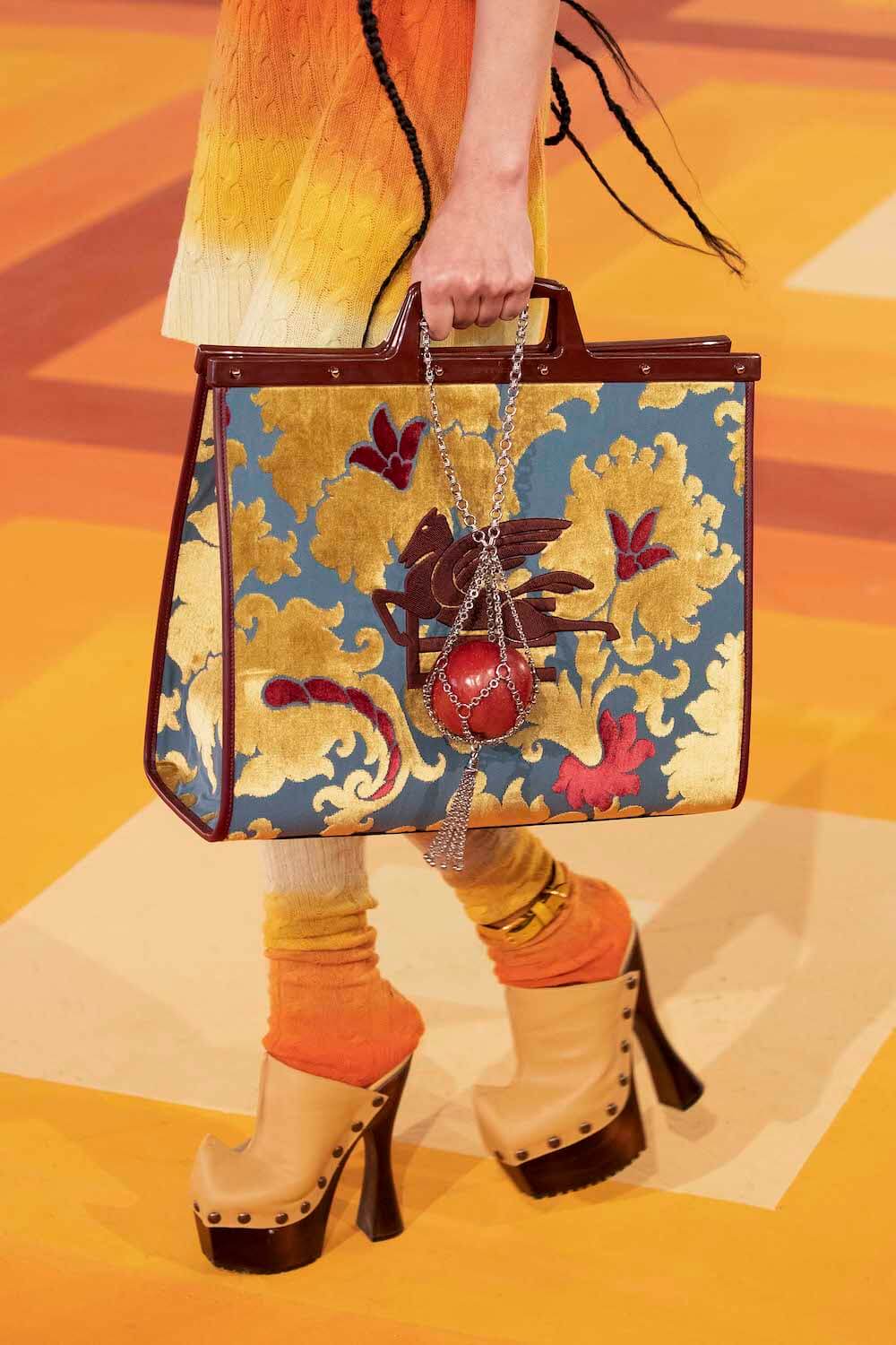 The premium fabrics that captivated De Vincenzo – some of which were from Etro’s home collections – dazzled with curling paisley prints and soft fern visuals, Little House on the Prairie vibes and irrefutable folk influences. Brimming with velveteen brocades and embroidered denims, twill, canvas and leather, it was all very sumptuous and very Etro – a more youthful interpretation of its iconic radically romantic, fringed gypsy look. But despite the malleable conviction of the bag, it boasts a sturdy frame rendered in colourful recycled plastics. The logoed handle and infrastructural boning together create a trapezoidal compartment.