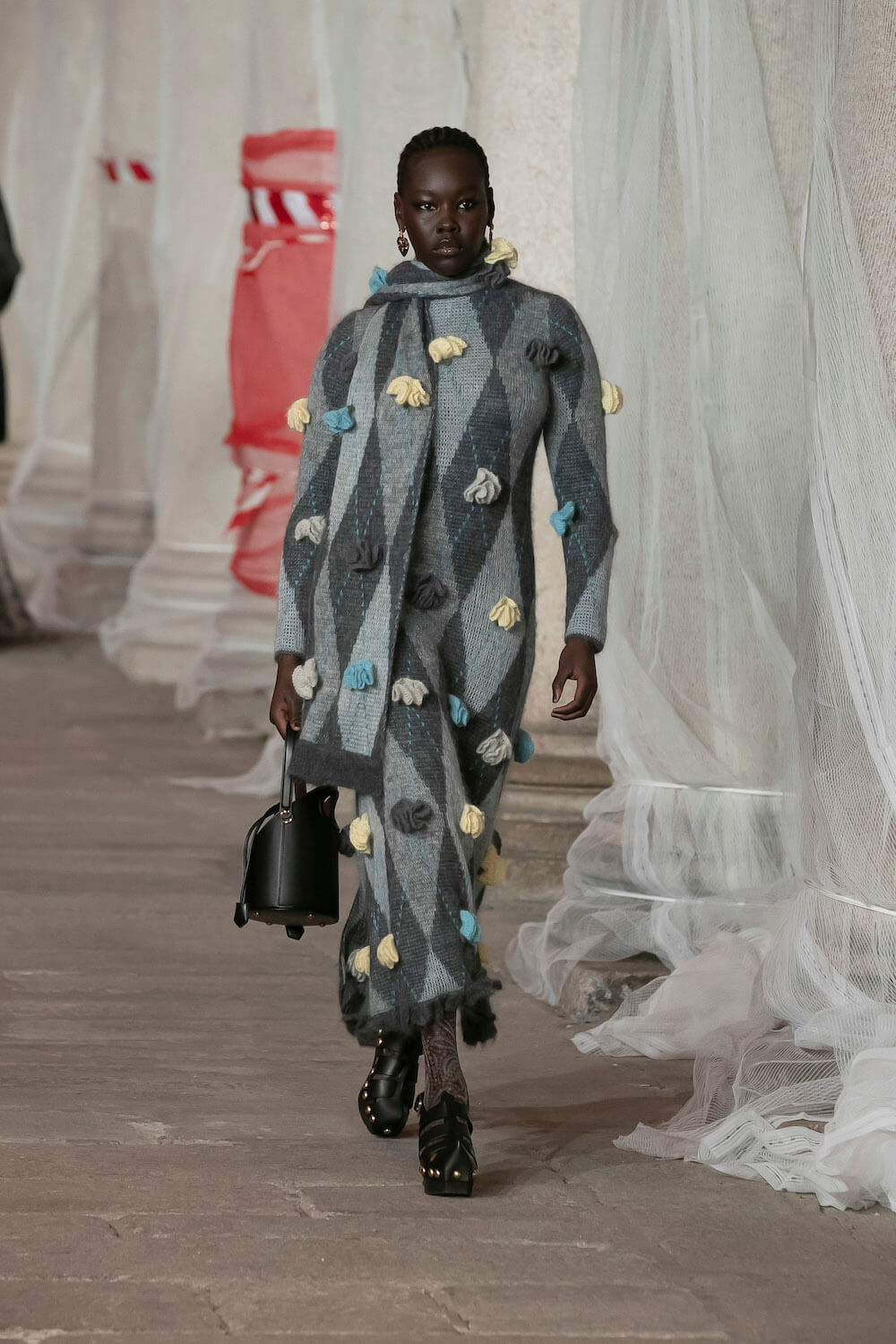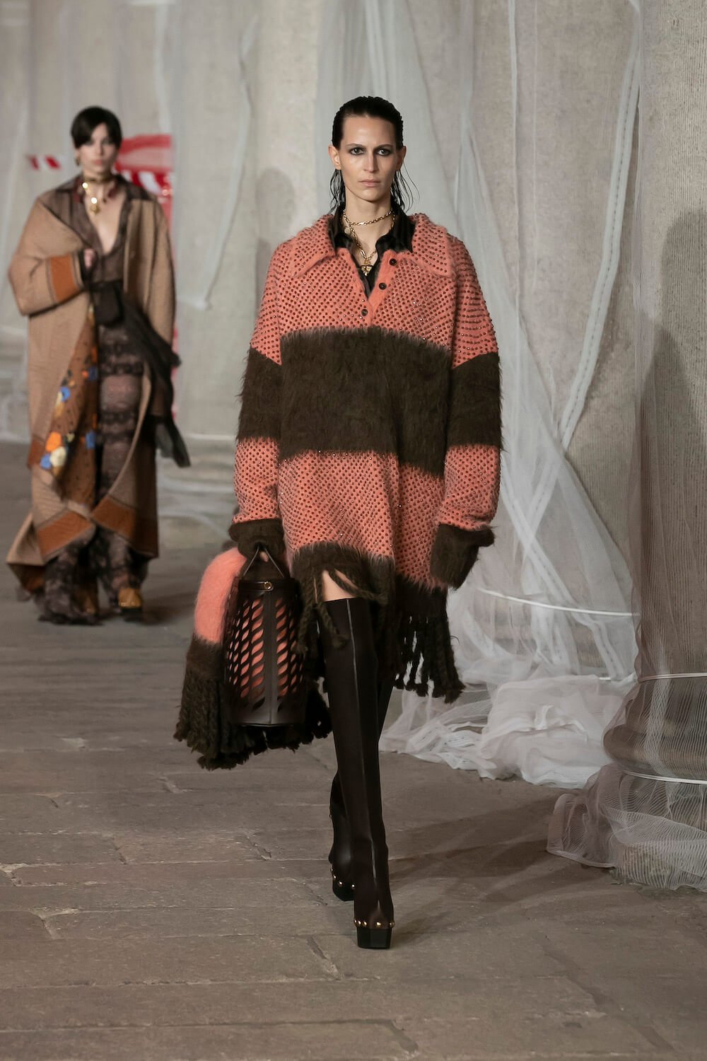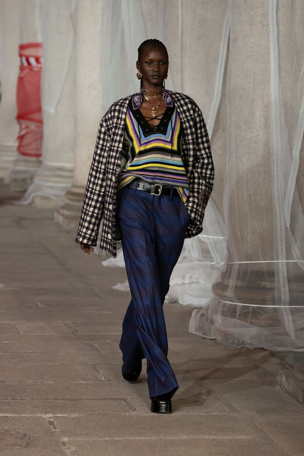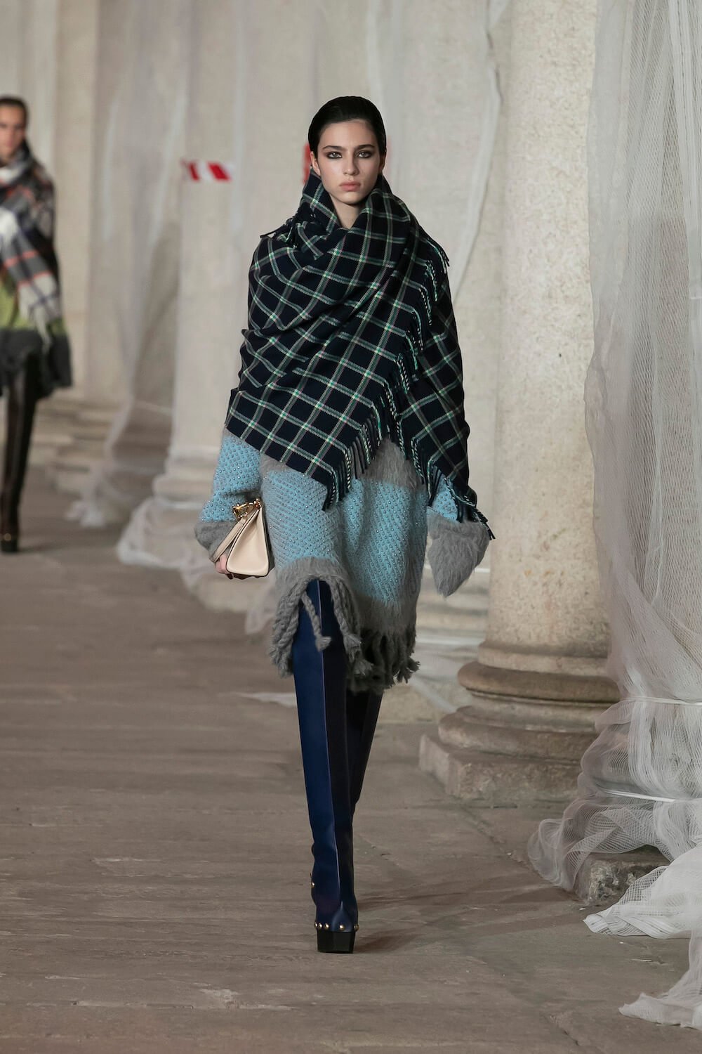 Marching through an historic palazzo unmade into a construction zone – a physical manifestation of De Vincenzo’s radical exploration of the atelier – all the usual Etro fixings appeared at the AW23 show. Tartans, paisley and cravatteria motifs covered long flowing dresses and flouncy, frilled little numbers were paired with drooping, chunky argyle knits. Elsewhere genderless vests and matching trousers were percolated by billowing silk blouses. Opulent tailoring in beautiful brocards, slim pantsuits with elongated tailcoats and knit midi dresses swathed by checkered blankets were worn atop aladdin clogs that had been transformed into thigh-high boots and platform mary janes. Included in the collection came a triage of “Kind Knits”, striped jumpers that are part of a new, and expansive, see-now-buy-now upcycled capsule. This was a whole new kind of retro cool.
